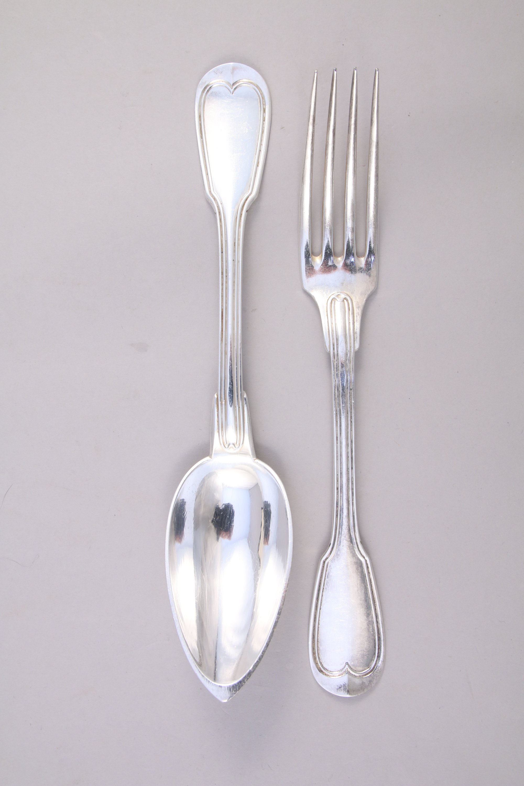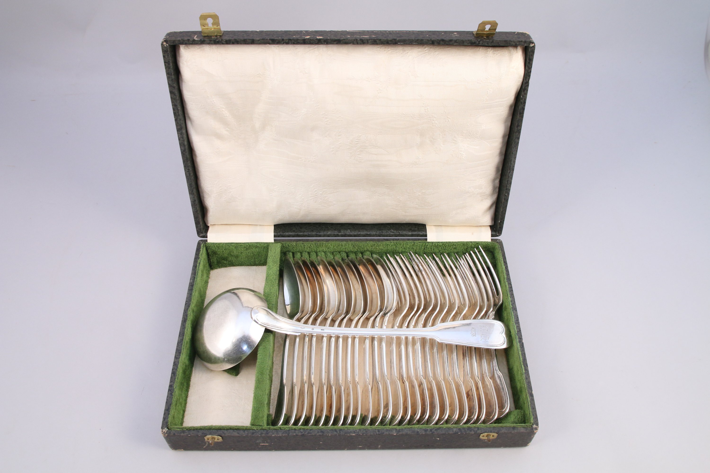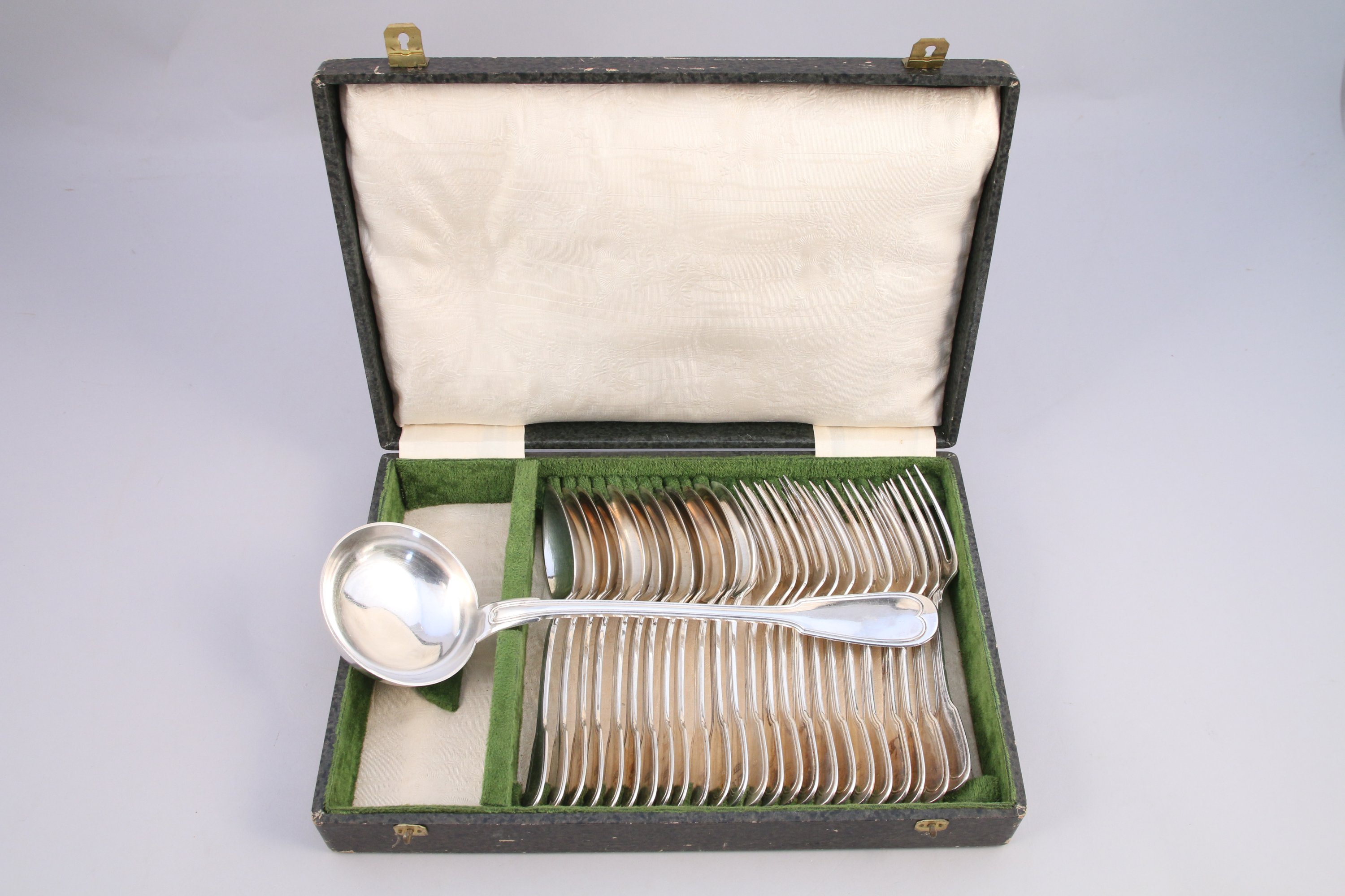 CHRISTOFLE MÉNAGÈRE de 25 pièces en métal argenté, modèle filet, les initiales sommées d'une couronne baronale, comprenant : 12 fourchettes, 12 cuillers, une louche.