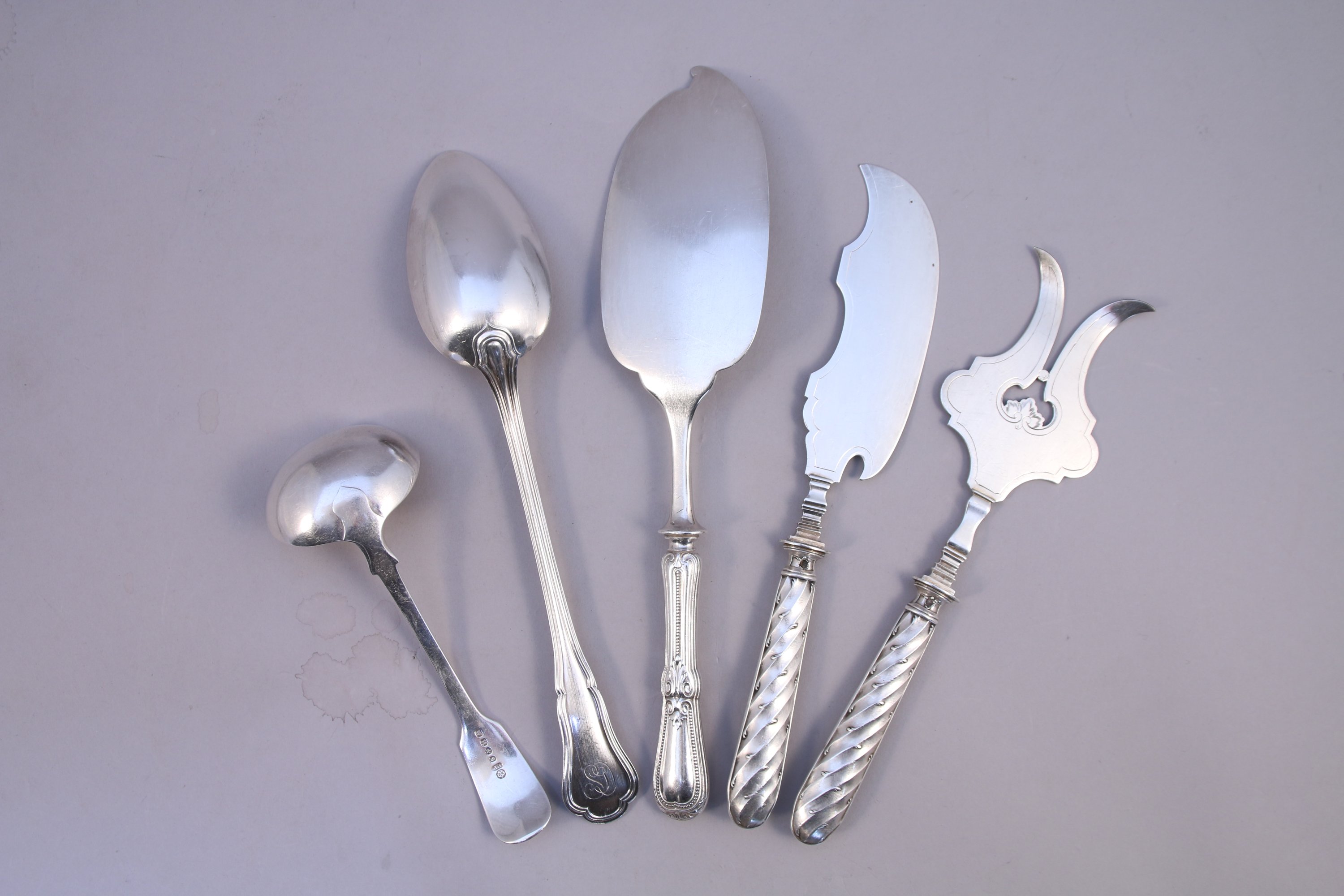 LOT de métal comprenant : une grande CUILLER Christofle, une PELLE à servir Chistofle, une CUILLER à sauce anglaise, une FOURCHETTE et PELLE à servir en métal gravé, ornées de volatiles les manches en argent fourré.