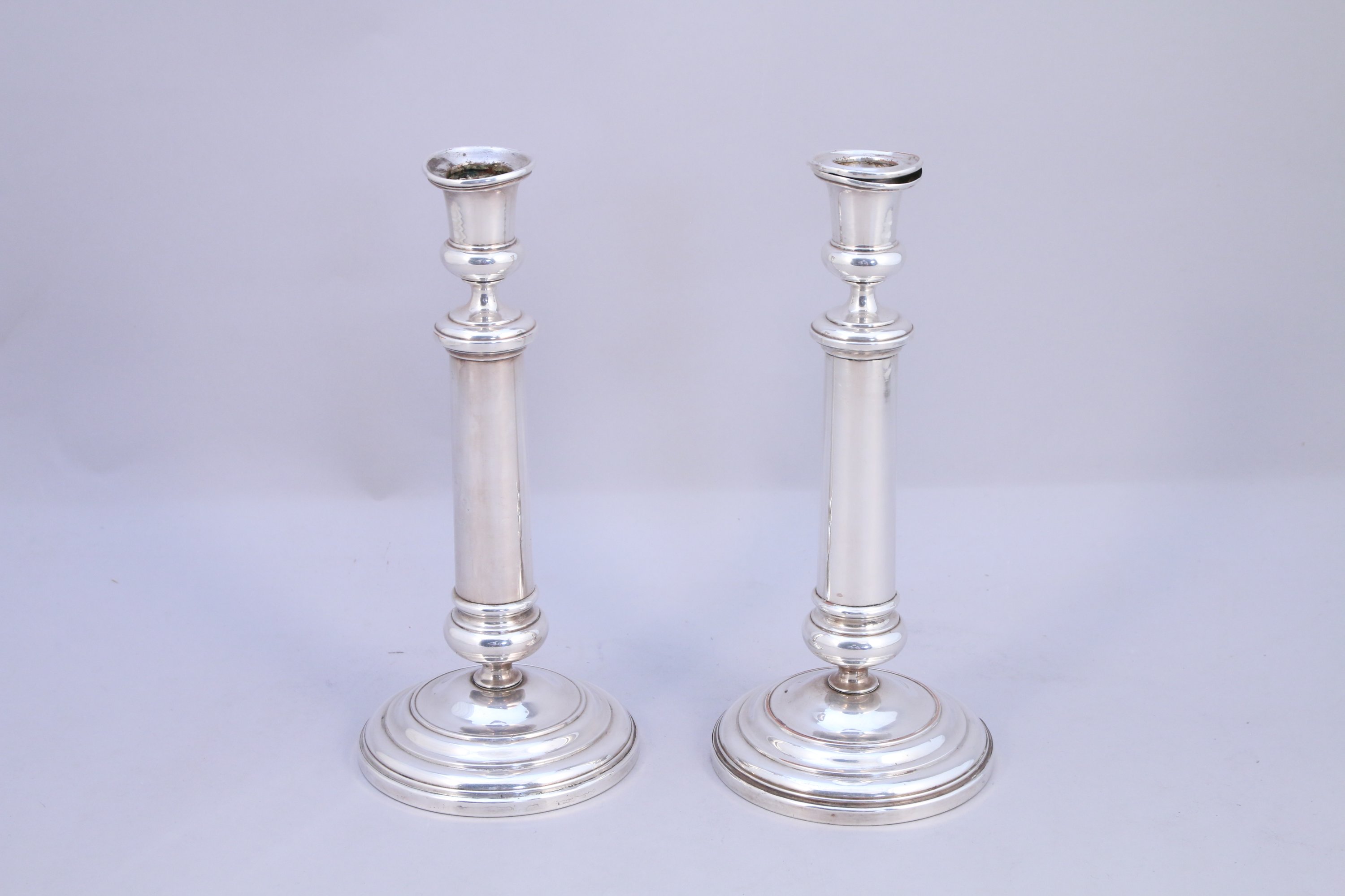 PAIRE de BOUGEOIRS en métal argenté, le binet en forme de vase médicis repose sur un piédouche. Le fût uni et mouluré, la base circulaire à doucine moulurée.