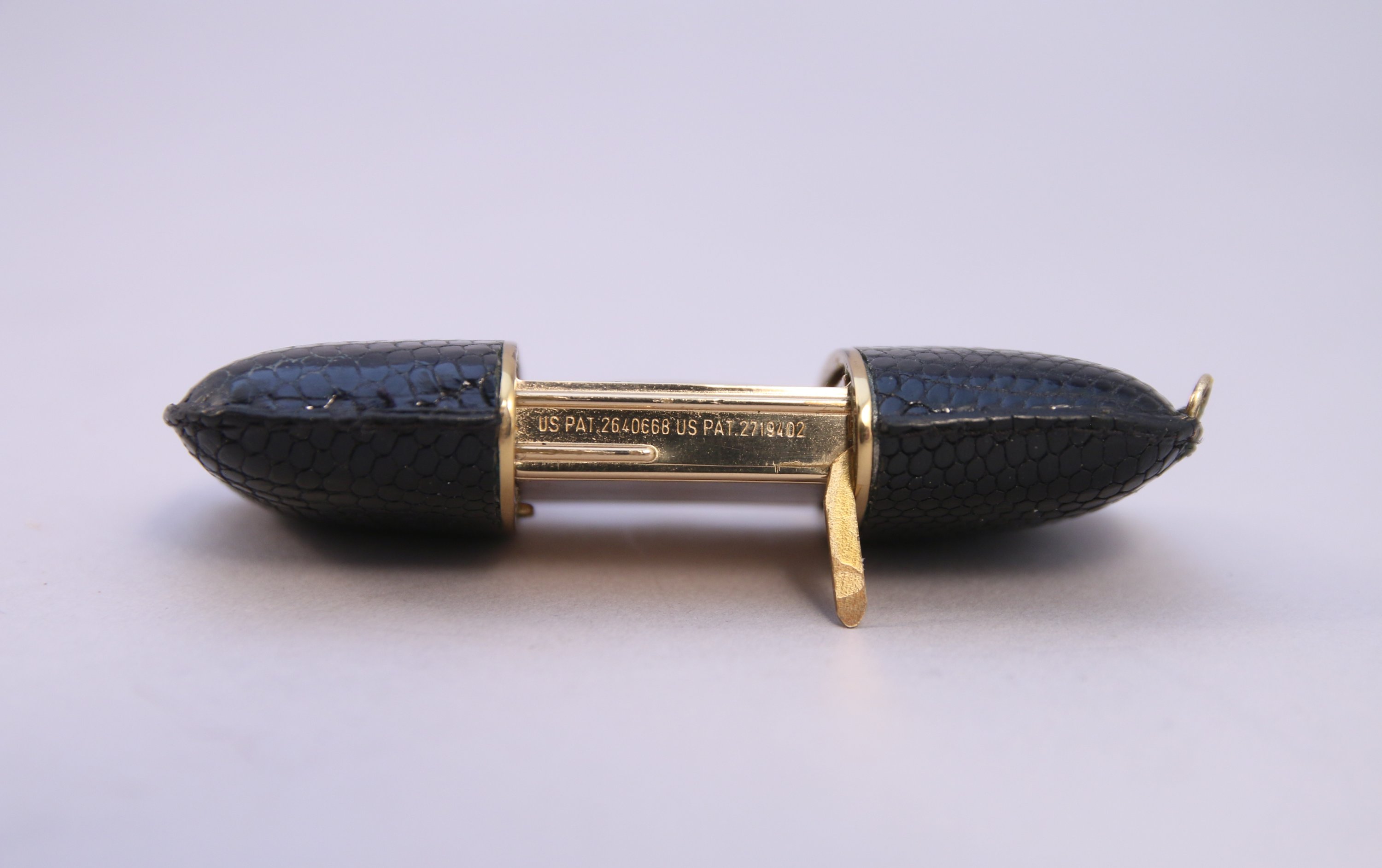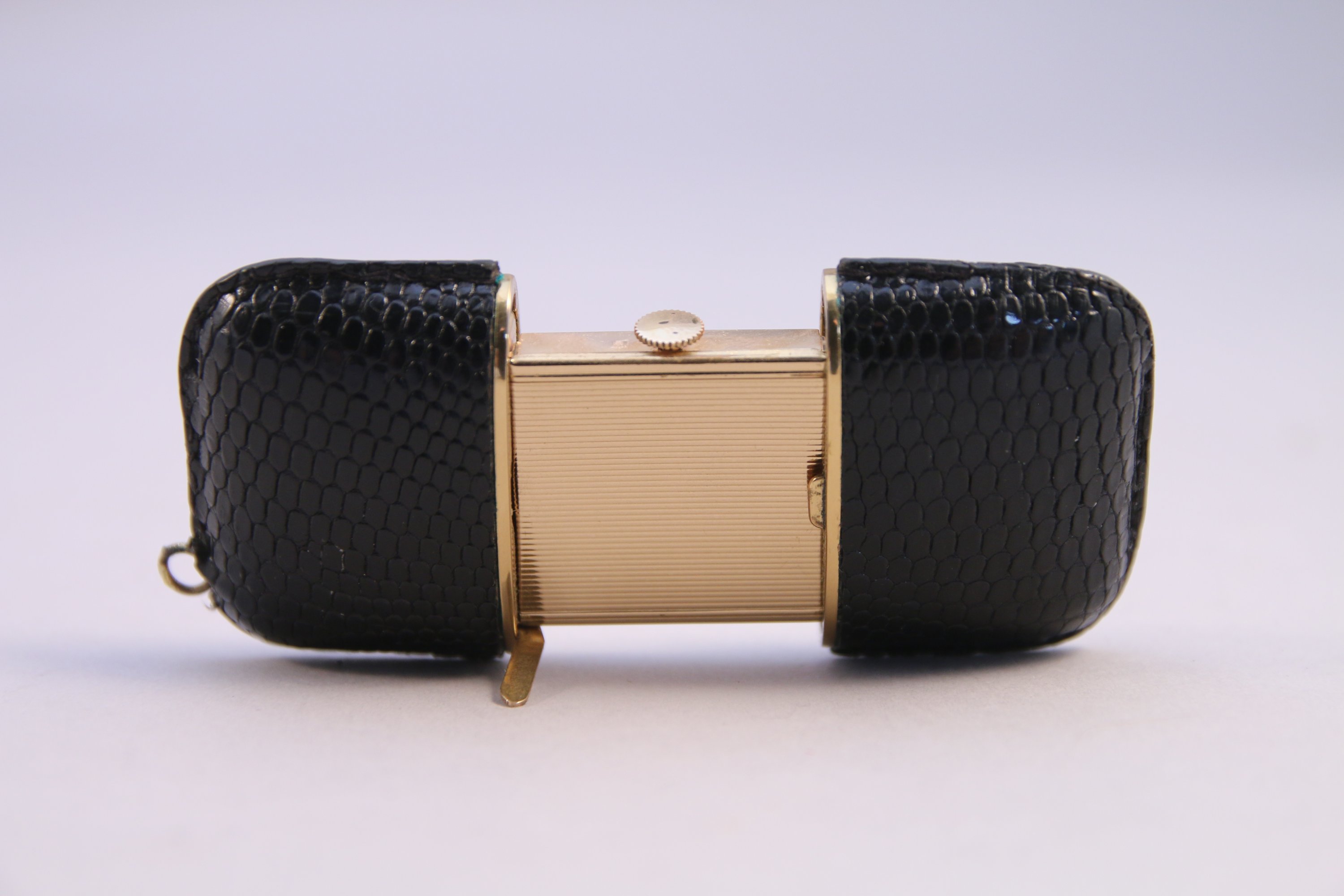 LANCEL. Horloge de voyage en métal doré dans un écrin rcouvert de cuir.