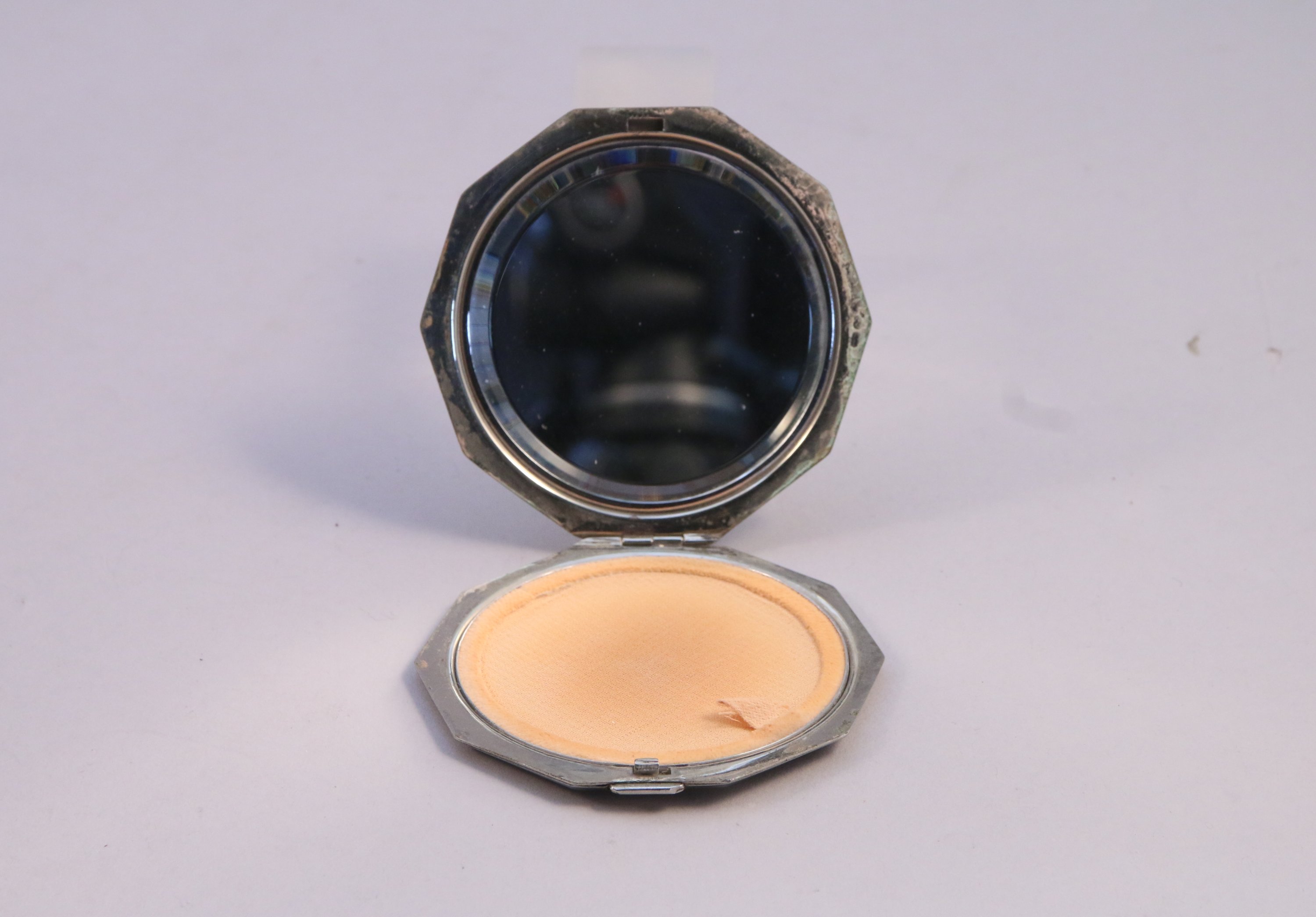 JOINT : une BOITE A FARD ornée d'une pierre bleue et un petit lot de PIECES ETRANGERES (principalement Espagne vers 1950).