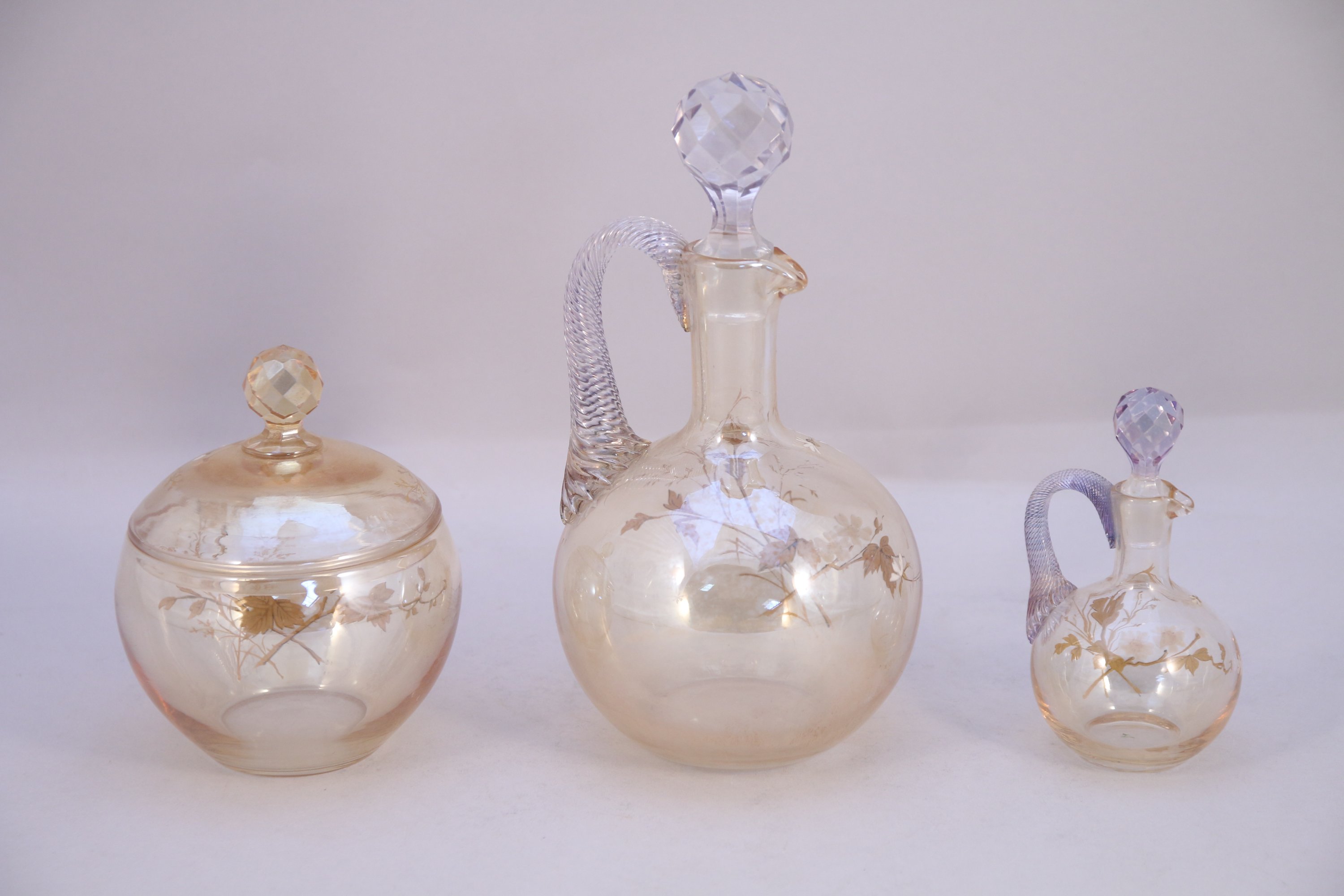 Deux CARAFES et une BONBONNIÈRE en verre fumé à décor émaillé et or de fleurs et feuillage. Bouchons facetés. Anses des carafes torsadées.