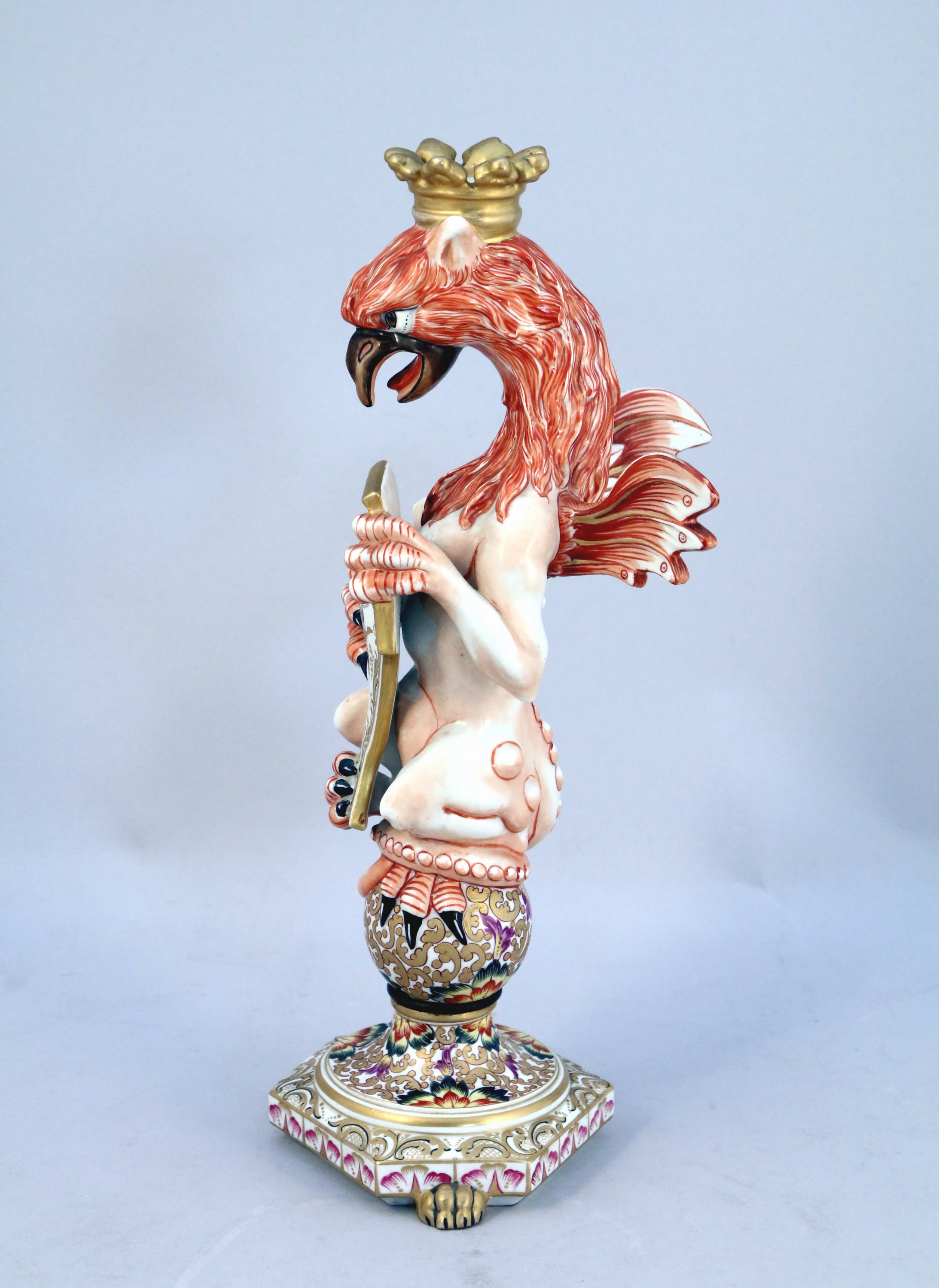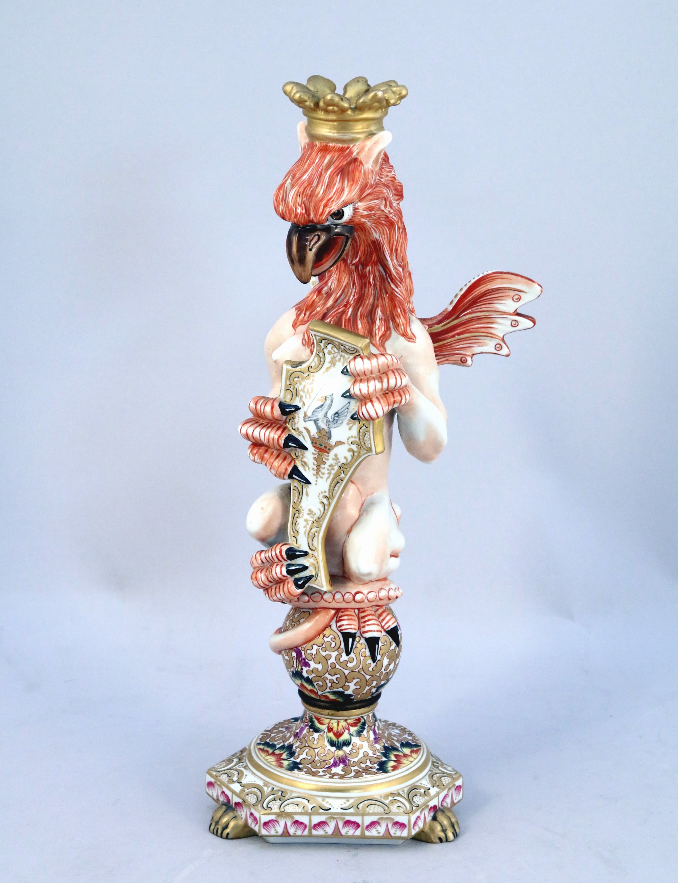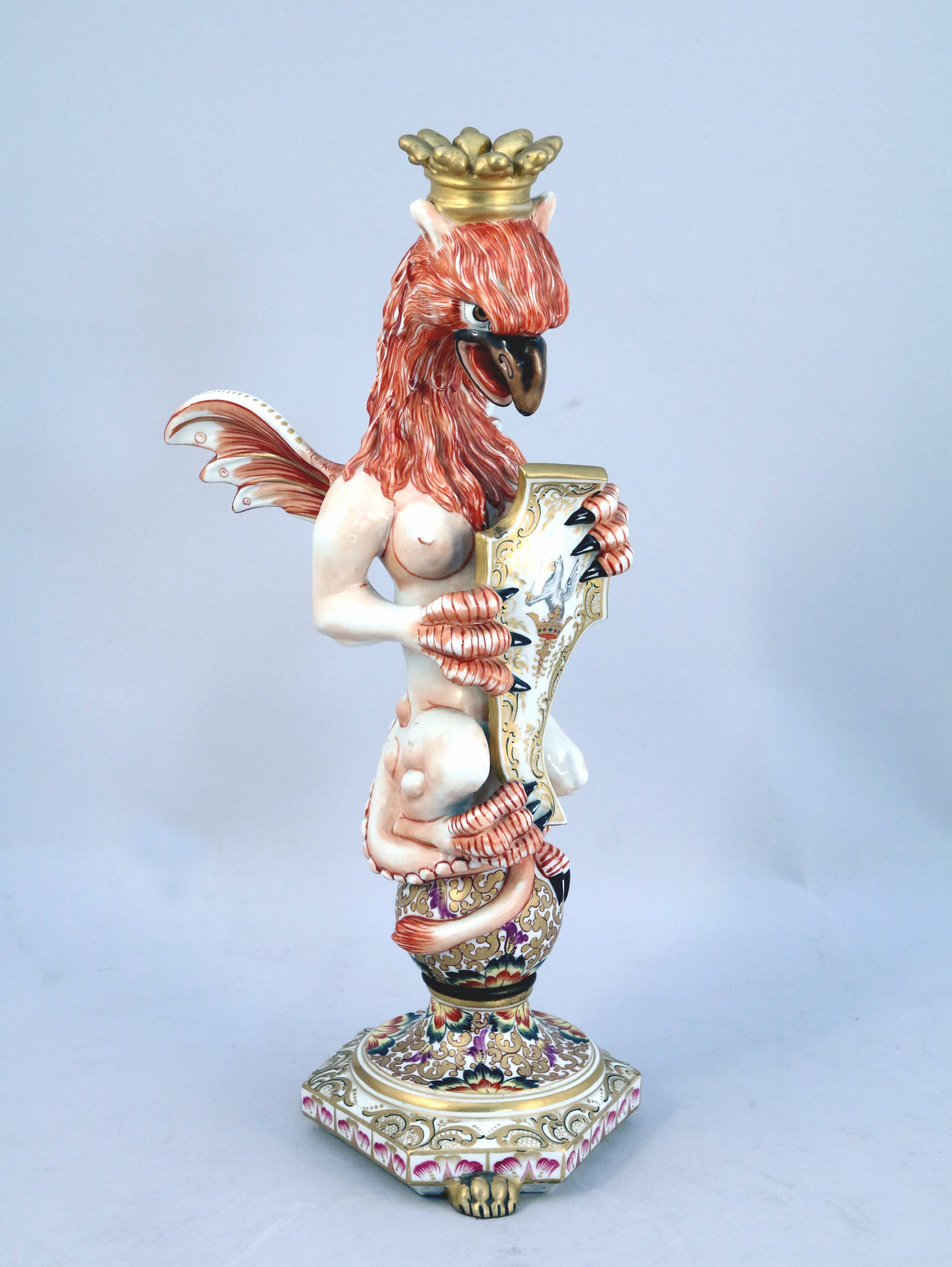 en porcelaine figurant une sphinge couronnée tenant dans ses pattes un blason, assis sur une sphère, base hexagonale reposant sur trois pieds griffes.