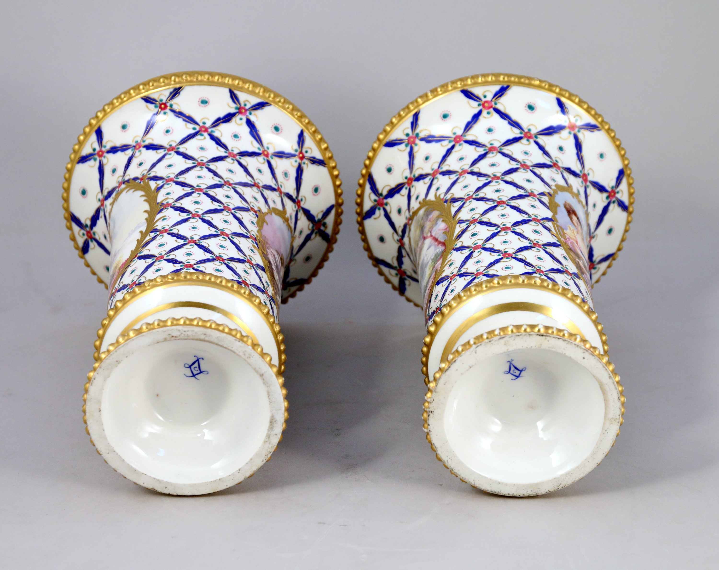 en porcelaine à décor polychrome et rehauts or au centre d'un paysage lacustre dans une réserve sur une face et d'un portrait de femme et son fils au panier d'oignons pour l'un et d'un portrait d'une femme et son fils au panier de figues et raisins pour l'autre. Les fonds à décor de croisillons et fleurettes.