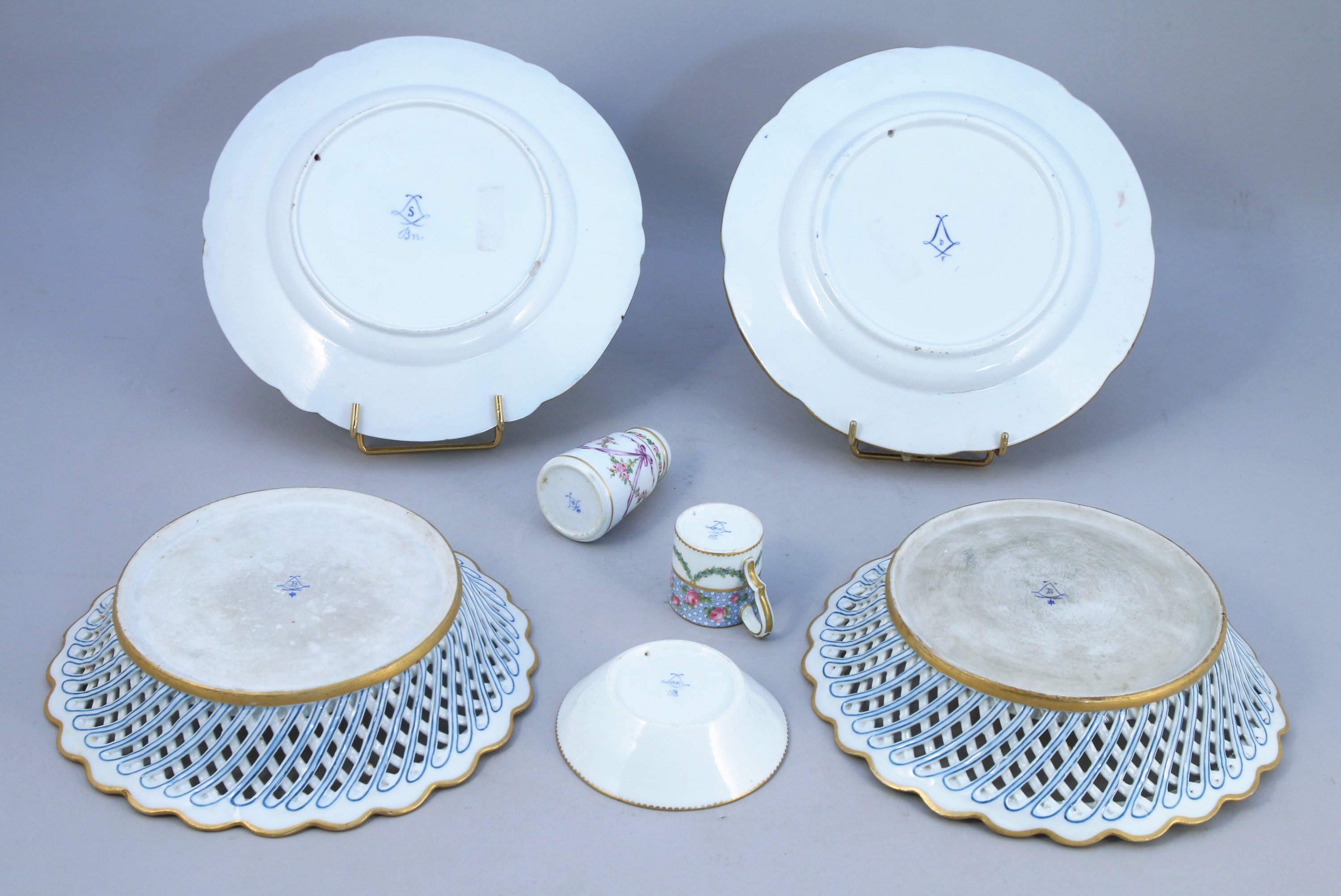 - Paire de CORBEILLES de forme contour à décor ajouré simulant la vannerie, le fond et la bordure à décor polychrome et or de fleurs et noeuds de rubans. Marque apocryphe de Sèvres, début XXe.