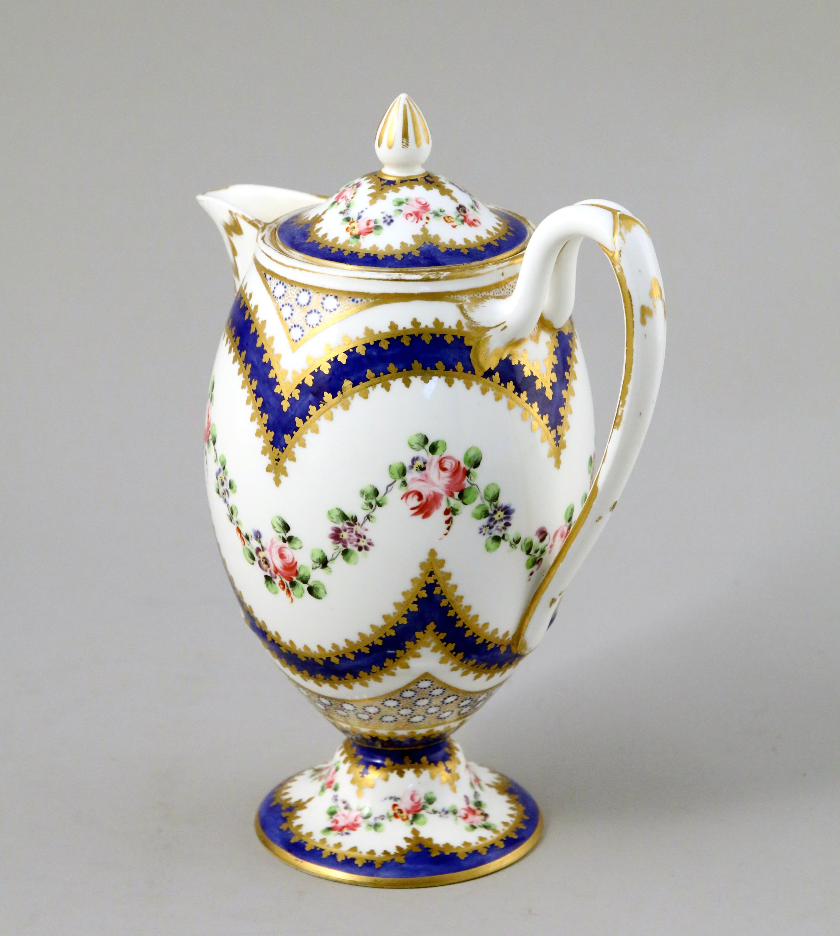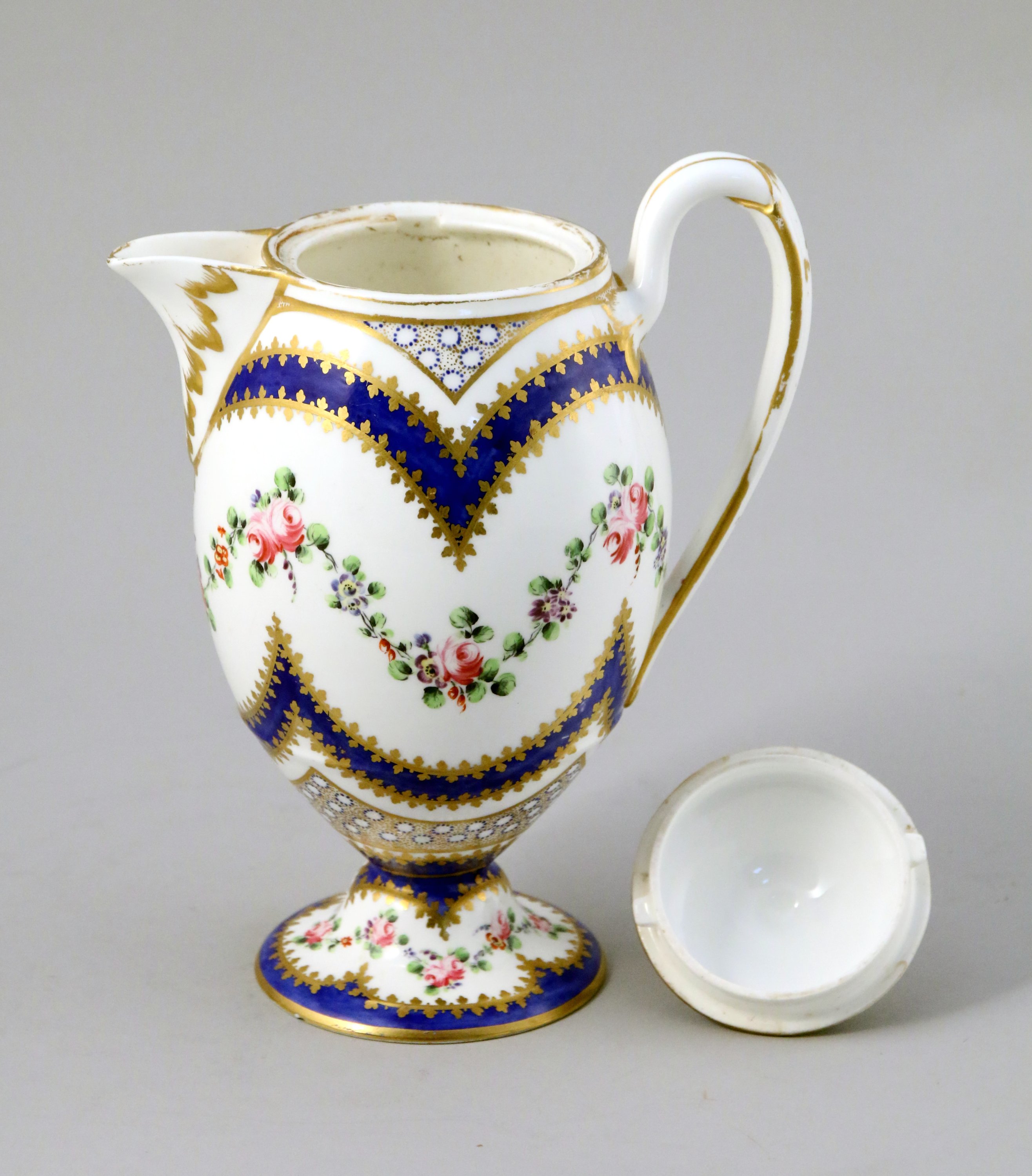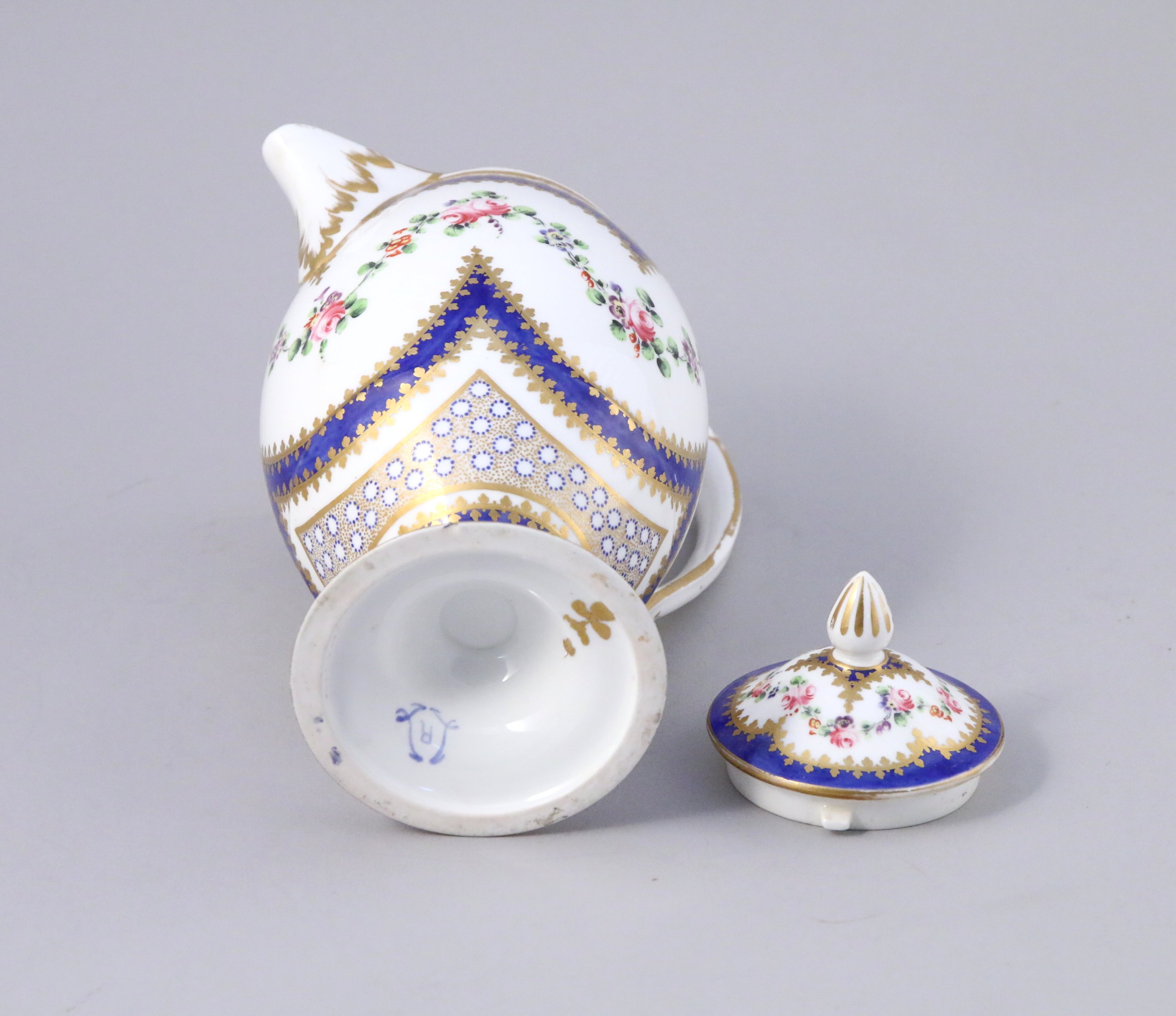 THÉIÈRE en porcelaine de forme balustre reposant sur un piédouche. Elle reçoit un décor sur fond blanc d'une guirlande de fleurs polychromes et de réserves bleue et or. Couvercle surmonté d'un frétel en forme de toupie.