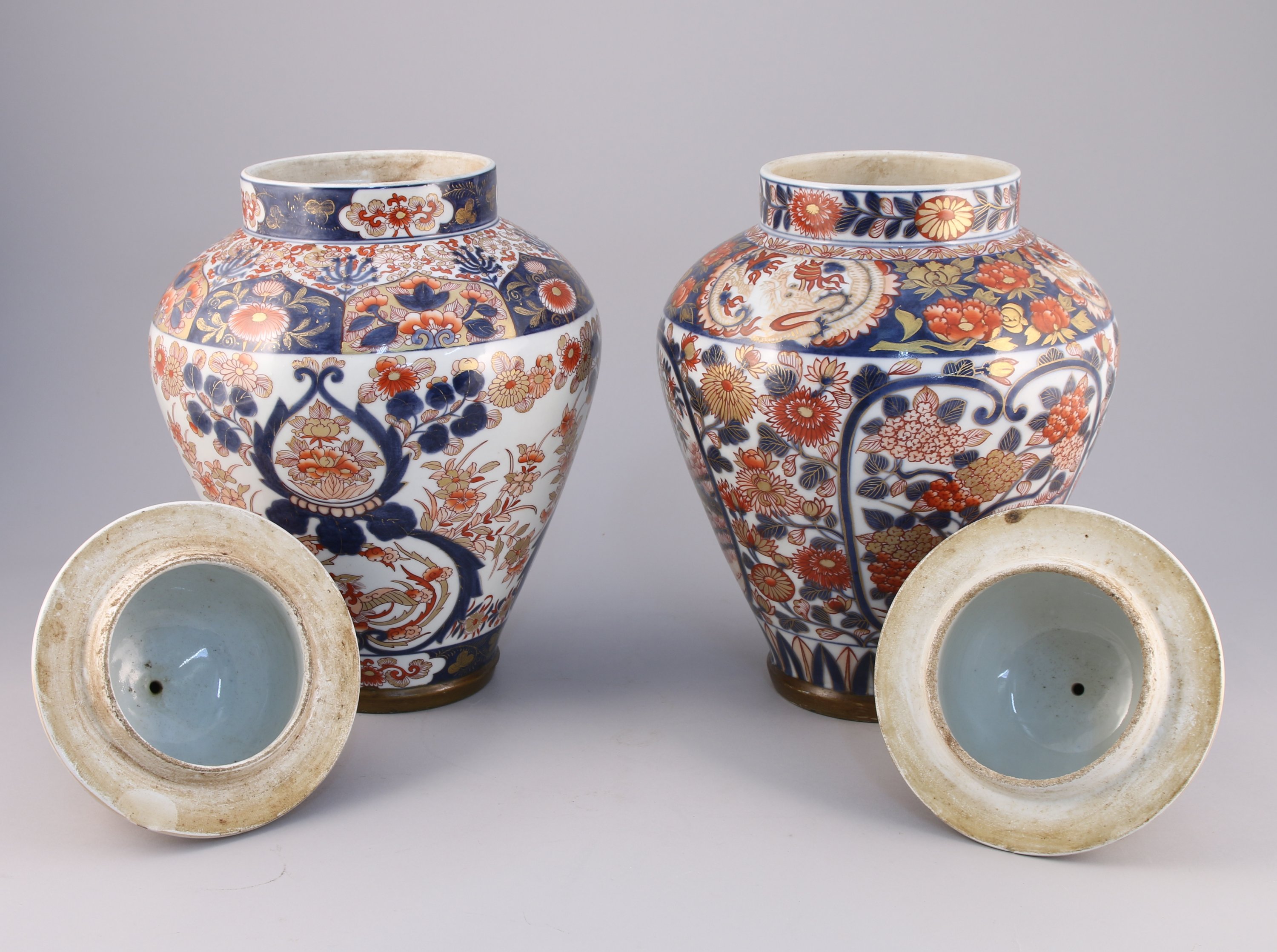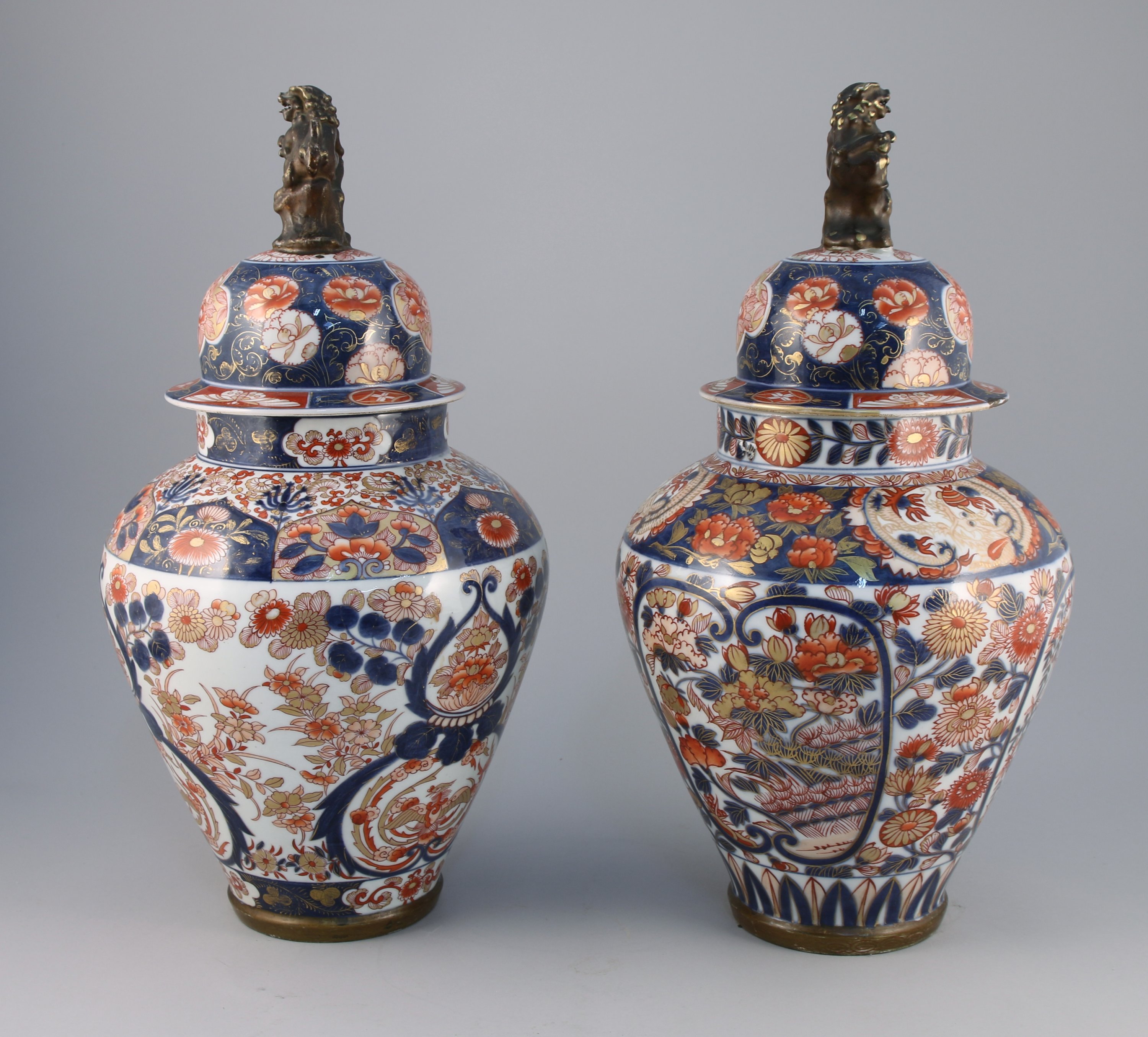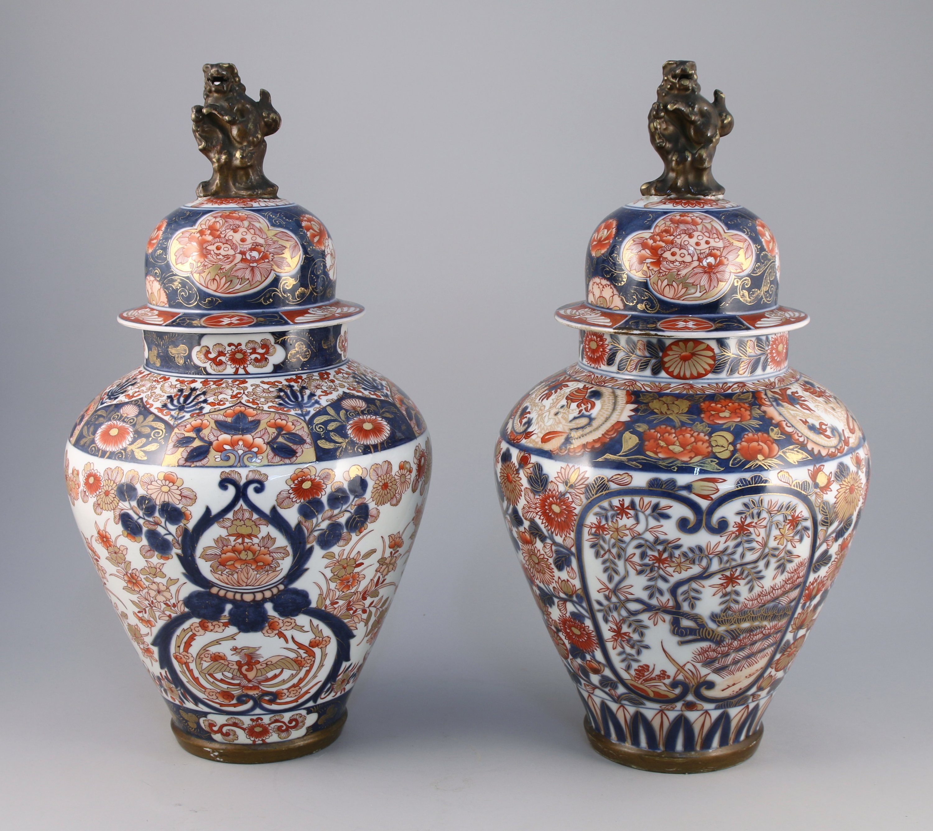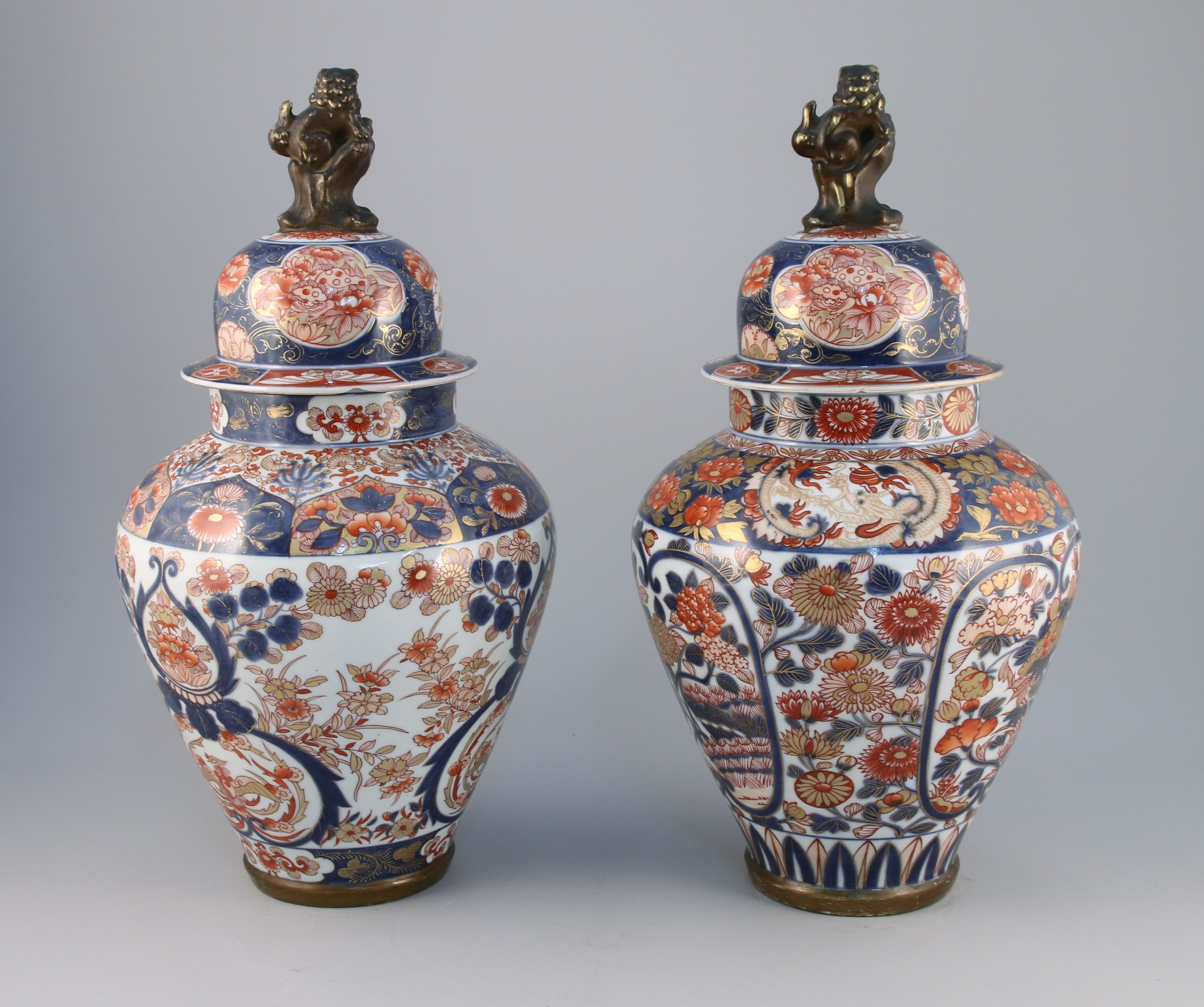 en porcelaine à décors dit "KUTANI" de pivoines et fleurs bleues et rouges dans des réserves avec des rehauts d'or. La prise de chaque coucercle ornée d'un chien de Fô.