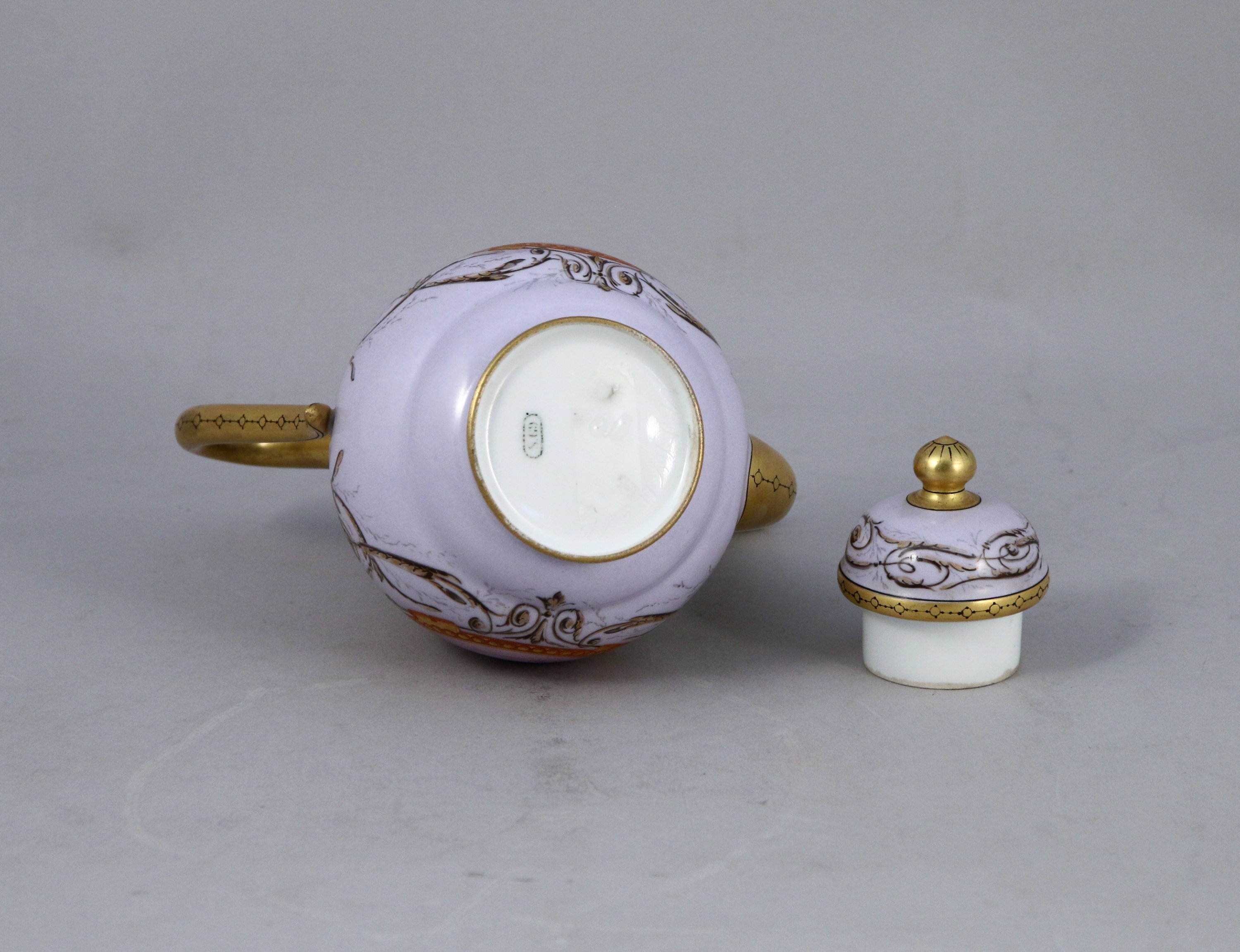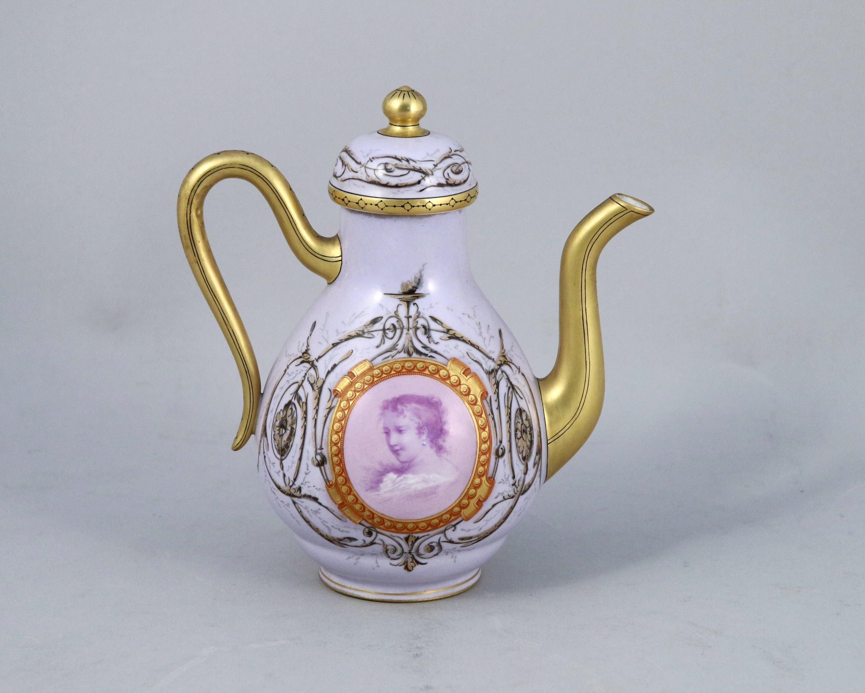 CAFETIÈRE en porcelaine à décor d'un portrait de femme sur chaque face dans un riche médaillon à motif de cuir découpé et d'enroulements. Anse et bec doré.