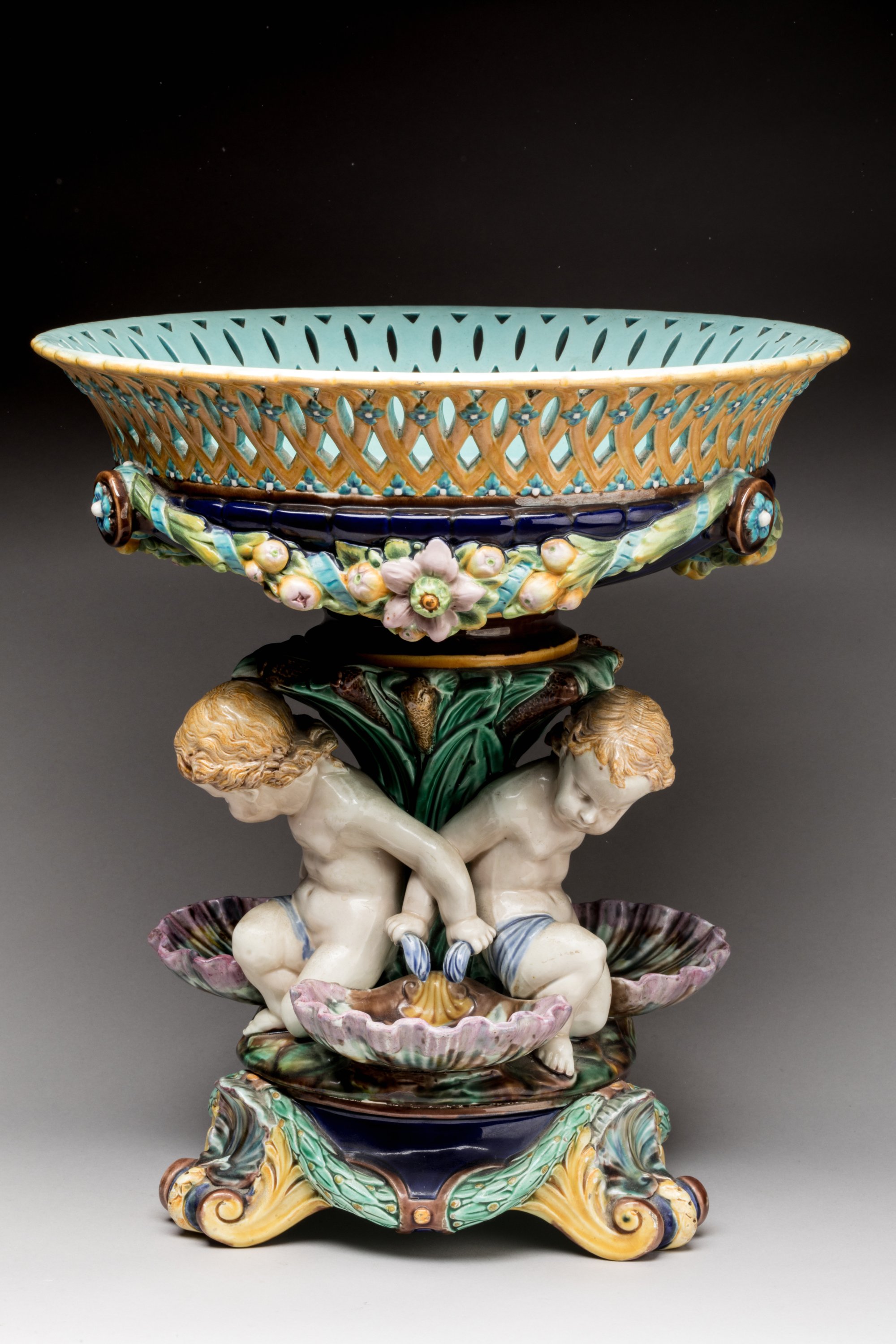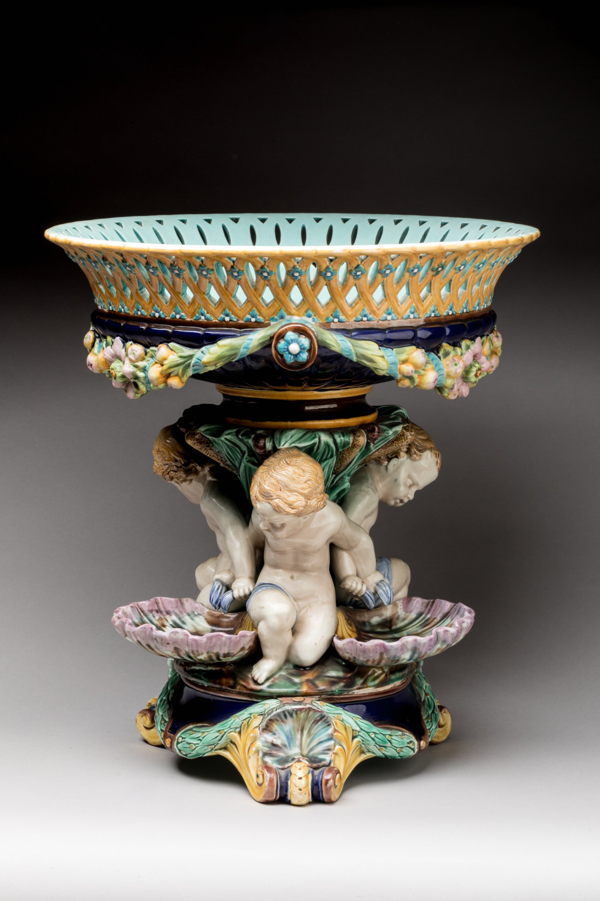 La Jardinière monumentale au Putti et tête de béliers, d'après Carrier-Belleuse, présentée par la manufacture de Minton à l'Exposition universelle de Londres en 1862, rencontre un succès qui la fait entrer directement dans les collections publiques anglaises (V&A Museum, n°inv. 8111-1863.) La manufacture rivale de Wedgwood, adapte les figures de son vase aux "enfants Boucher" pour créer ce centre de table dont la qualité de la composition et de la glaçure sont le signe des pièces d'exception. La marque aux trois caractères "DVW" permet de dater précisément notre coupe aux enfants Boucher. Ces enfants potelés inscrits dans un riche décor végétal composé notamment de trois coquilles Saint-Jacques semblent supporter avec aisance le poids de la vasque les coiffant. La première lettre indique le mois de création, la deuxième l'artisan à l'origine de la forme et la troisième l'année de réalisation. Si l'auteur de cette coupe reste inconnu, elle a été produite autour de décembre 1868. Dix ans plus tard à Paris, Rodin en tant que modeleur dans l'atelier de Carrier-Belleuse, réinterprète cette composition pour le socle de la vasque des Titans dont nous avons eu la chance de présenter deux exemplaires aux enchères à Artigny en 2018 (10 juin, lot 41 acquis pour le Museum of Fine Art of Houston, n°inv. 018.285.A,B) puis 2019 (16 juin, lot 80).