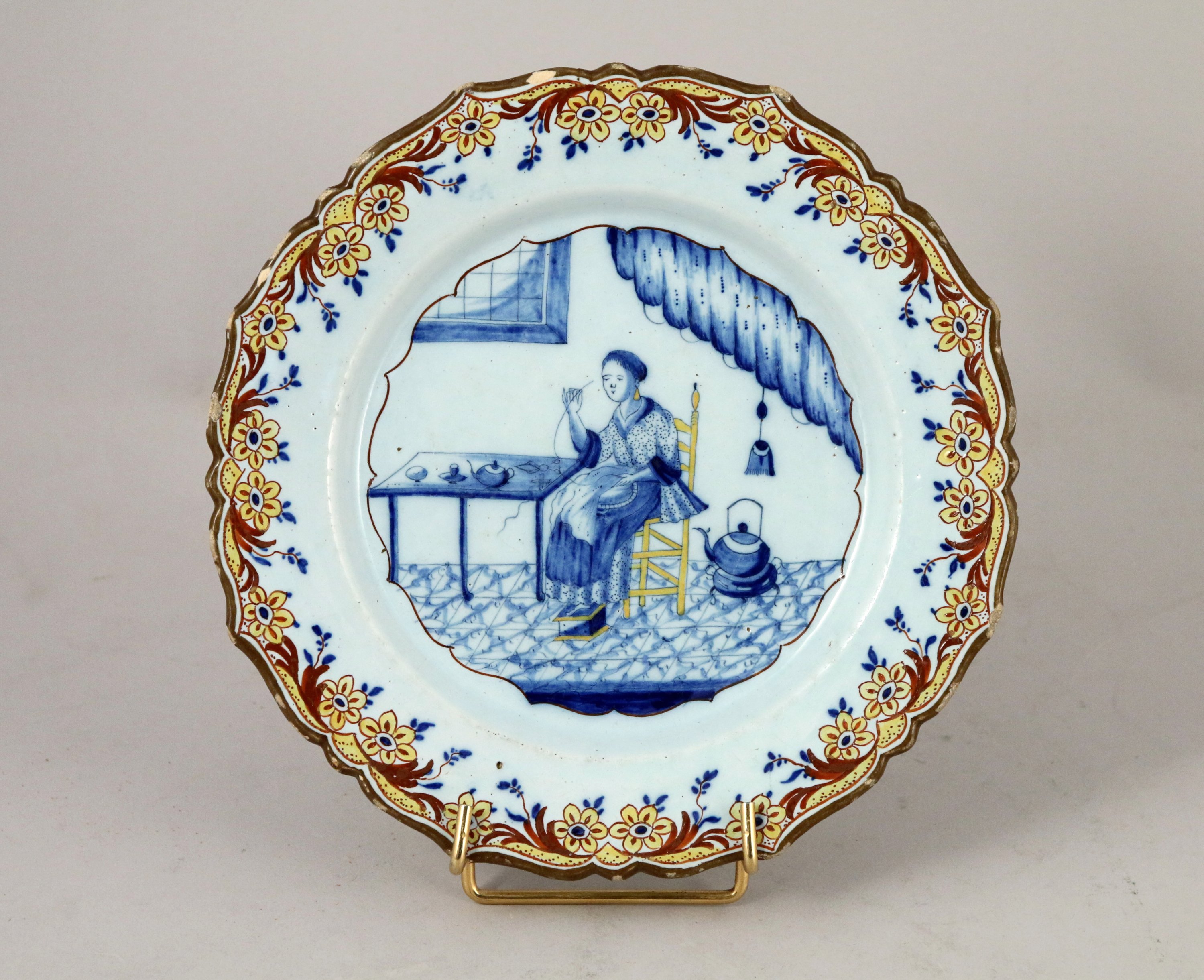 en faïence à décor en camaïeu bleu au centre d'une fileuse dans un intérieur, l'aile à décor polychrome de rinceaux fleuris.