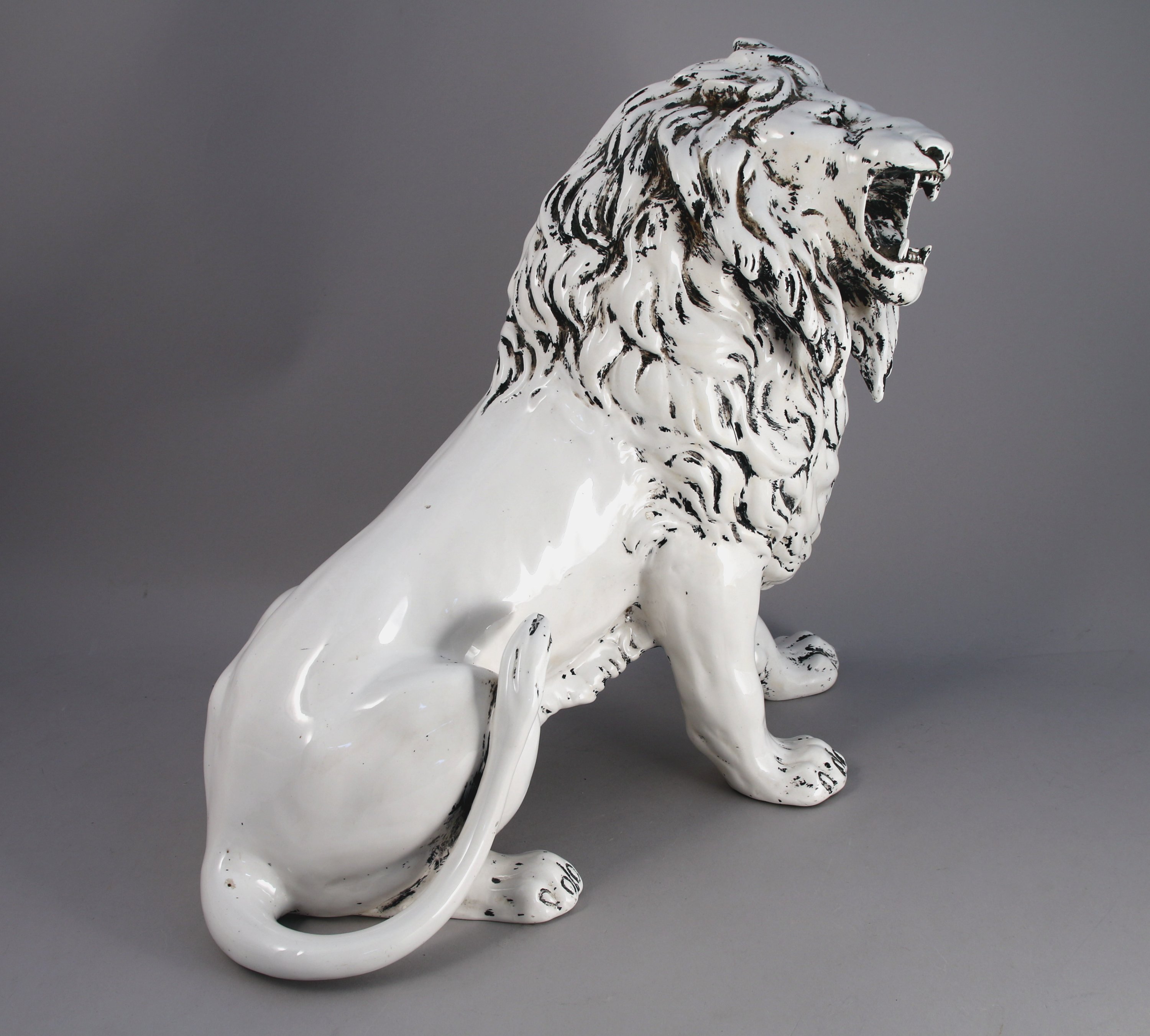 LION RUGISSANT en faïence vernissée blanche. Signature olographe et cachet...