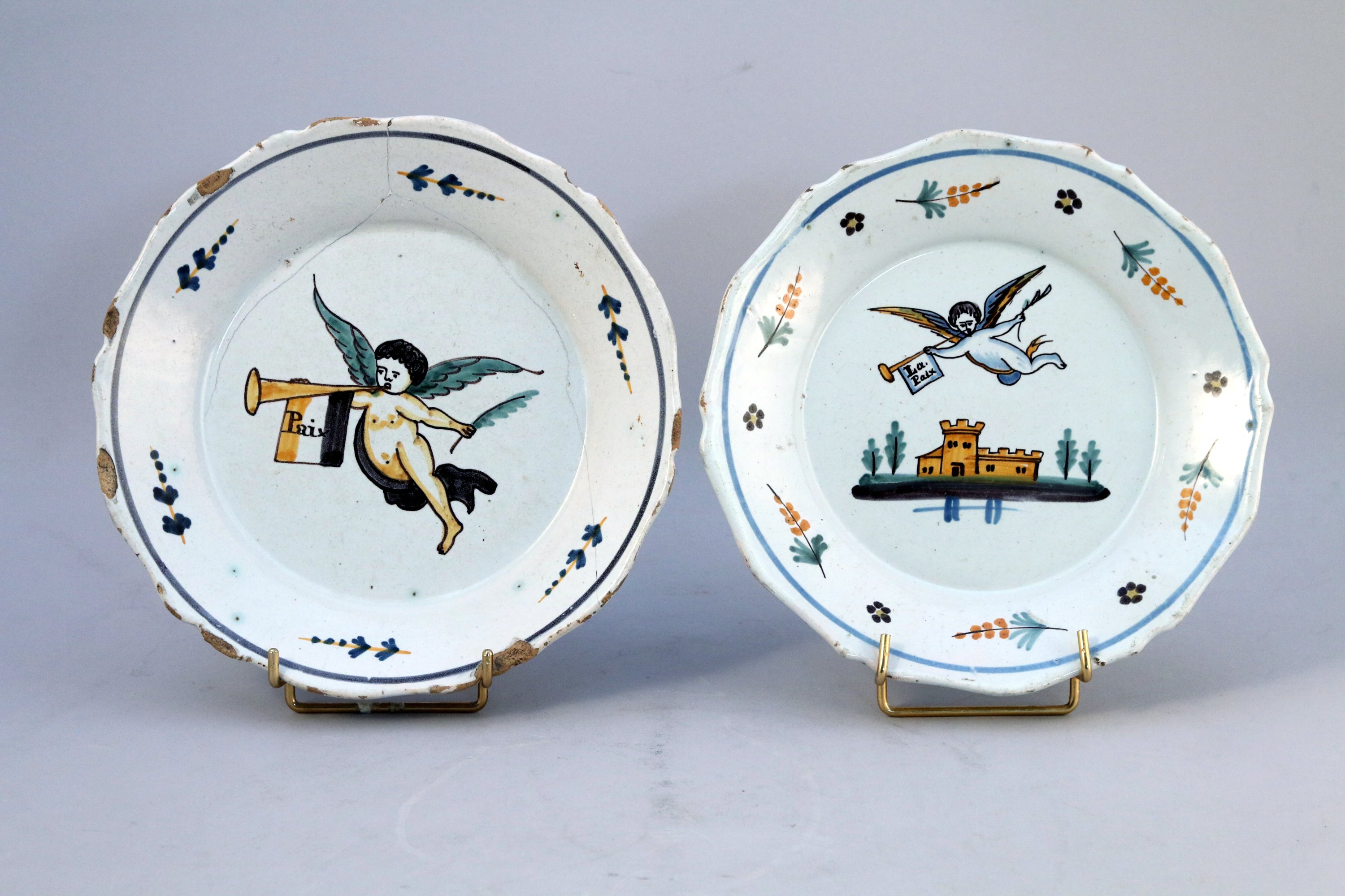 - ASSIETTE à décor d'un ange au dessus d'une forteresse tenant dans sa main gauche un rameau d'olivier et dans sa main droite une trompette et un étendard portant l'incription "La Paix", l'aile décorée de rameaux alternant avec des fleurettes.
