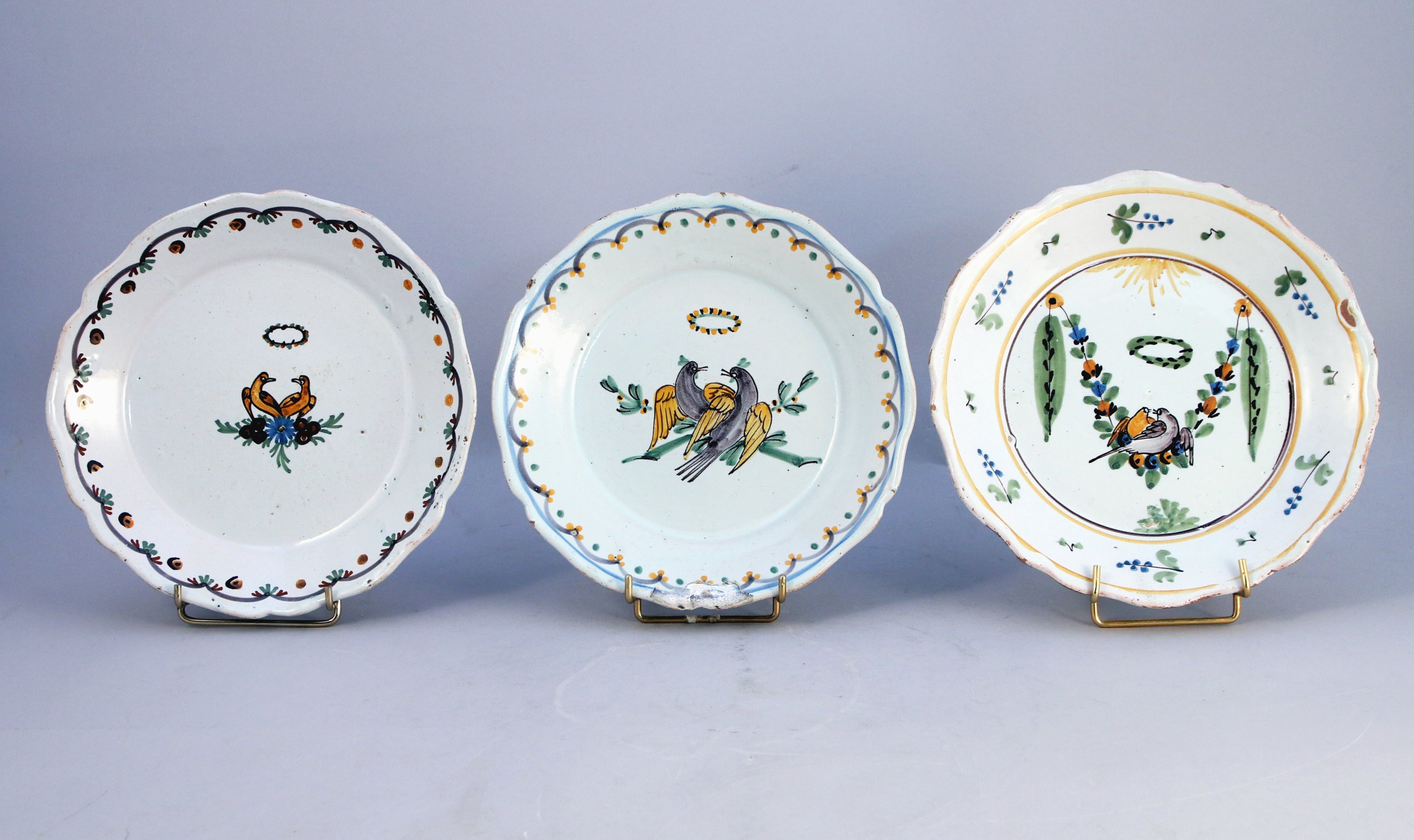 NEVERS, début XVIII, fin XIXe. Trois ASSIETTES de mariage à bords chantournés en faïence à décor polychrome :