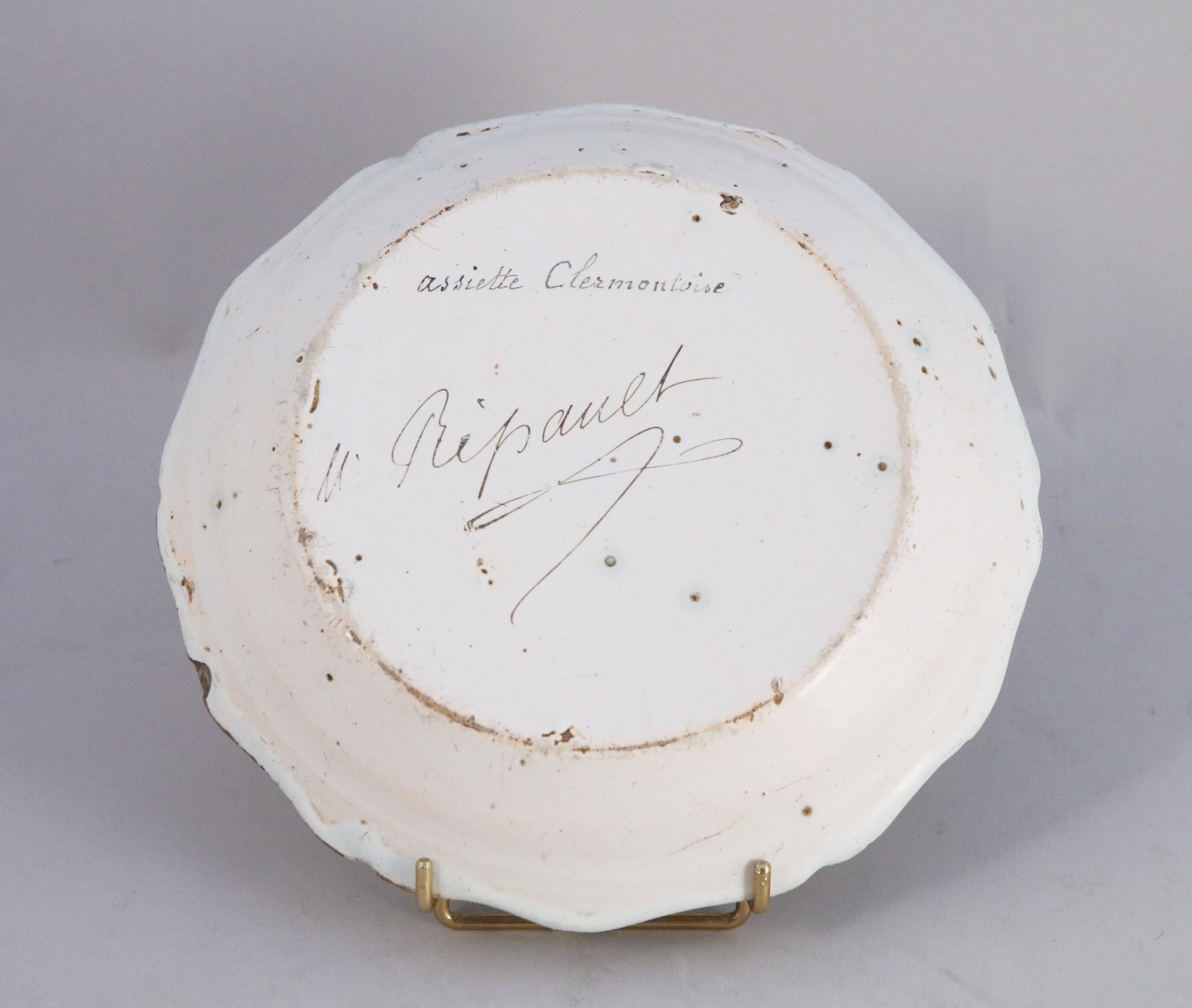 à bord contourné en faïence stannifère. Décor polychrome de grand feu d'un soldat debut sur un tertre arboré, inscription au dessous "Le Bonheur de La République". Au revers l'inscription postérieure manuscrite "assiette Clermontoise Ripault".