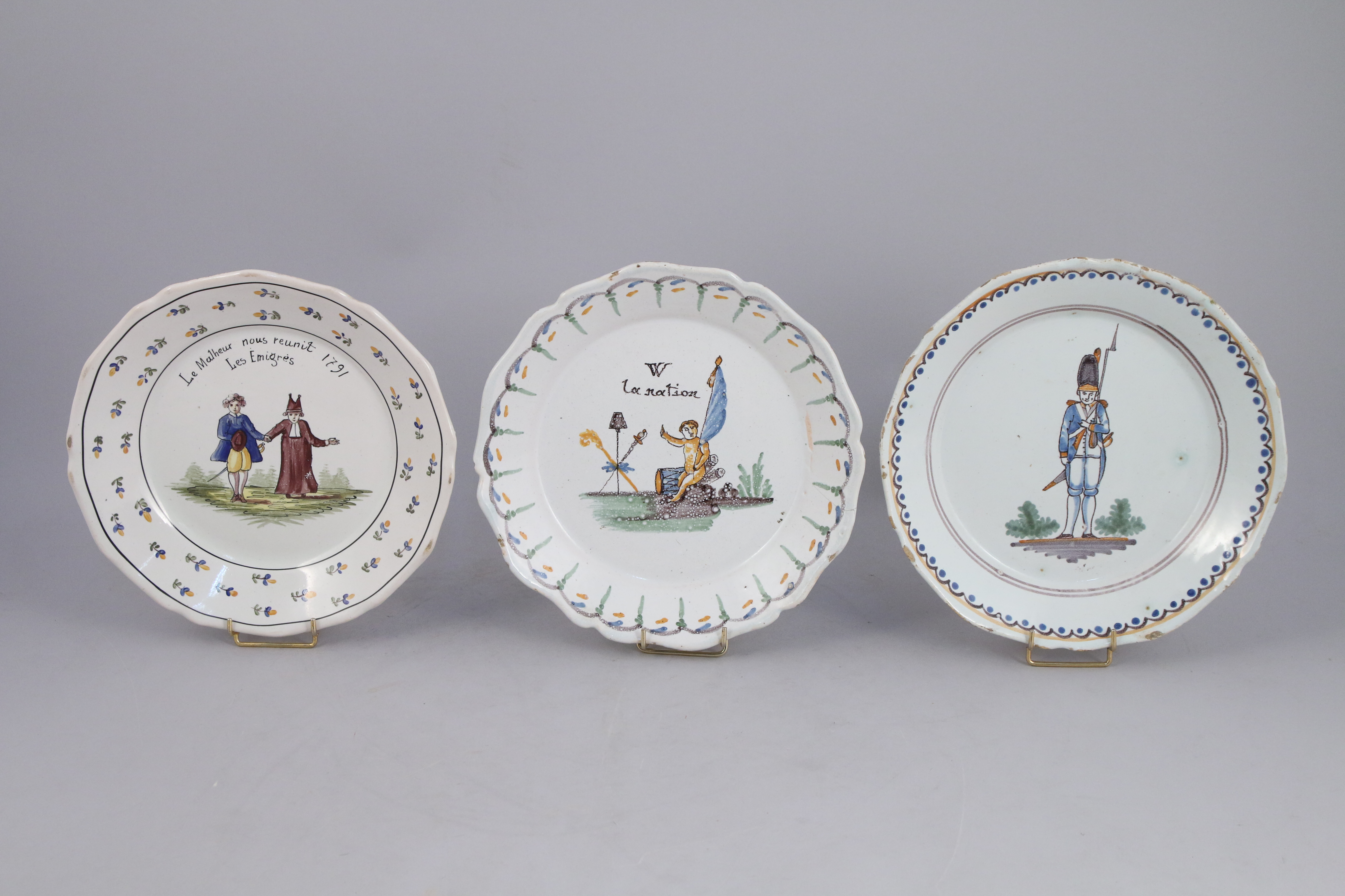 - ASSIETTE révolutionnaire, à bord contourné en faïence. Décor d'un amour tenant un drapeau assis sur sur des trophées militaires, la réunion des trois ordres à sa droite et l'inscription "W (vive) la Nation".