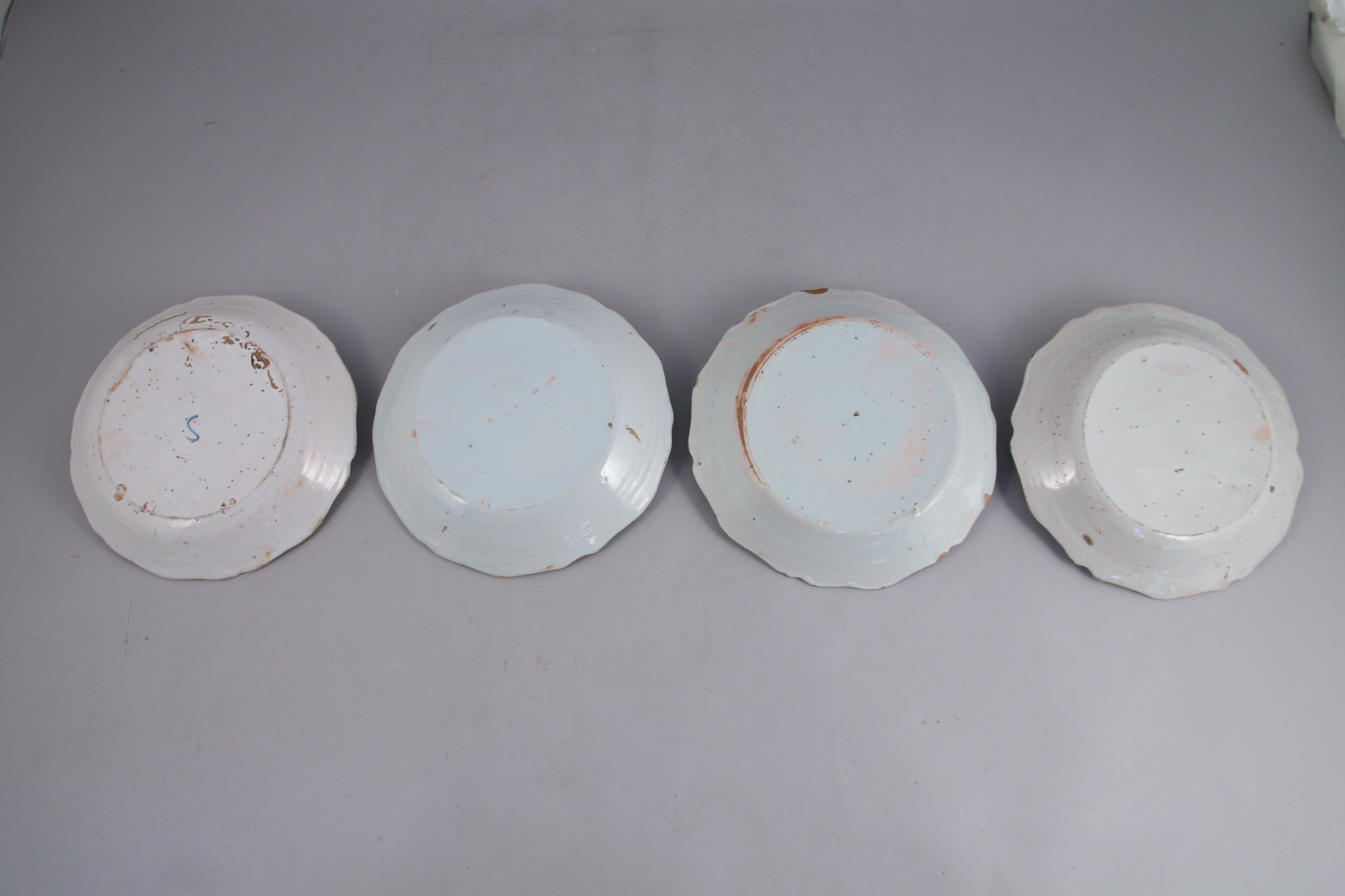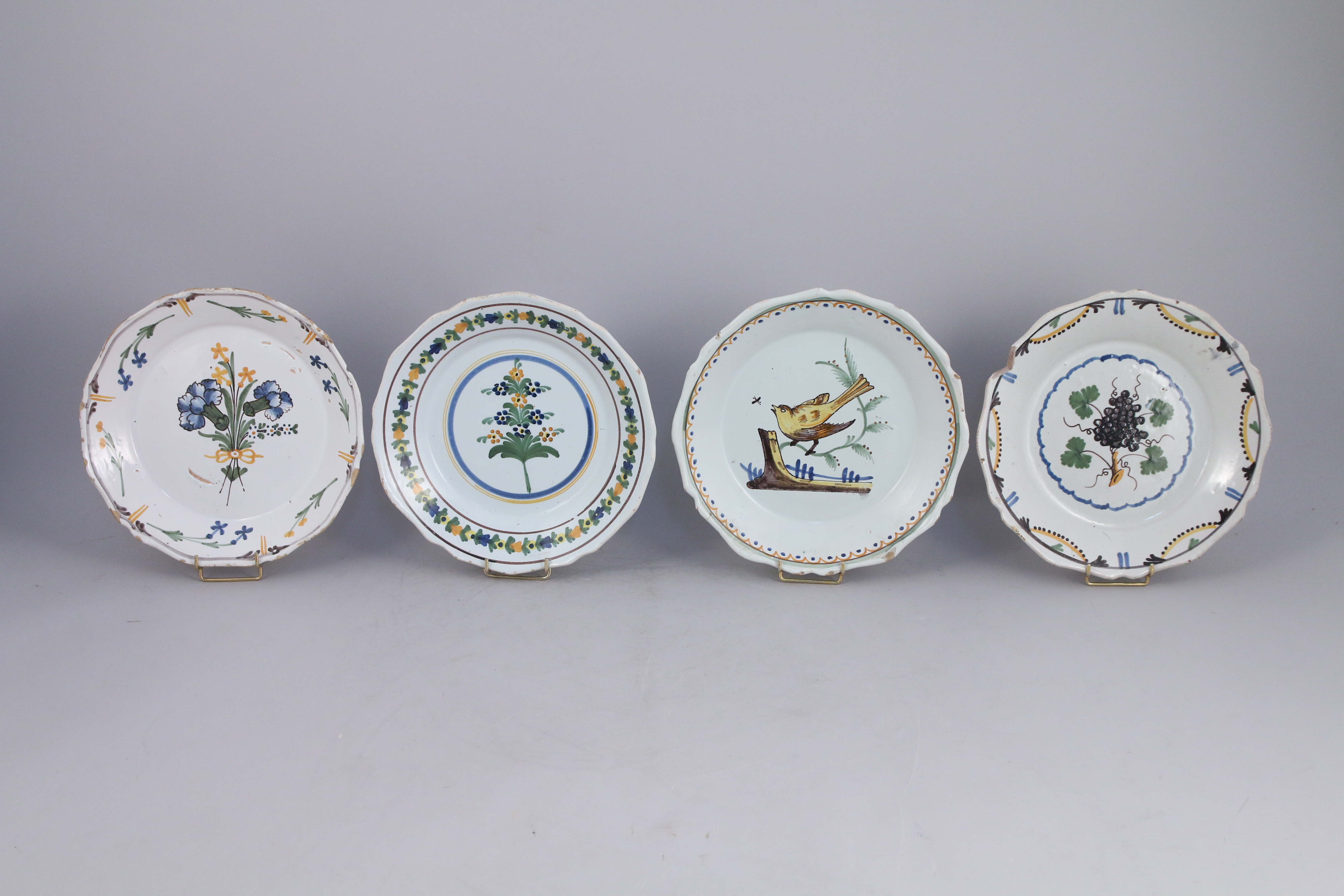 en faïence à bords contournés. L'une à décor d'un moineau sur une branchce près d'un insecte. L'autre à décor d'une grappe de raisin (manque sur la bordure). La troisième à décor d'un bouquet de fleurs.