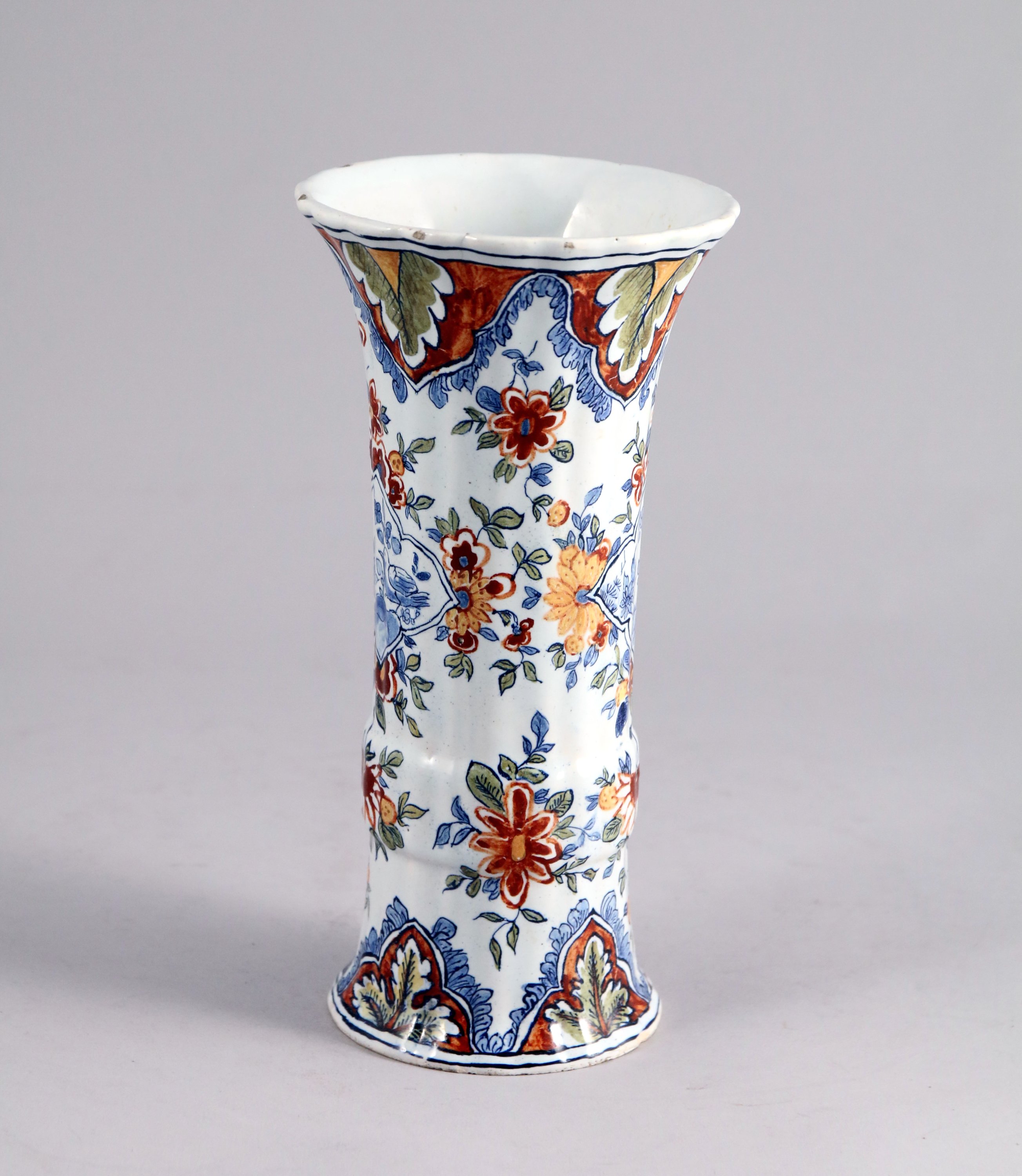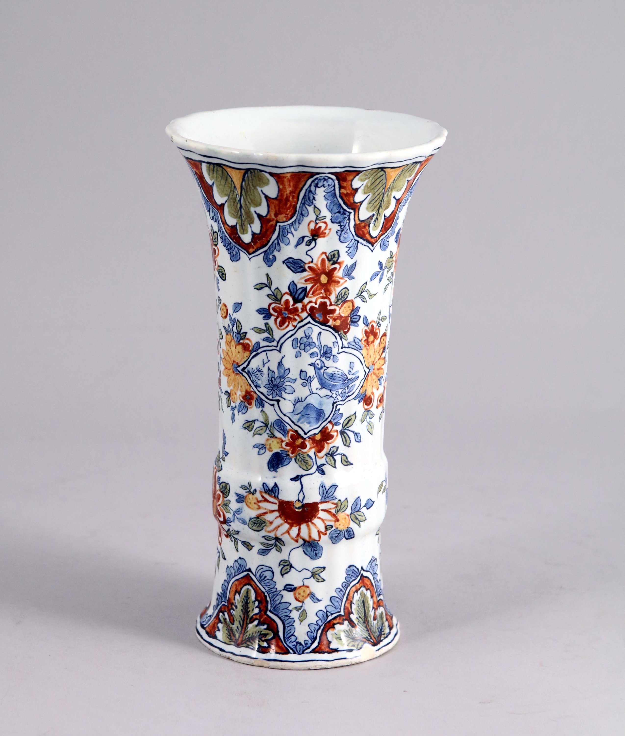en faïence polychrome, le col et le pied à décor de feuilles d'acanthe, la panse ornée d'une forme quadrilobée dans laquelle s'inscrit un oiseau marchant.