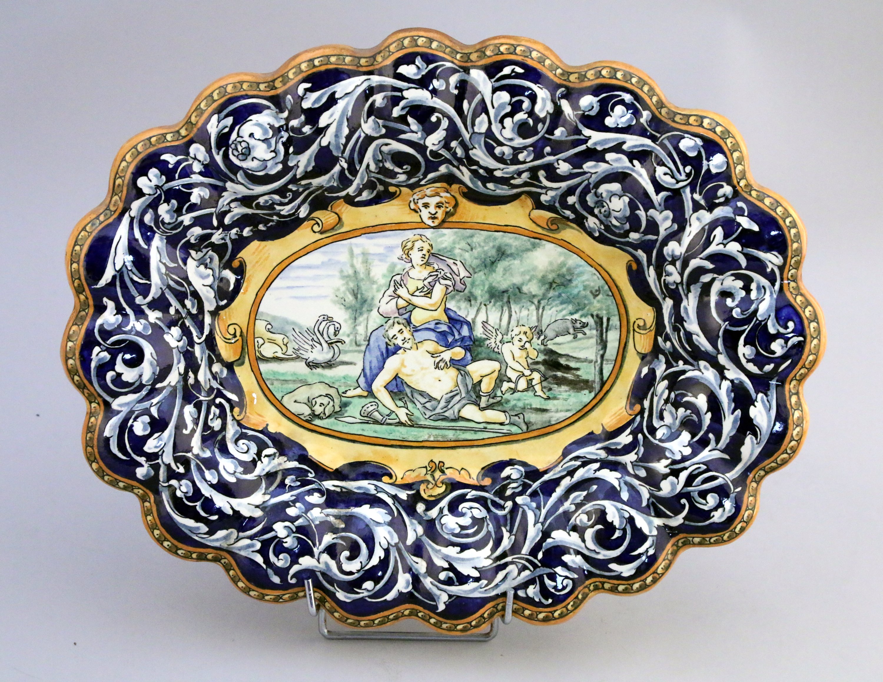 en céramique émaillée de forme ovale à aile chantournée et godronnée ornée de rinceaux et au centre d'une scène représentant la mort d'Adonis.