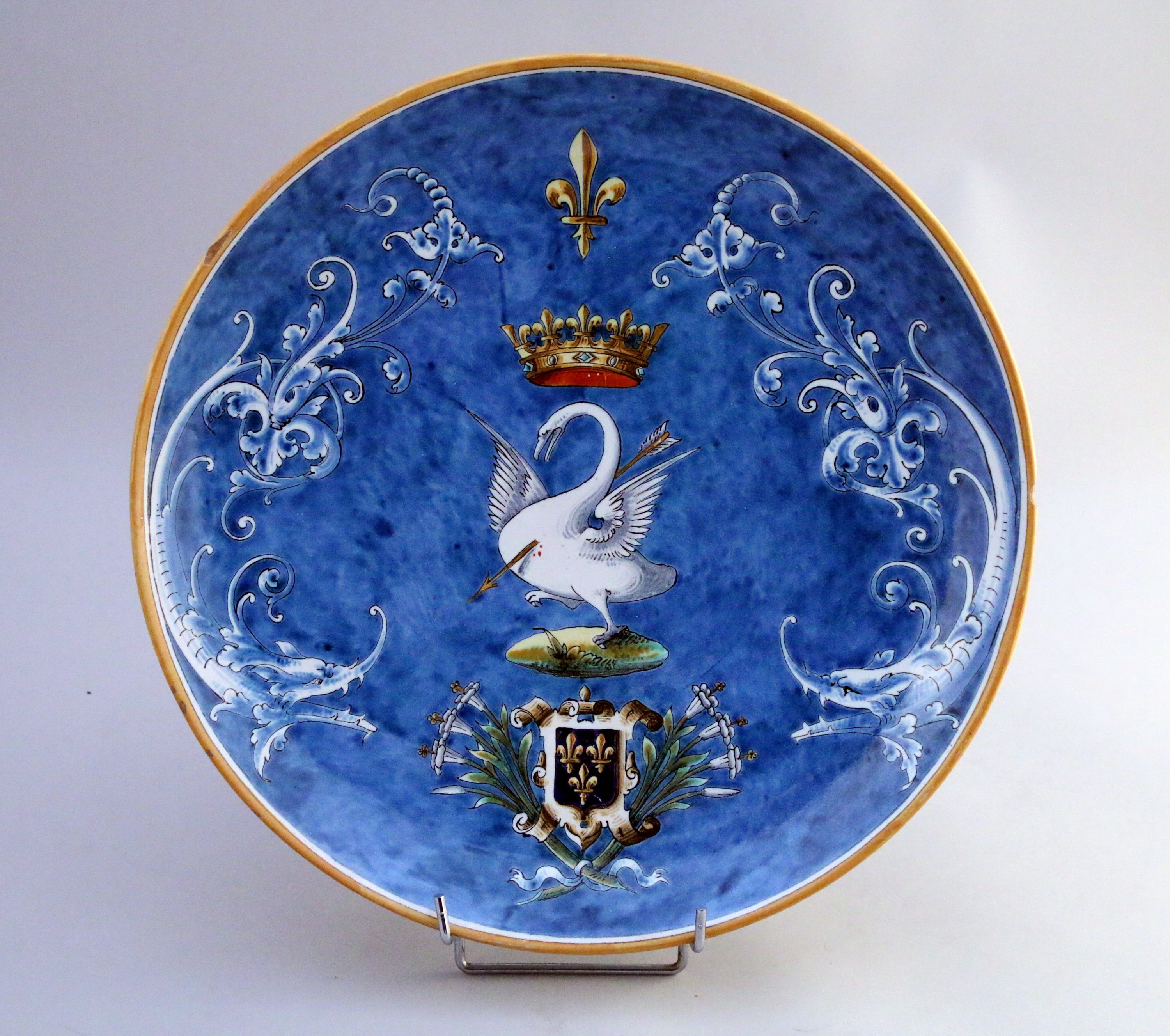 en céramique émaillée à décor de rinceaux et au centre d'un cygne transpercé d'une flèche surmonté d'un couronne et d'une fleur de lis, au-dessous blason de France et lis au naturel.