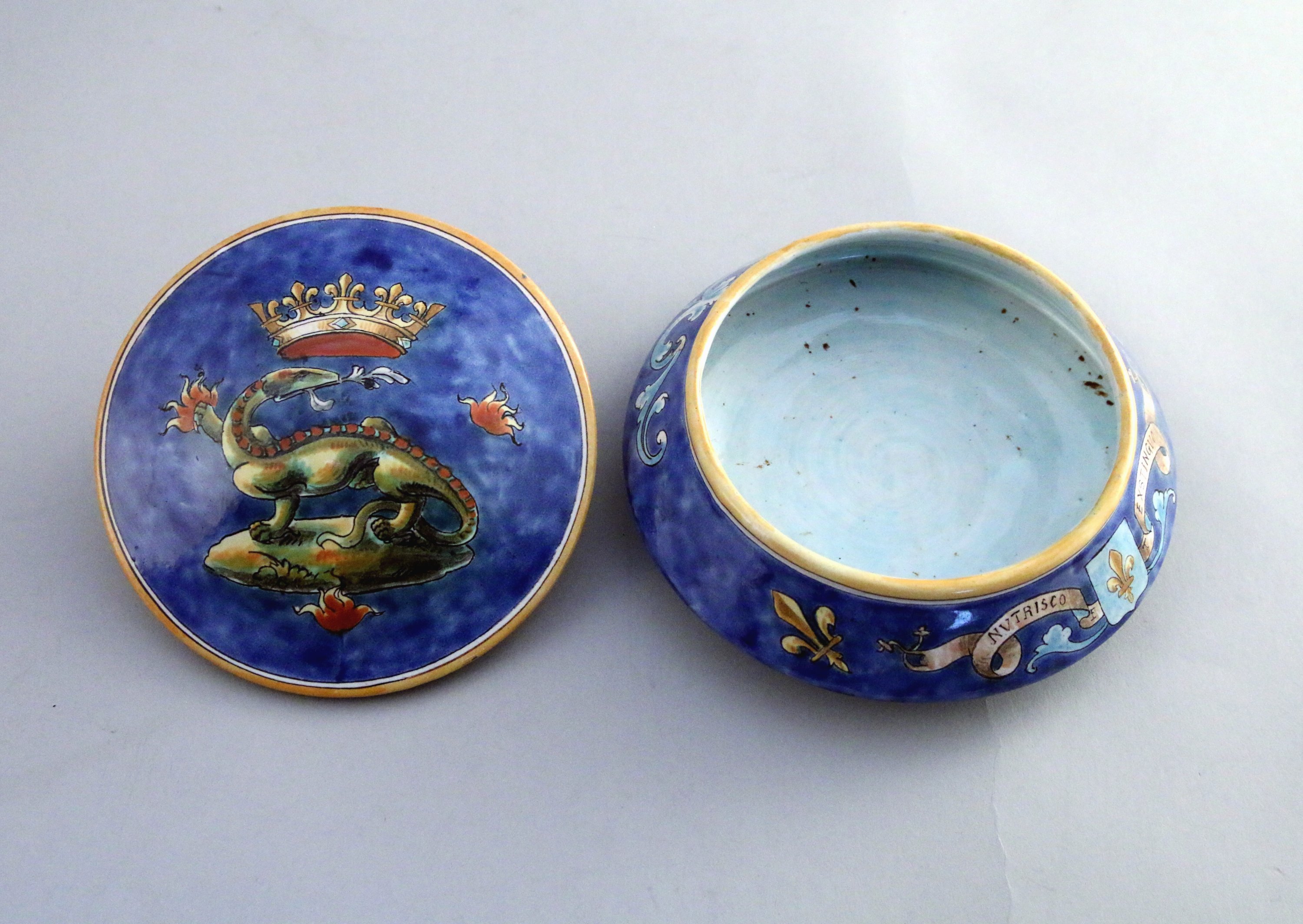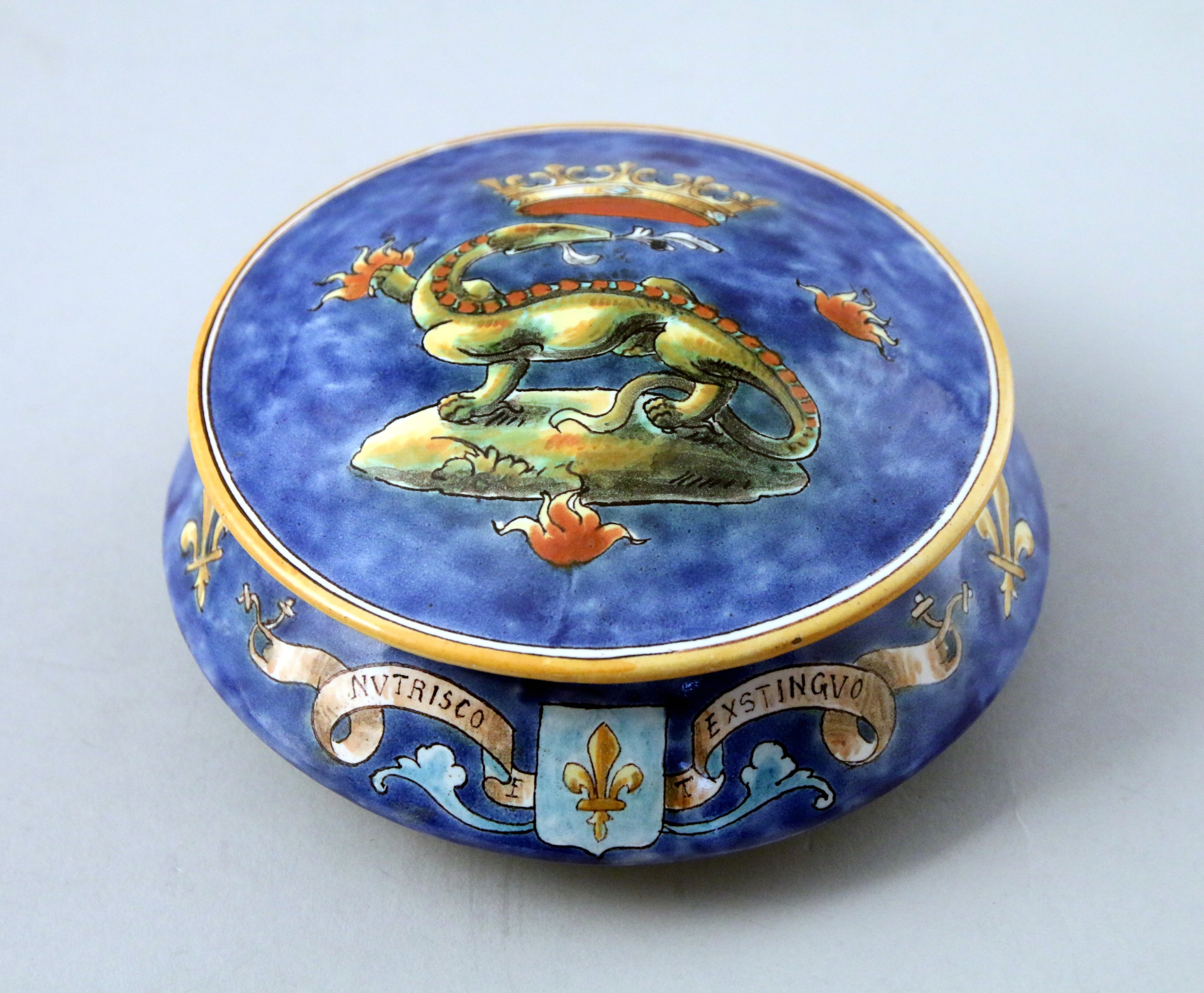 BLOIS. Gaston BRUNEAU (1881-1965). BONBONNIÈRE couverte en céramique émaillée à décor d'une fleur de lis dans un blason avec la devise Nutrisco et extinguo (je nourris et j'éteins) dans un phylactère. Le couvercle orné d'une salamandre couronnée. Marque olographe Ulysse, Blois et G. Bruneau - Balon Succ de E.Balon. Haut. 5, Diam. 13 cm.