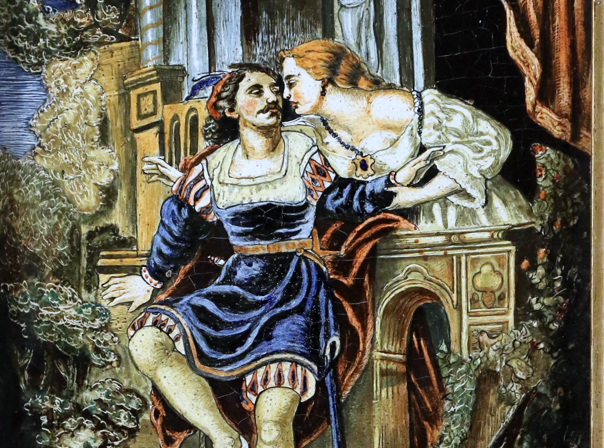 PLAQUE en céramique à décor polychrome représentant Roméo et Juliette.