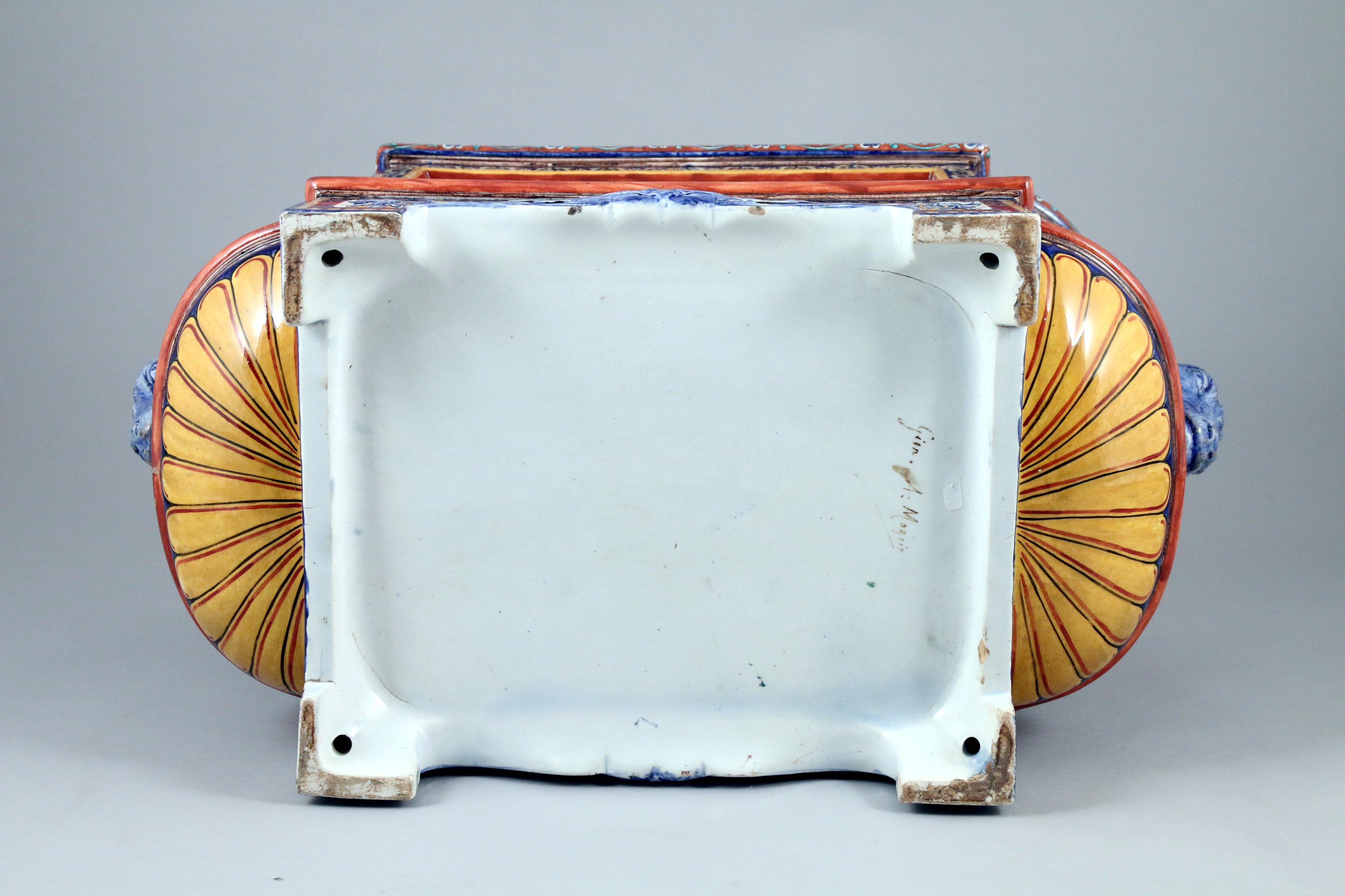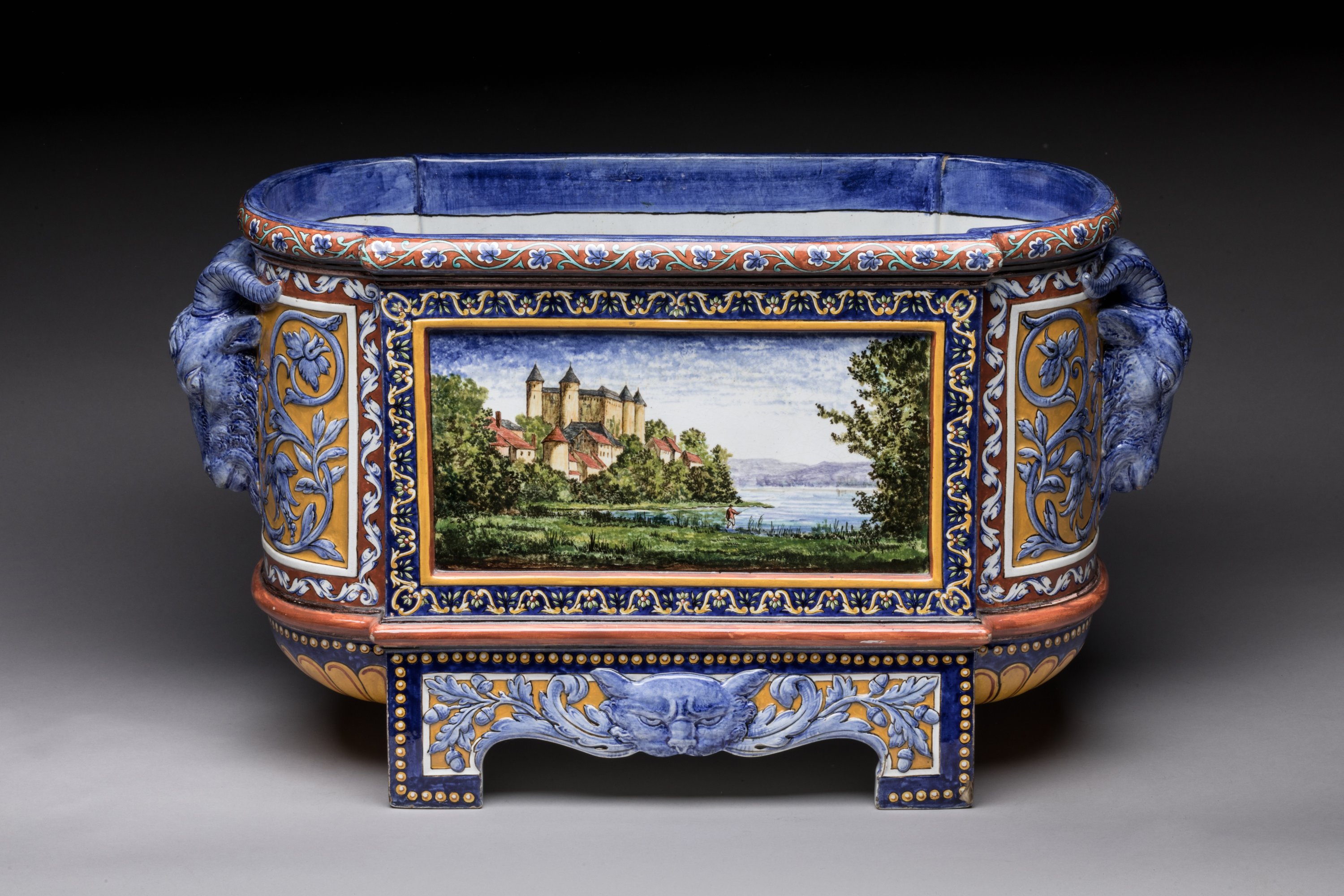 en céramique émaillée à ressauts et anses à têtes de béliers. Chaque face ornée d'un grand cartouche peint représentant d'une part une scène bucolique auprès d'un pont à arches (Montargis ?) et d'autre part une scène de pêche au pied d'une place forte.