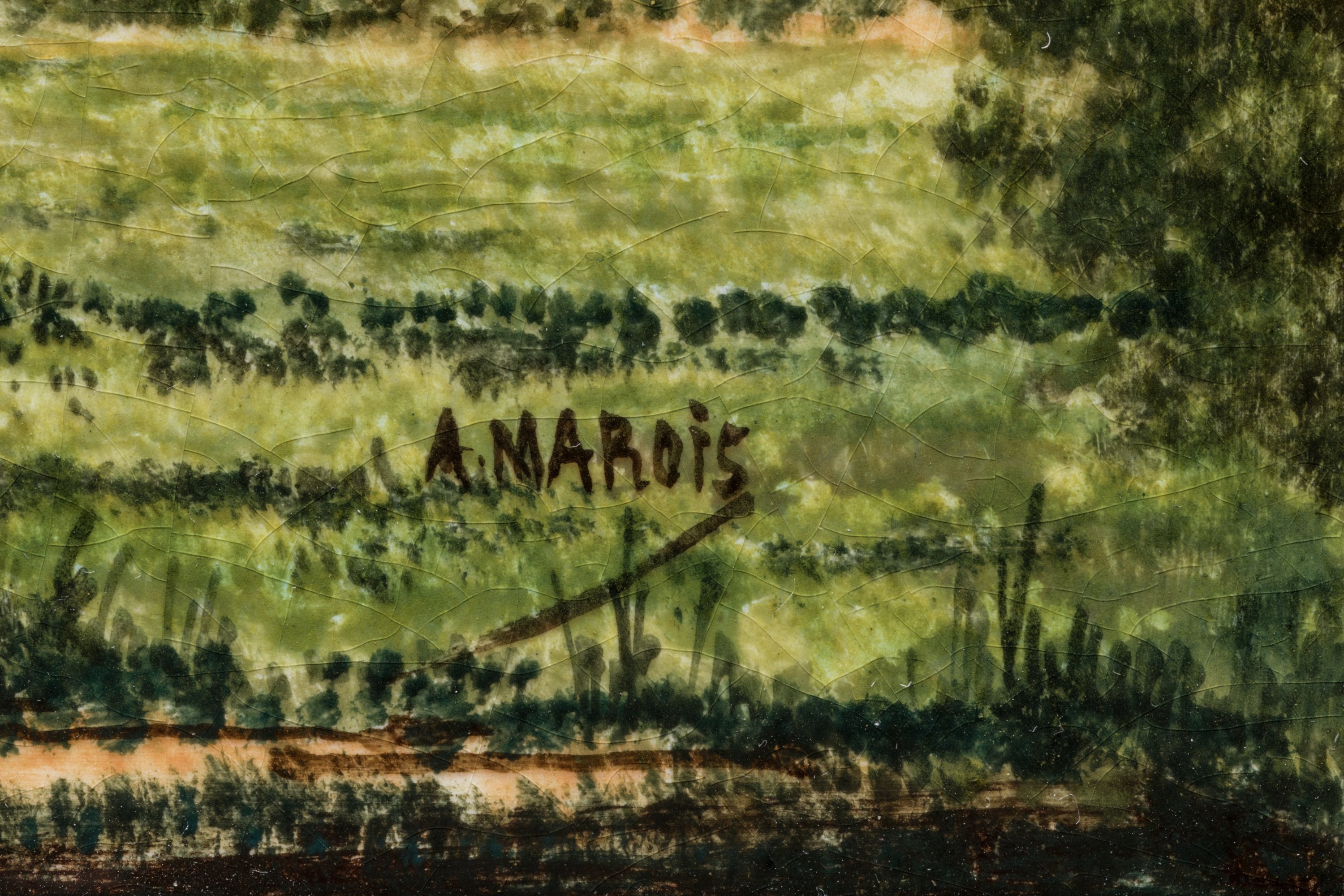 Marque de Gien olographe, circa 1871. Signée en bas à droite de chaque panneau et sous le fond " A.MAROIS ".