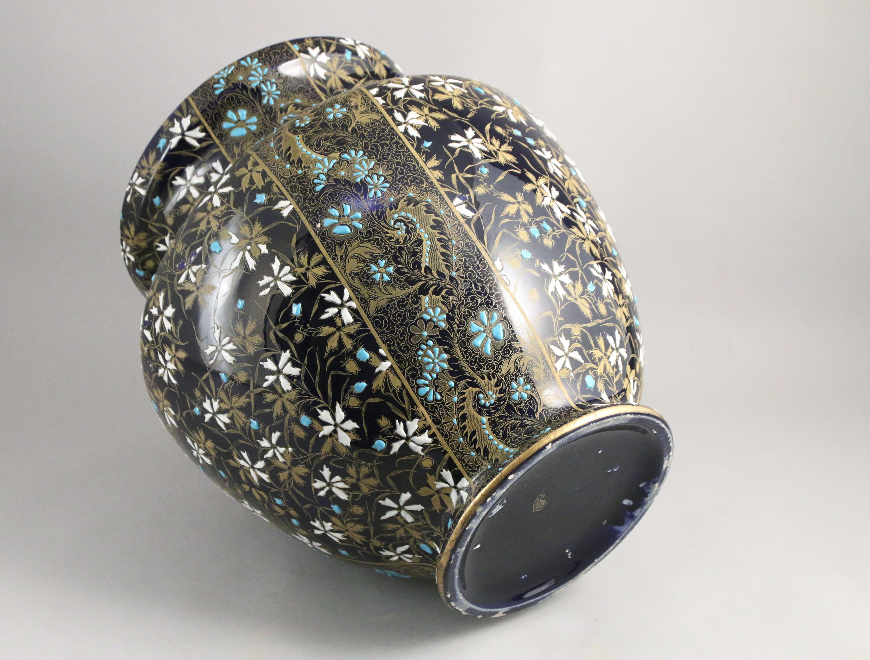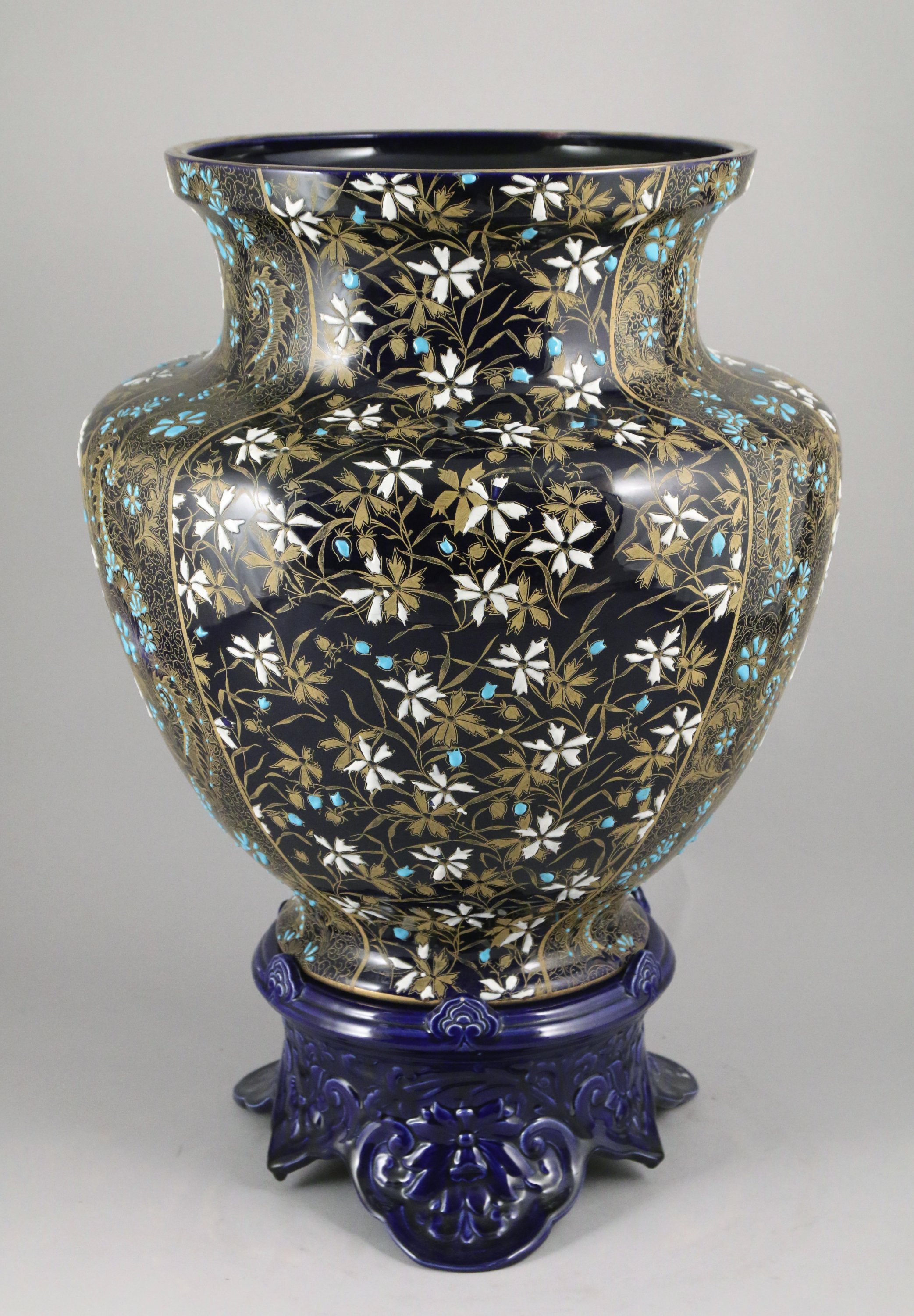 en céramique émaillée, à décor de feuillage à l'or et gouttes d'émail opaque blanc et turquoise sur fond bleu nuit séparés par des bandes de rinceaux. Socle tripode à décor en relief de rinceaux.
