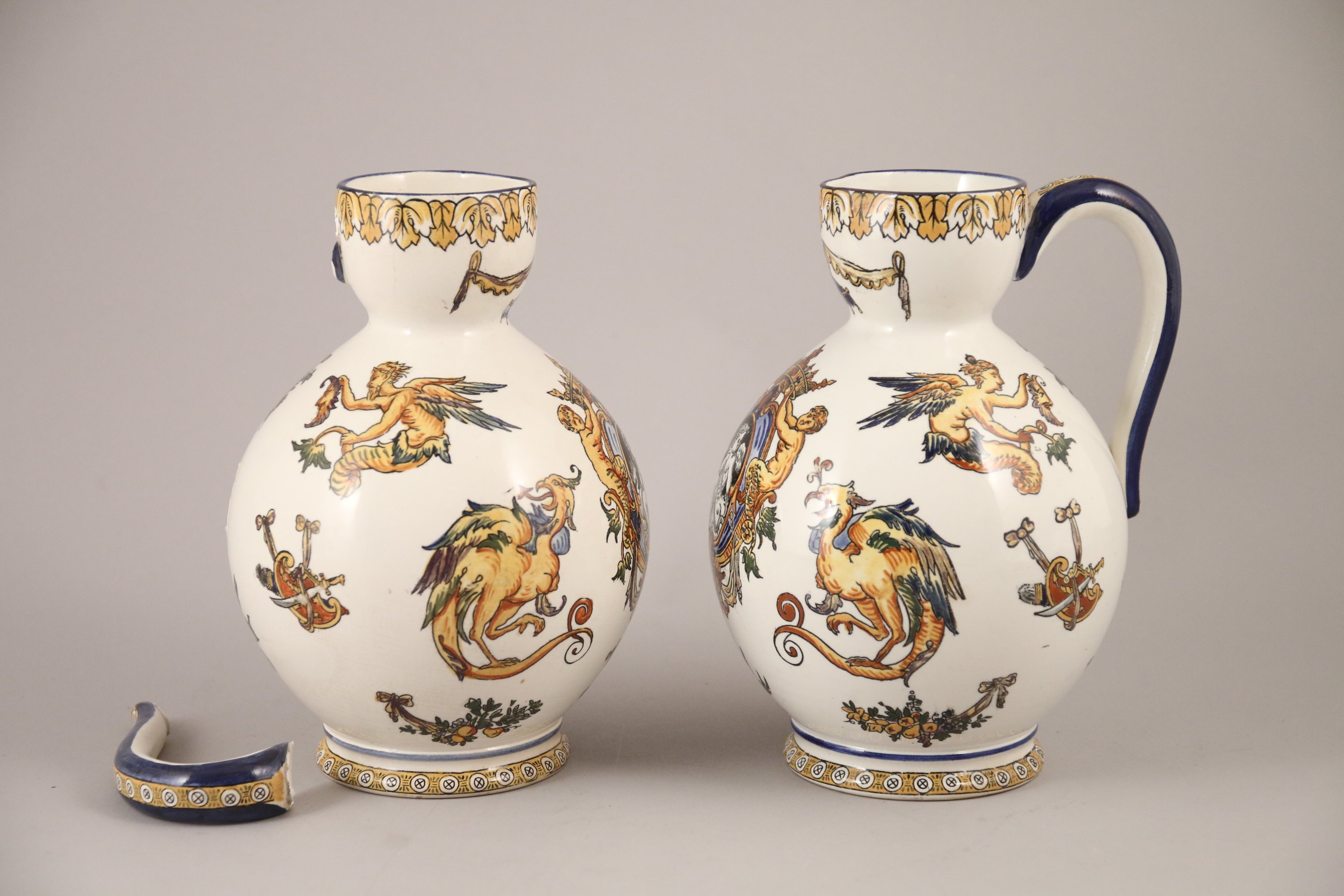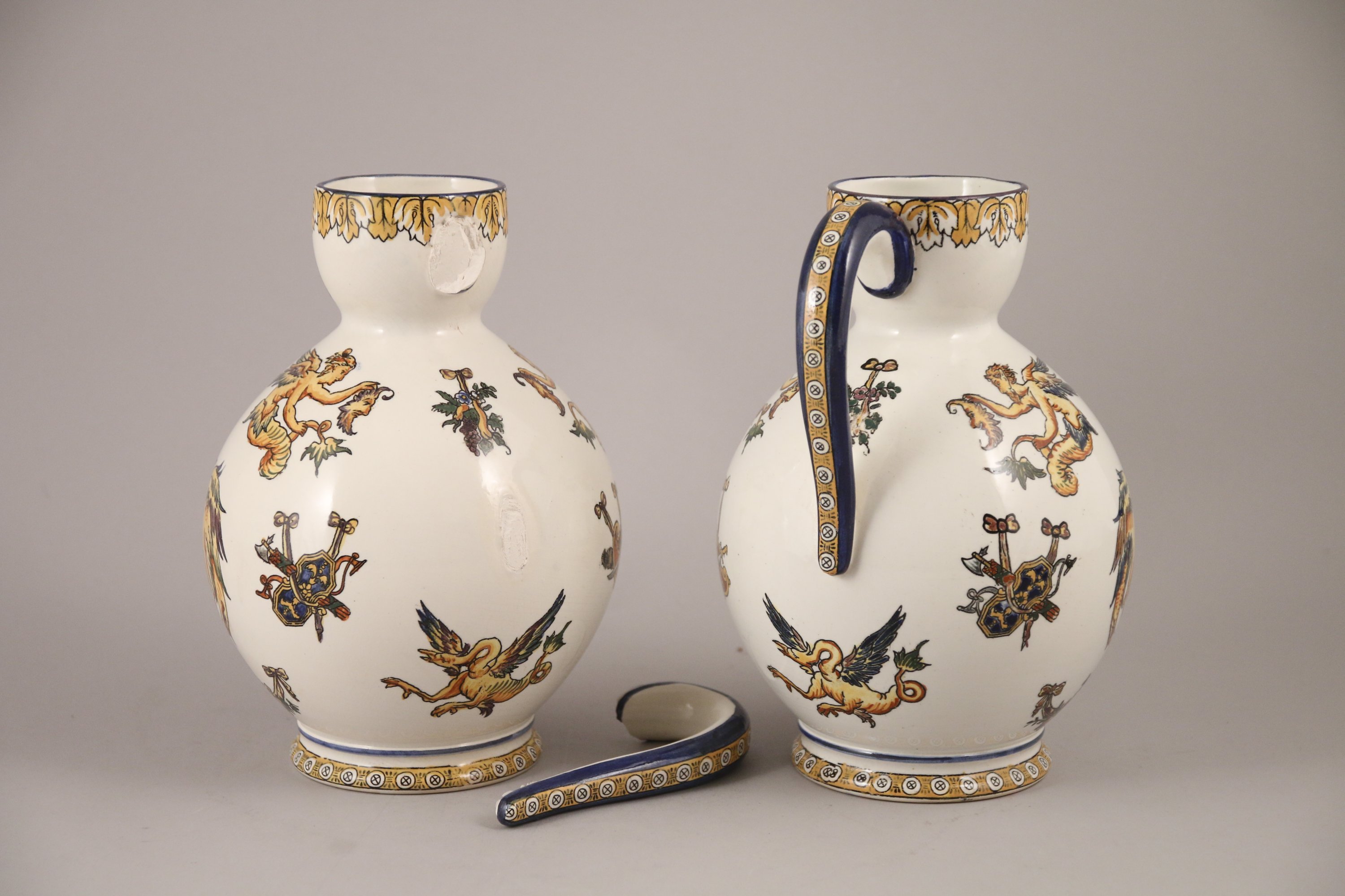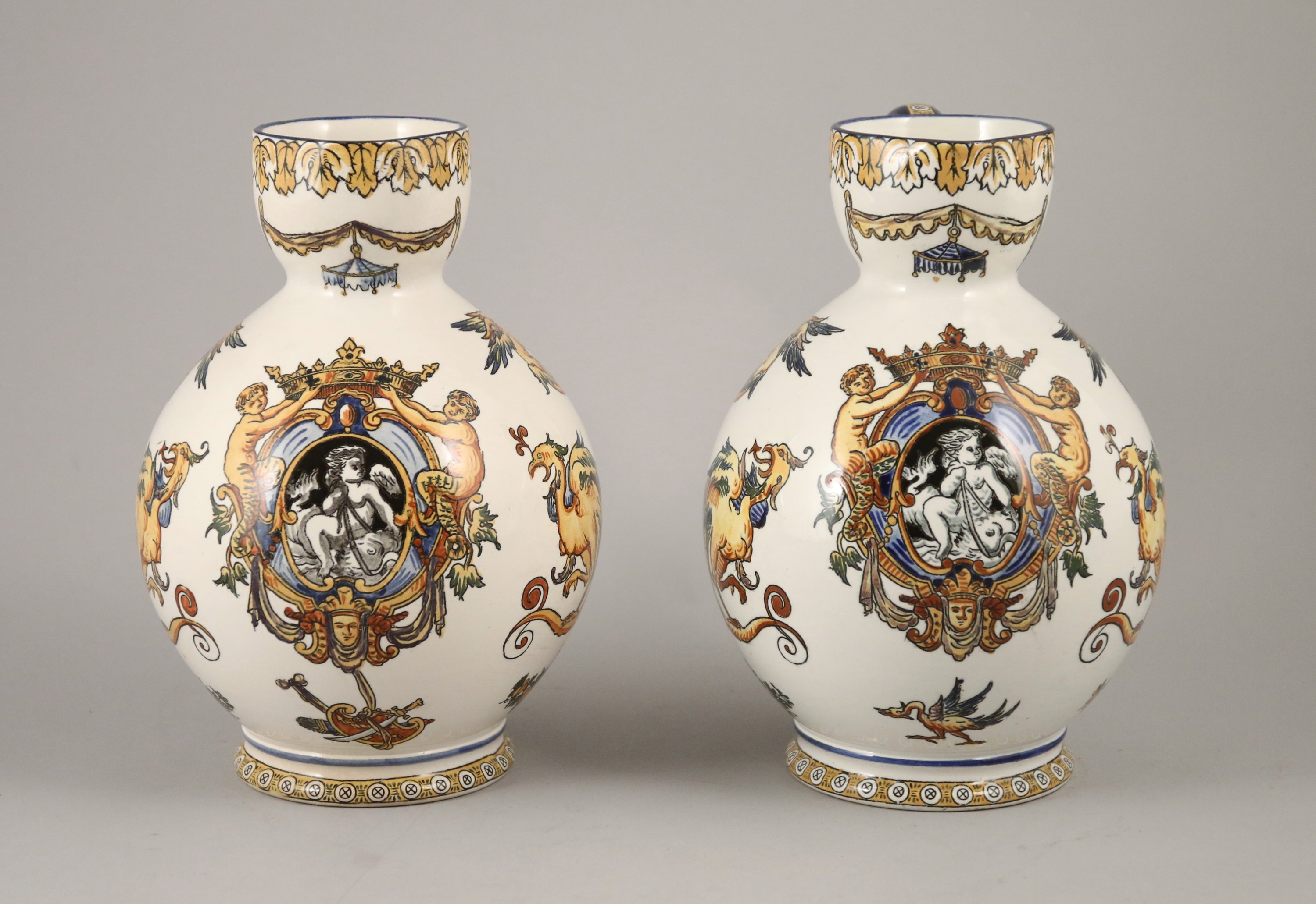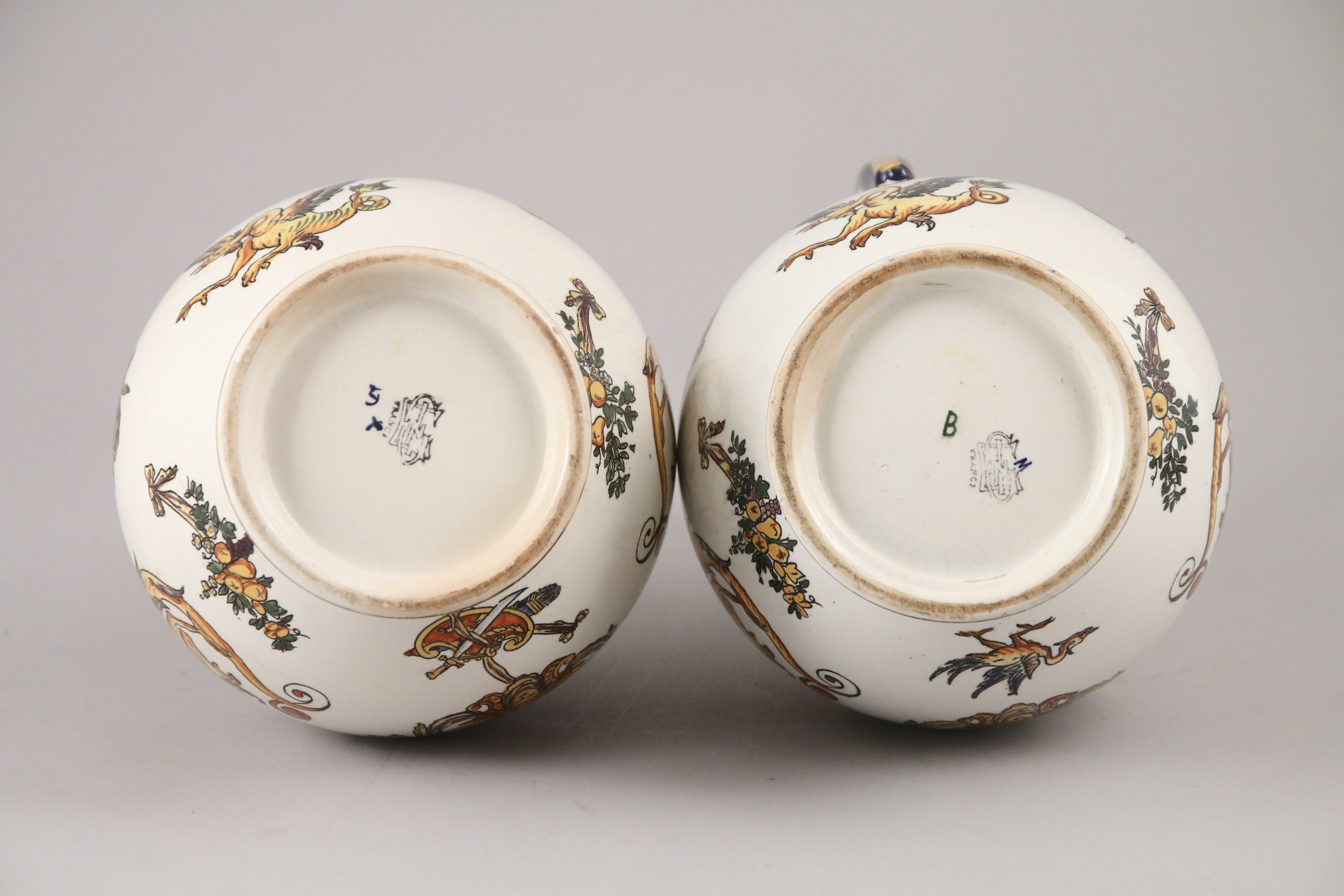 en céramique émaillée à décor de la Renaissance Italienne sur fond blanc de chimères et d'un cartouche à l'amour marin surmonté d'une couronne de marquis sous un dais.