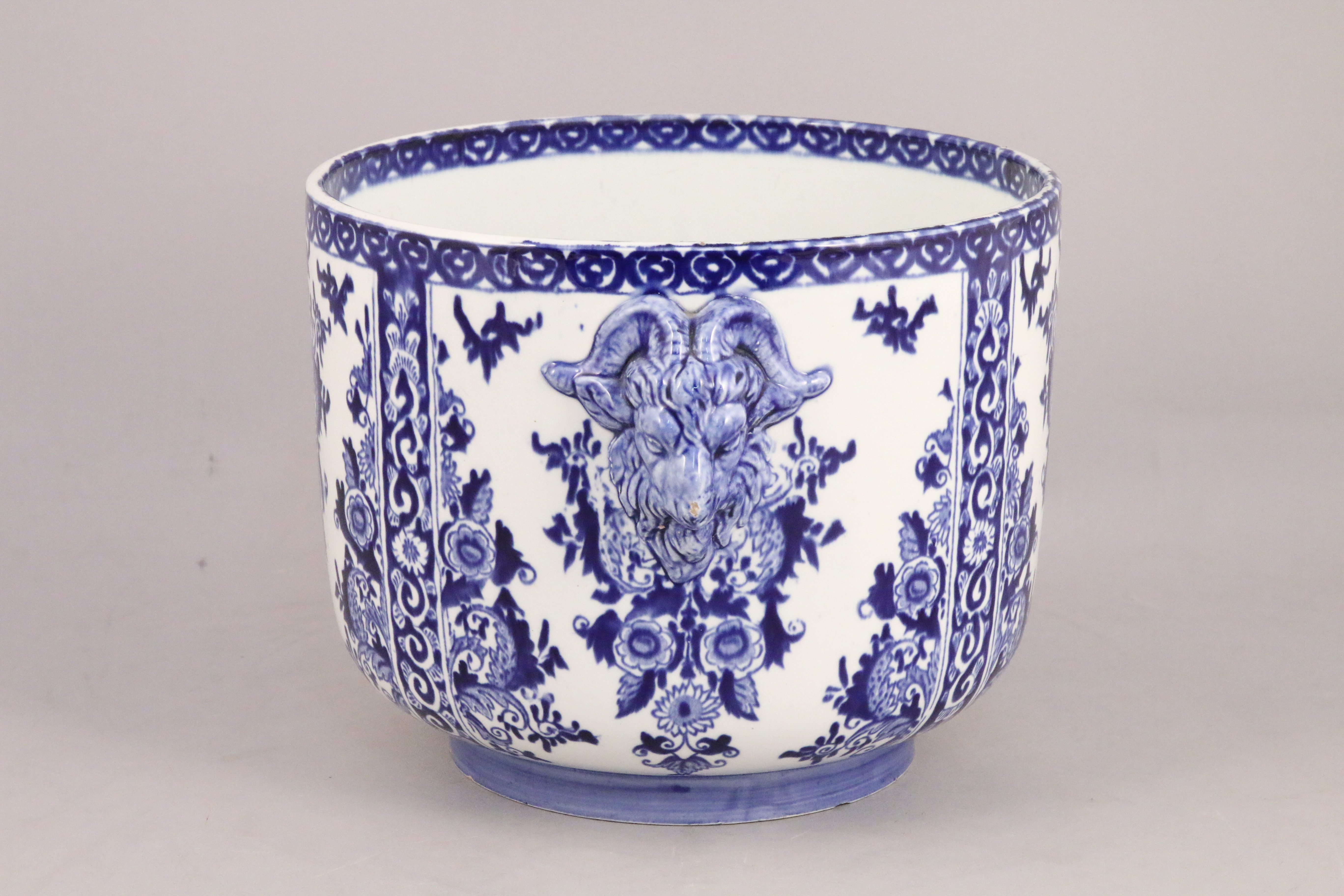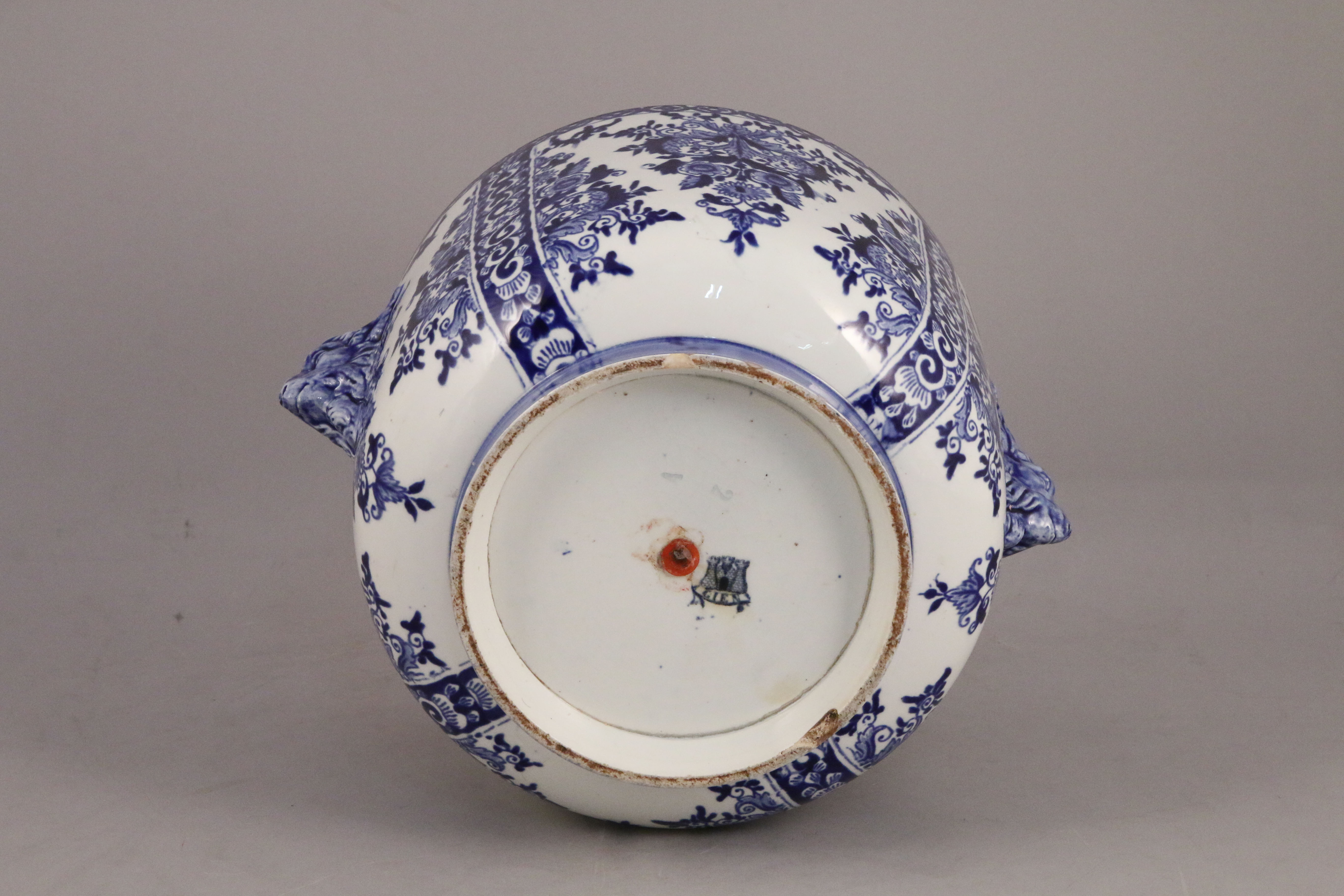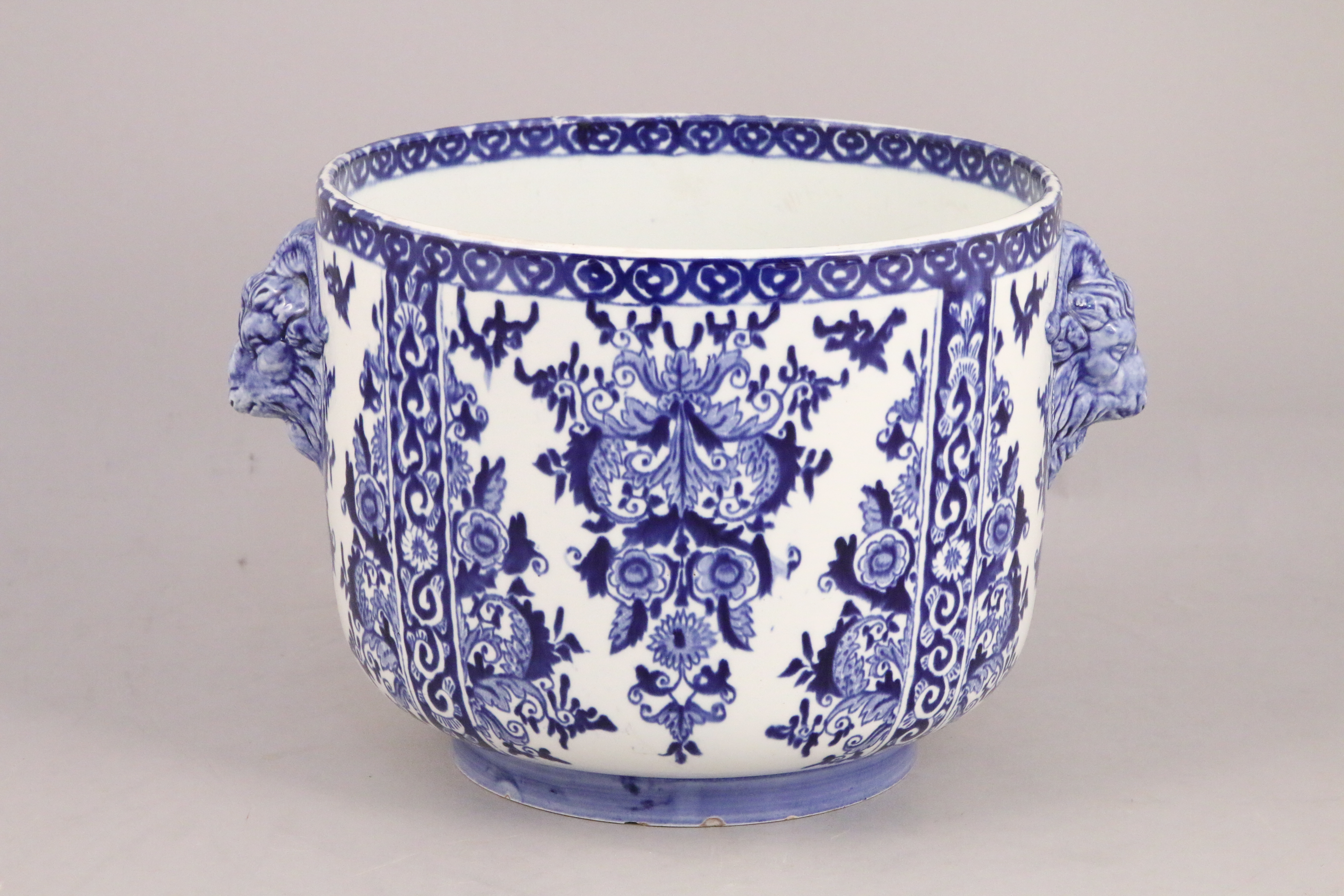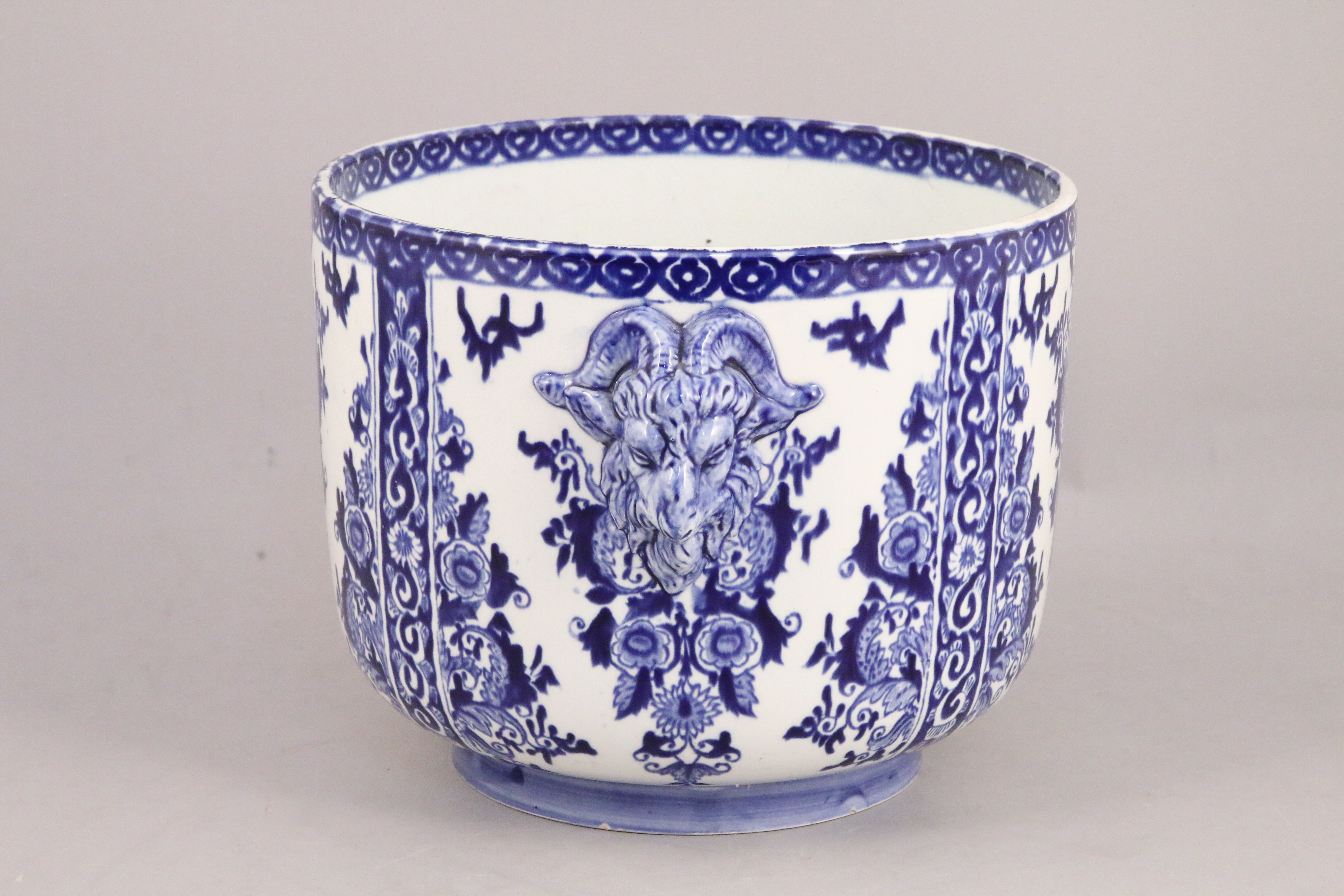 en céramique émaillée, au décor de bleu de Rouen, les prises à têtes de bélier.
