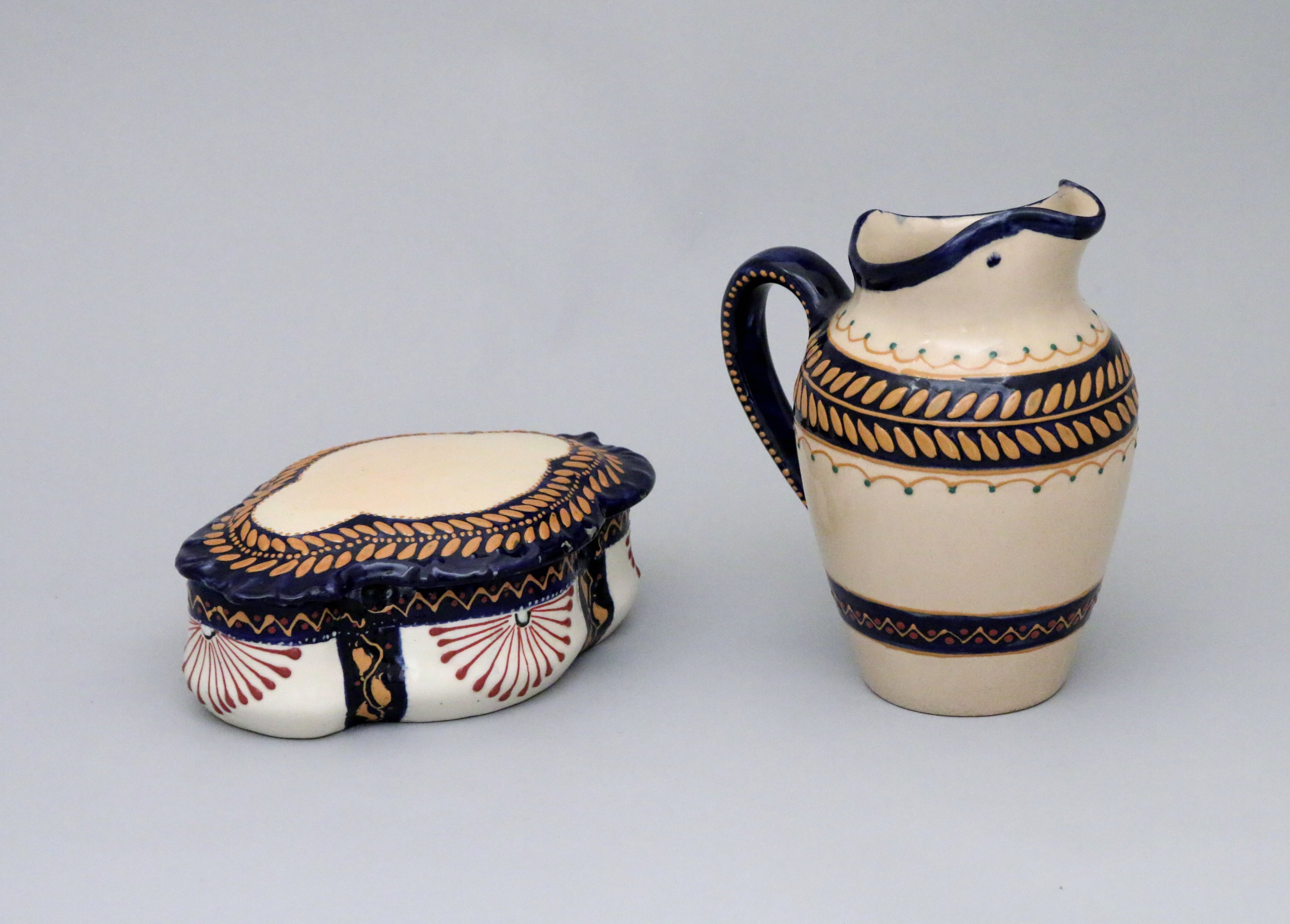 PICHET en faïence décor de feuilles et motifs bigoudens. Marque HB Quimper. Haut. 15,5 Larg. 16 cm.