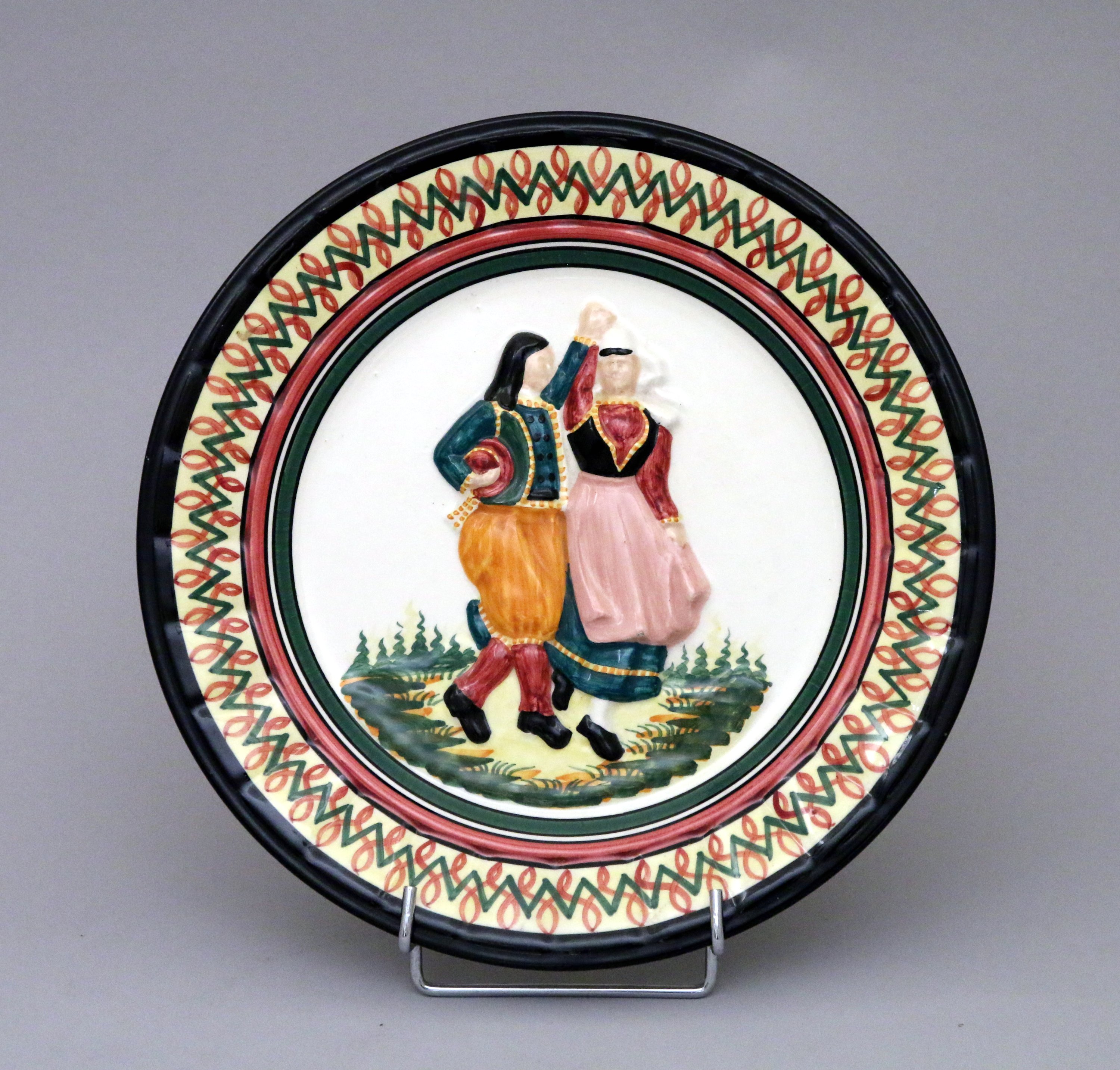 en faïence, à décor polychrome en léger relief d'un couple de danseurs bretons, l'aile festonnée à motifs d'entrelacs.