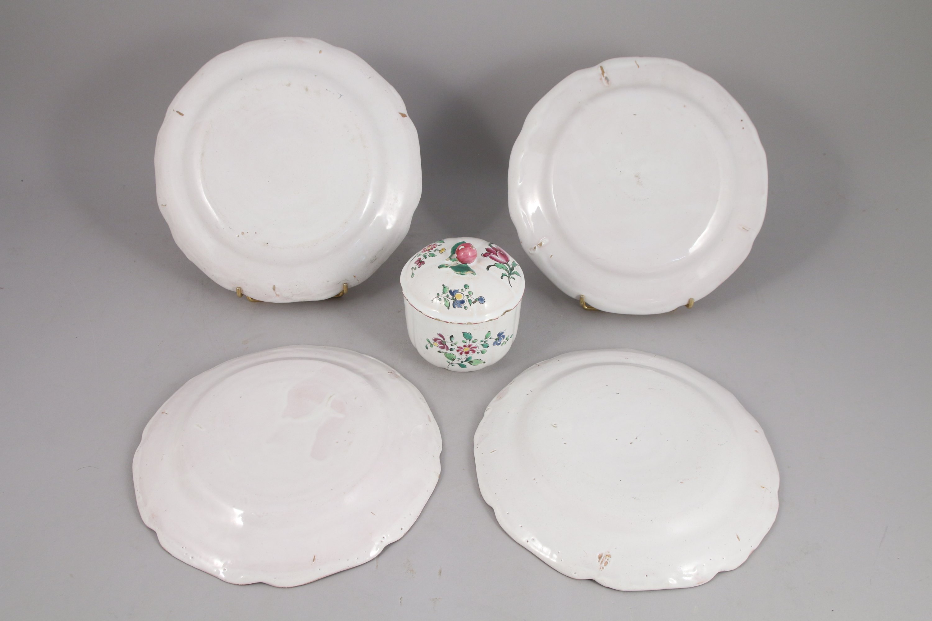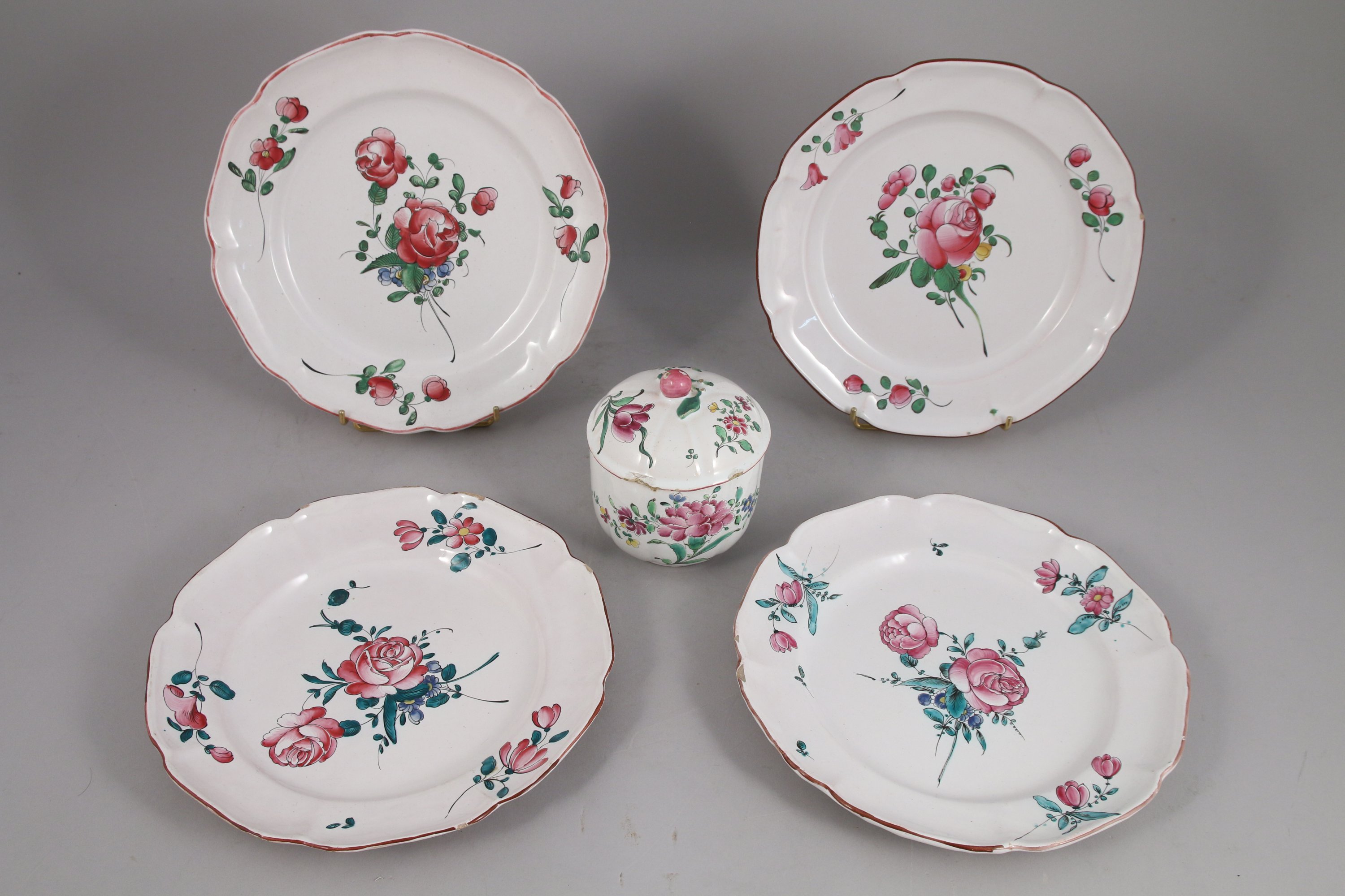 quatre assiettes et un pot couvert en faïence à décor polychrome de fleurs et feuillage.