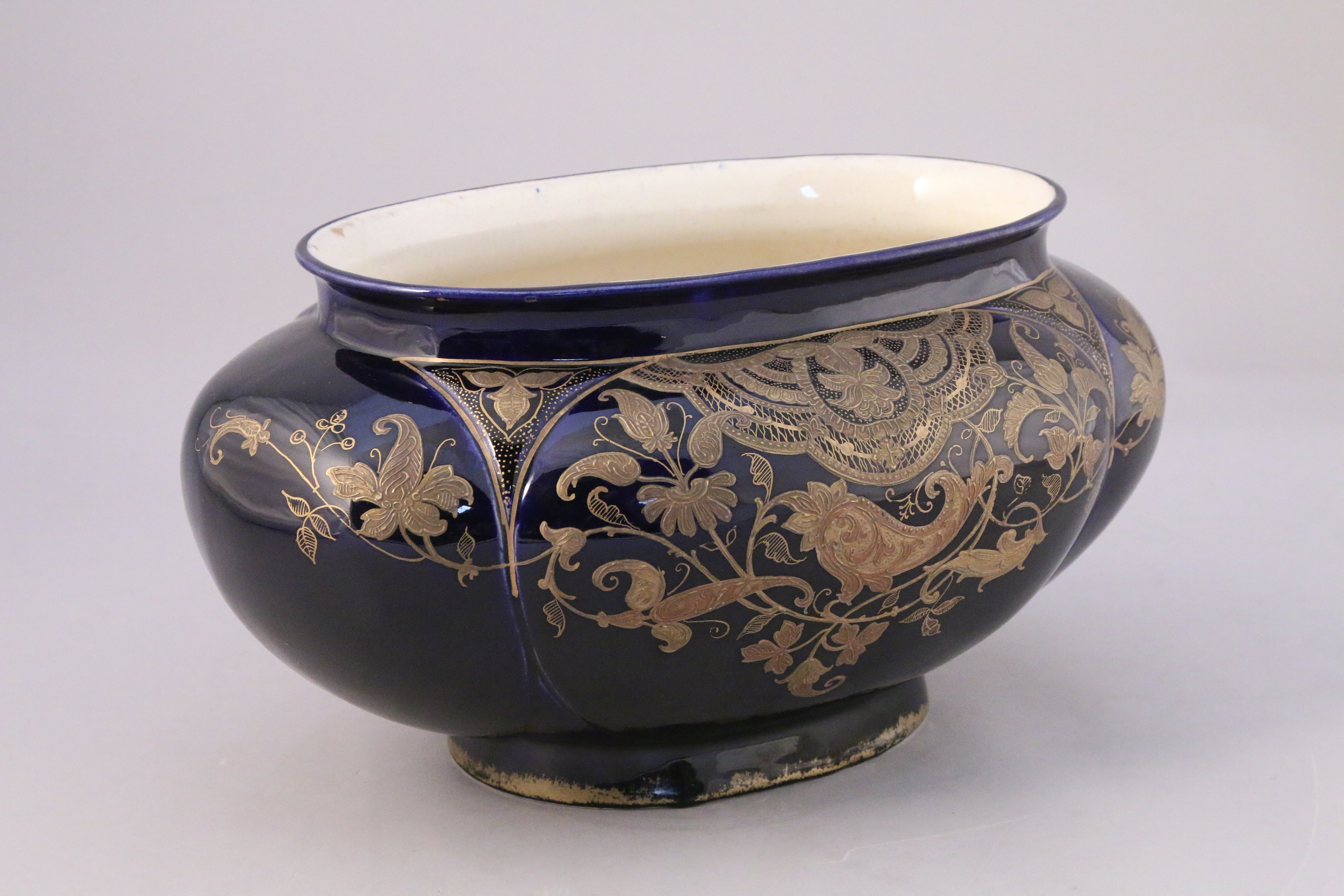 en faïence à décor sur fond bleu intense d'un motif de rinceaux feuillagés.