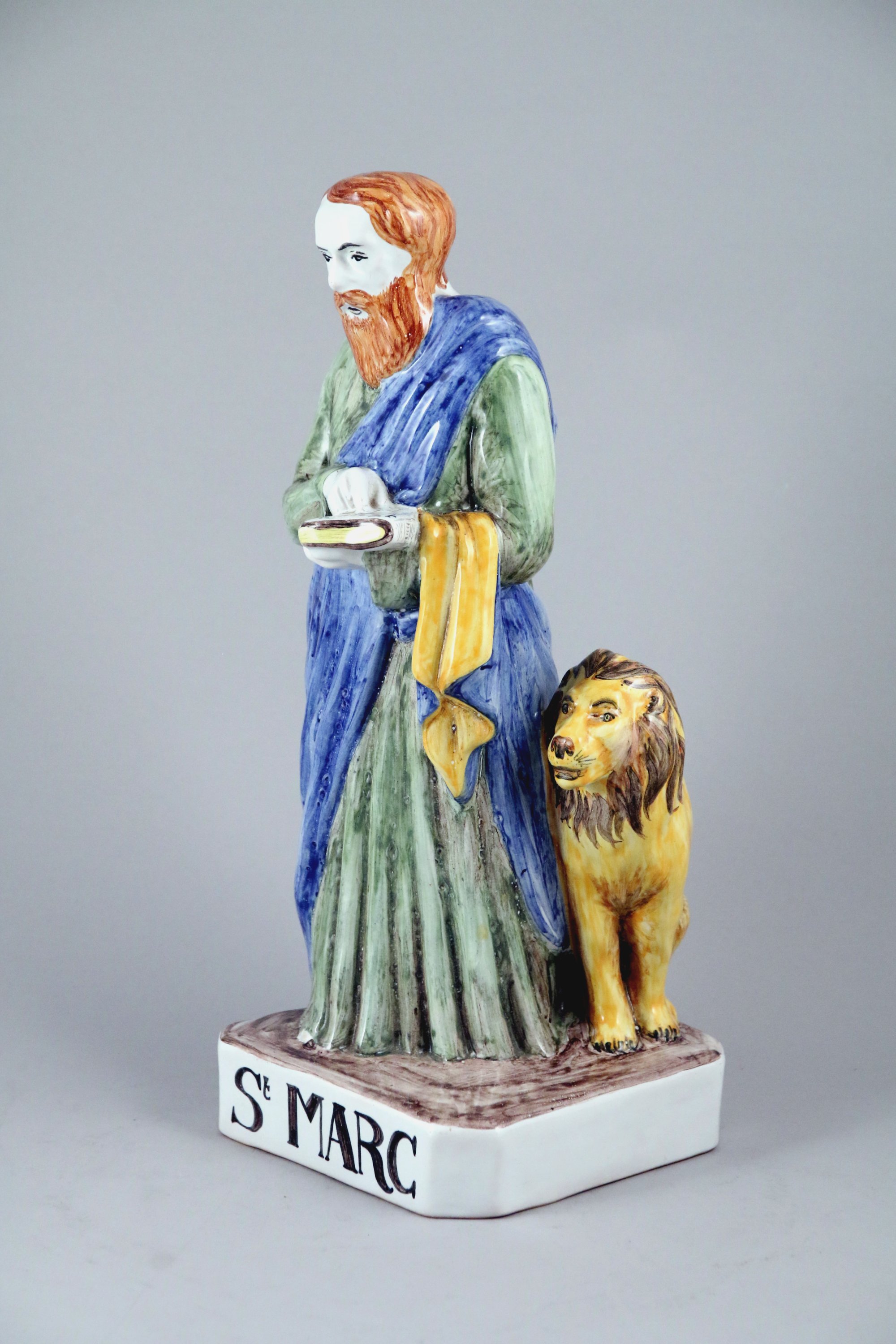 STATUETTE en faïence polychrome figurant Saint Marc debout tenant dans ses mains l'évangile portant l'inscription "Evangilis" le lion assis près de lui. Inscription "St MARC" sur la terrasse.