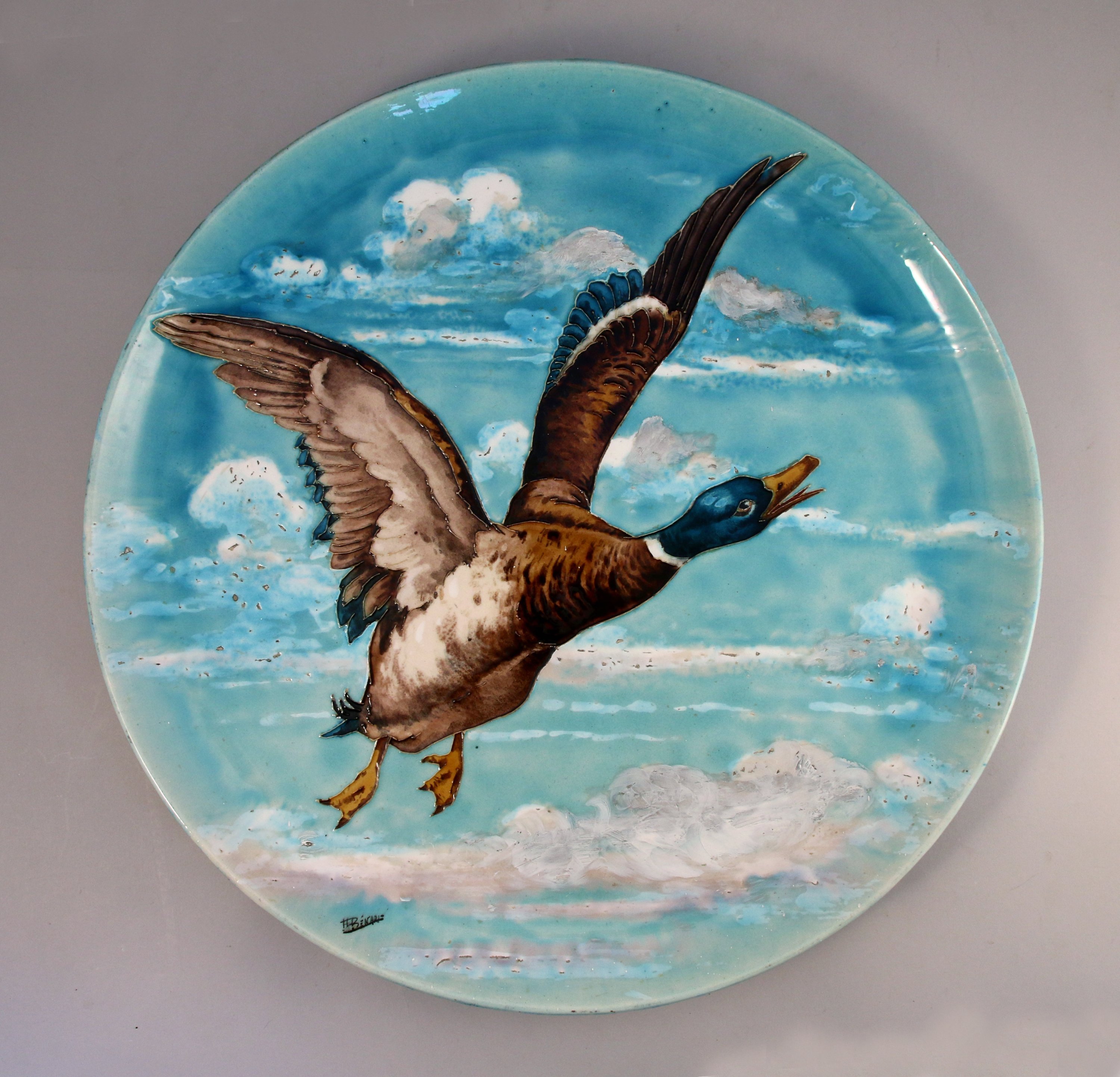 Important PLAT en faience émaillée au canard col vert volant sur fond de ciel aux nuages peints par réhaut de blanc.