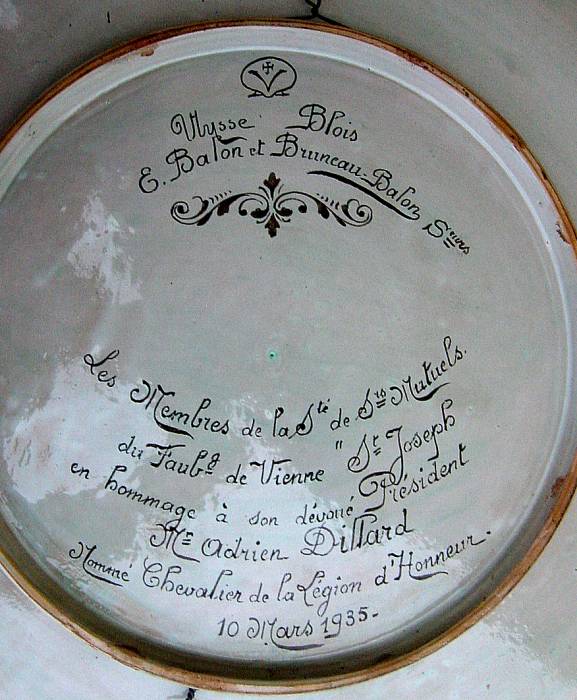 Signé au revers "Ulysse Blois E. Balon et Bruneau-Balon, Les membres de la sté de Srs Mutuels du Faubg de Vienne "St Joseph en hommage à son dévoué Président M Adrien Dillard Nommé Chevalier de la L2gion d'Honneur. 10 mars 1935."