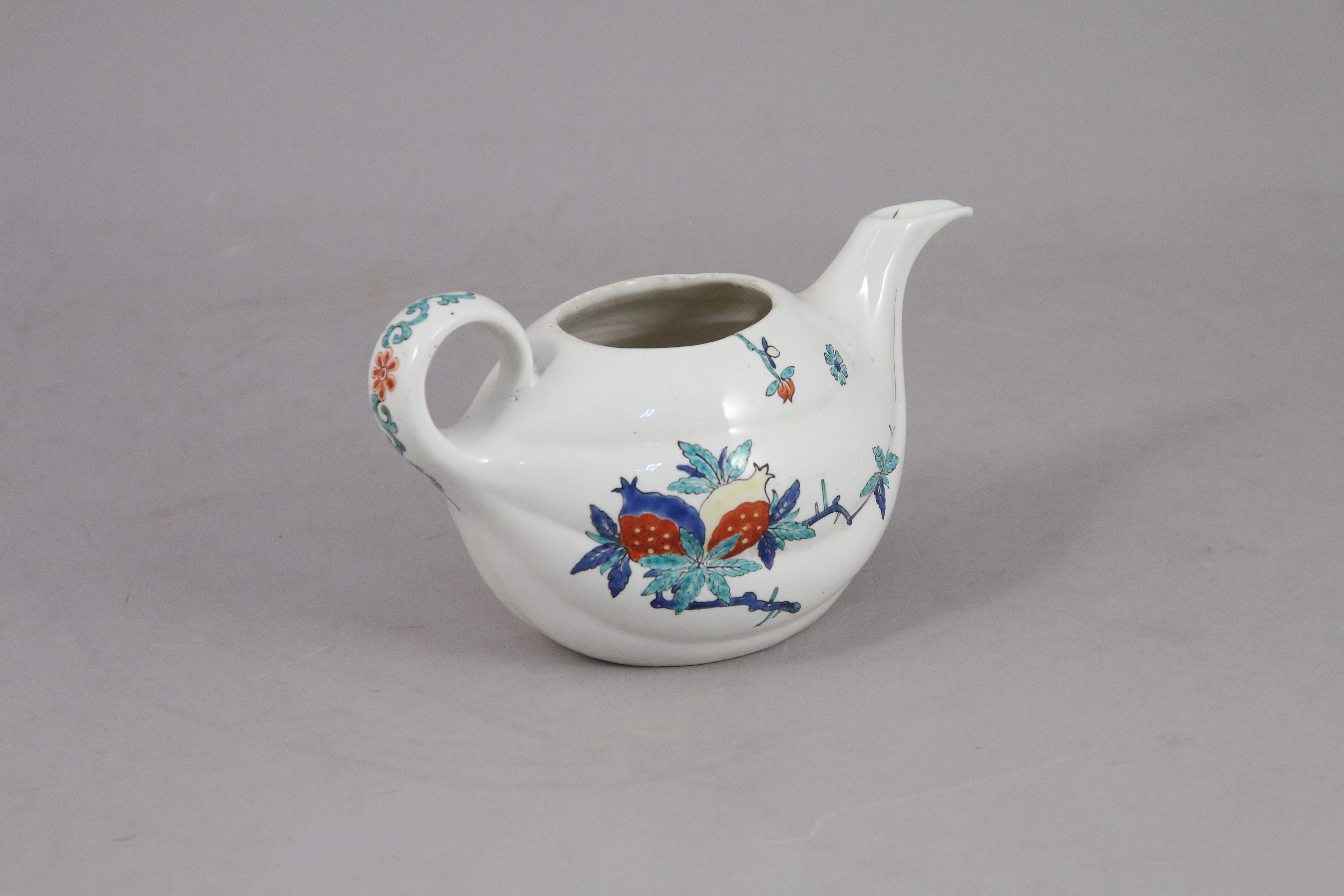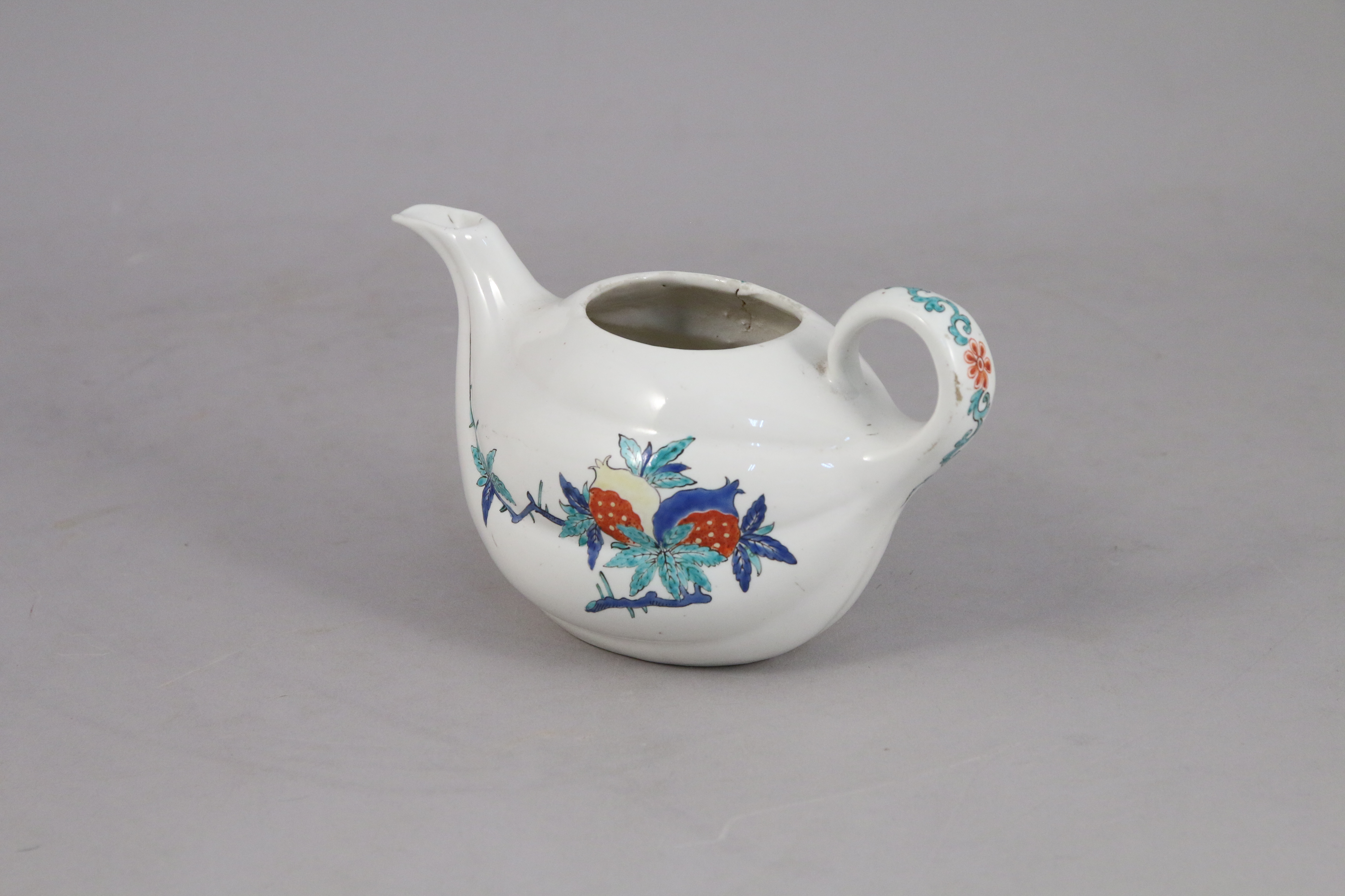 Petite théière en porcelaine tendre à émail stannifère en fome de melon à côtes. Décor dans le style Kakiemon de branchages fleuris et de fruits.