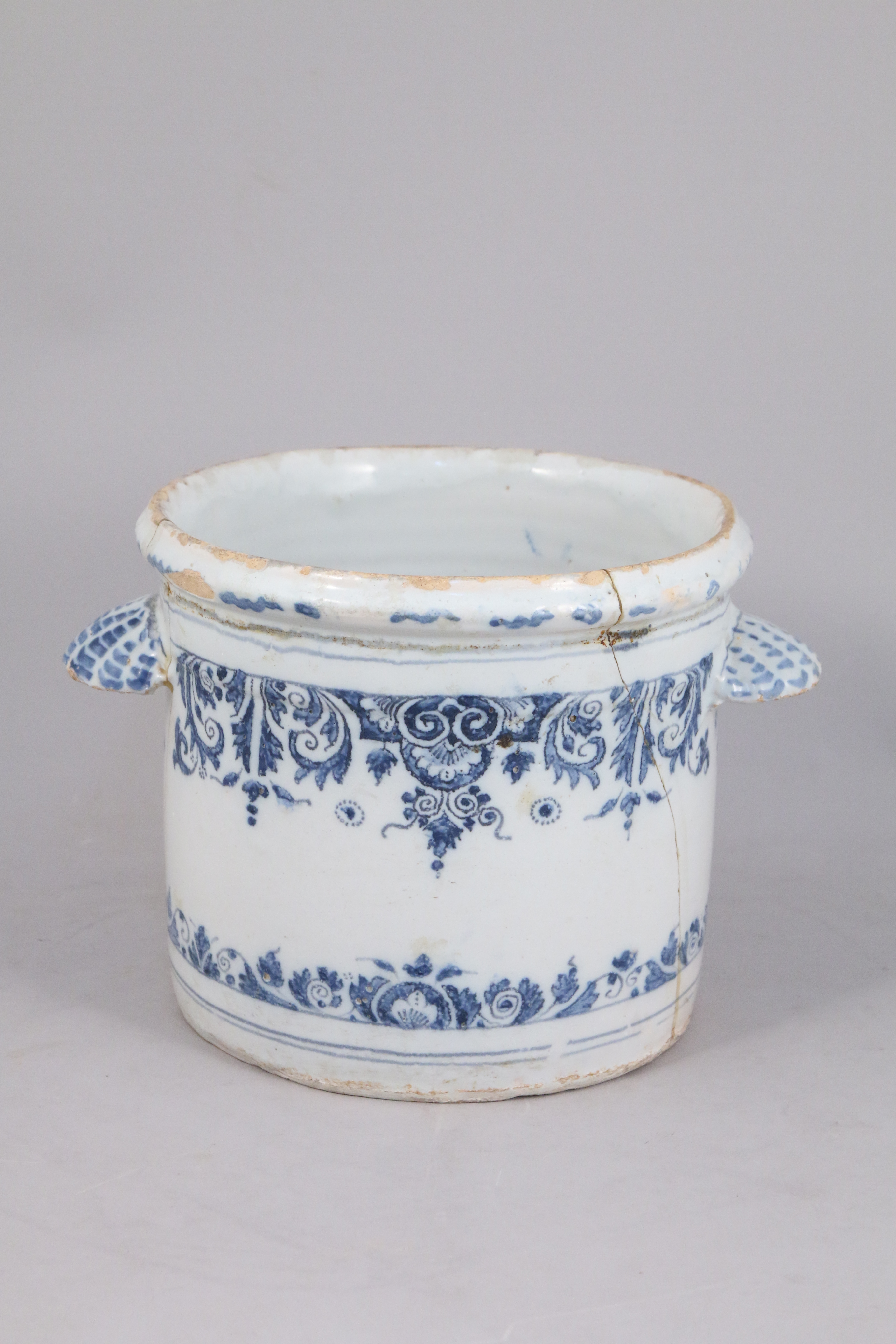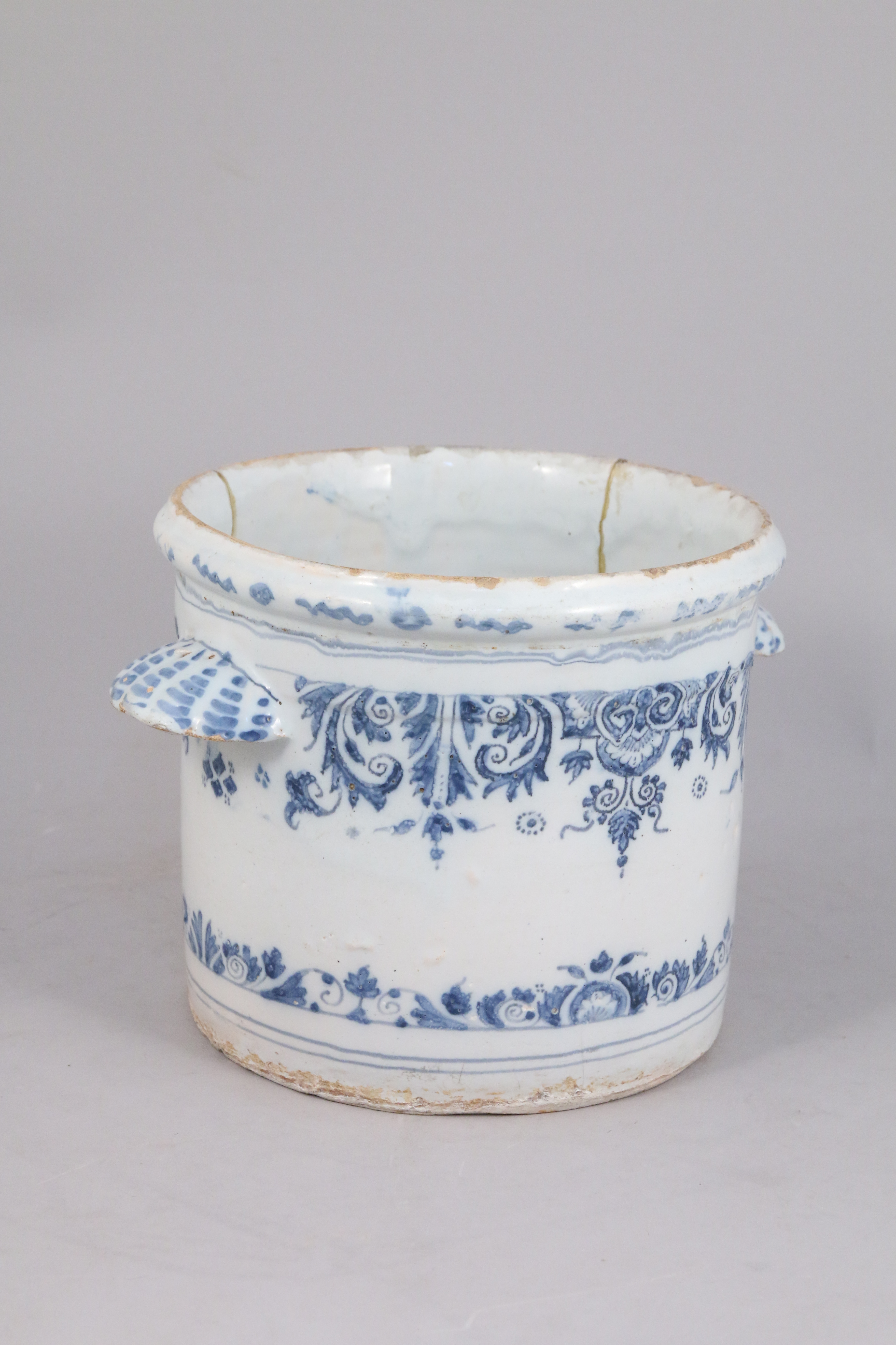 ROUEN XVIIIe ? Rafraîchissoir à bouteille en bleu et blanc à décor de lambrequins. Anses coquilles.
