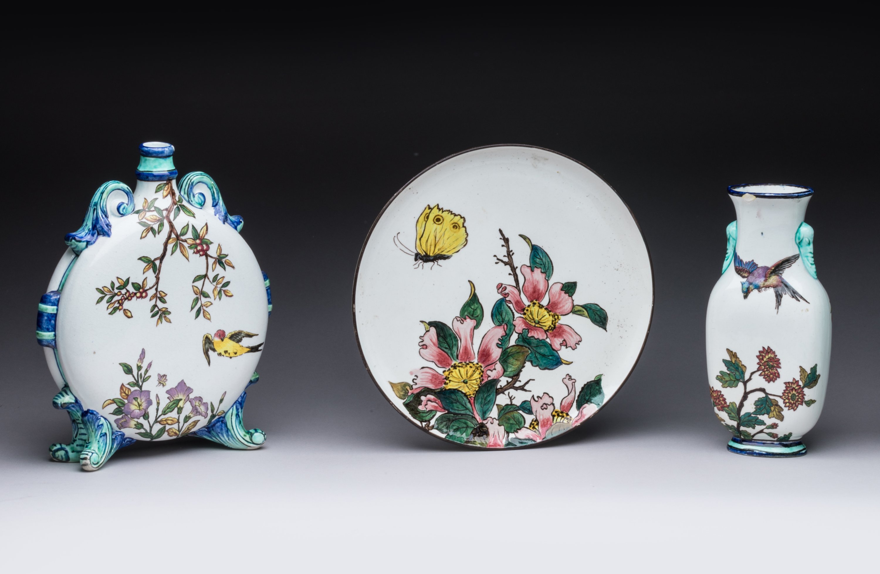 Une GOURDE aux oiseaux siffleurs, une ASSIETTE au papillon et un VASE monogrammé de Jehanne GONDOUIN (1851-1942)