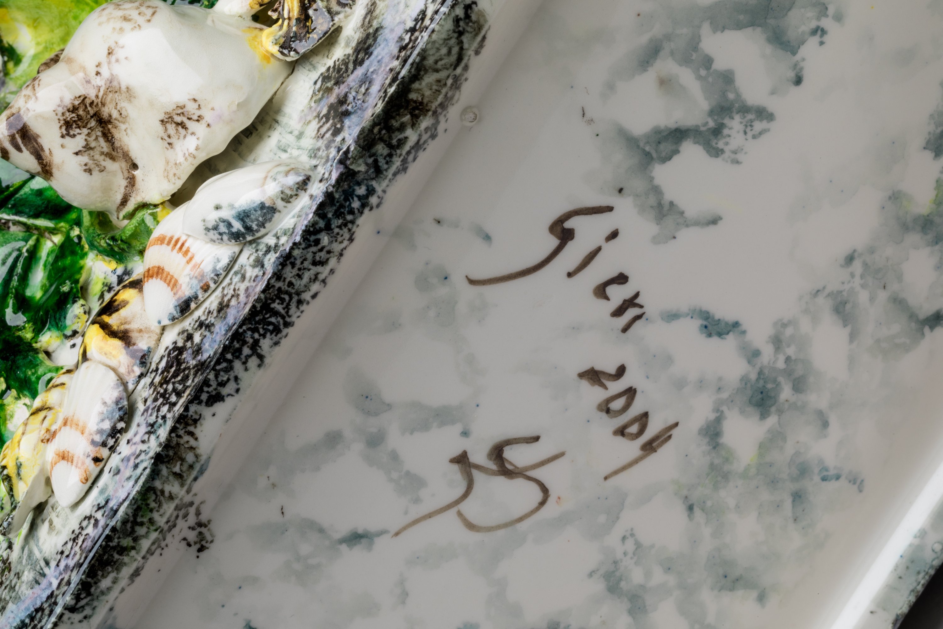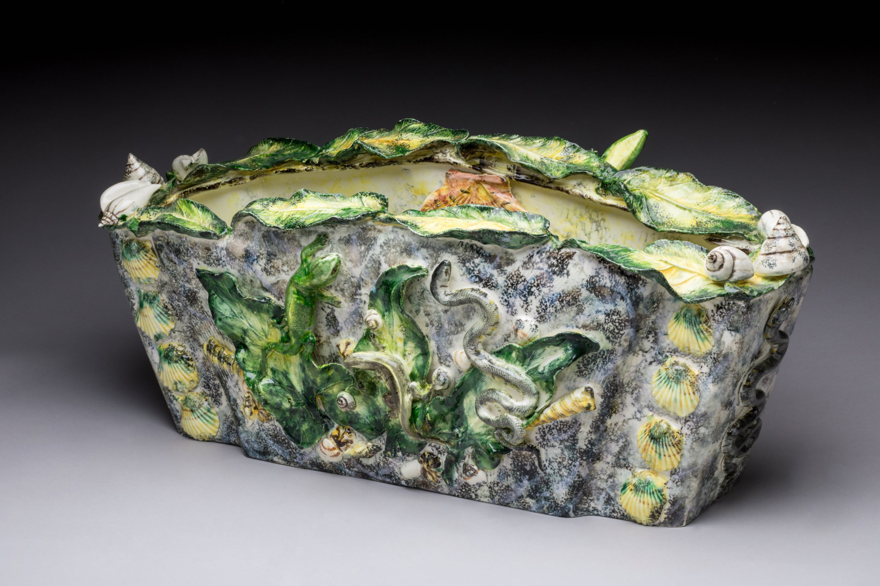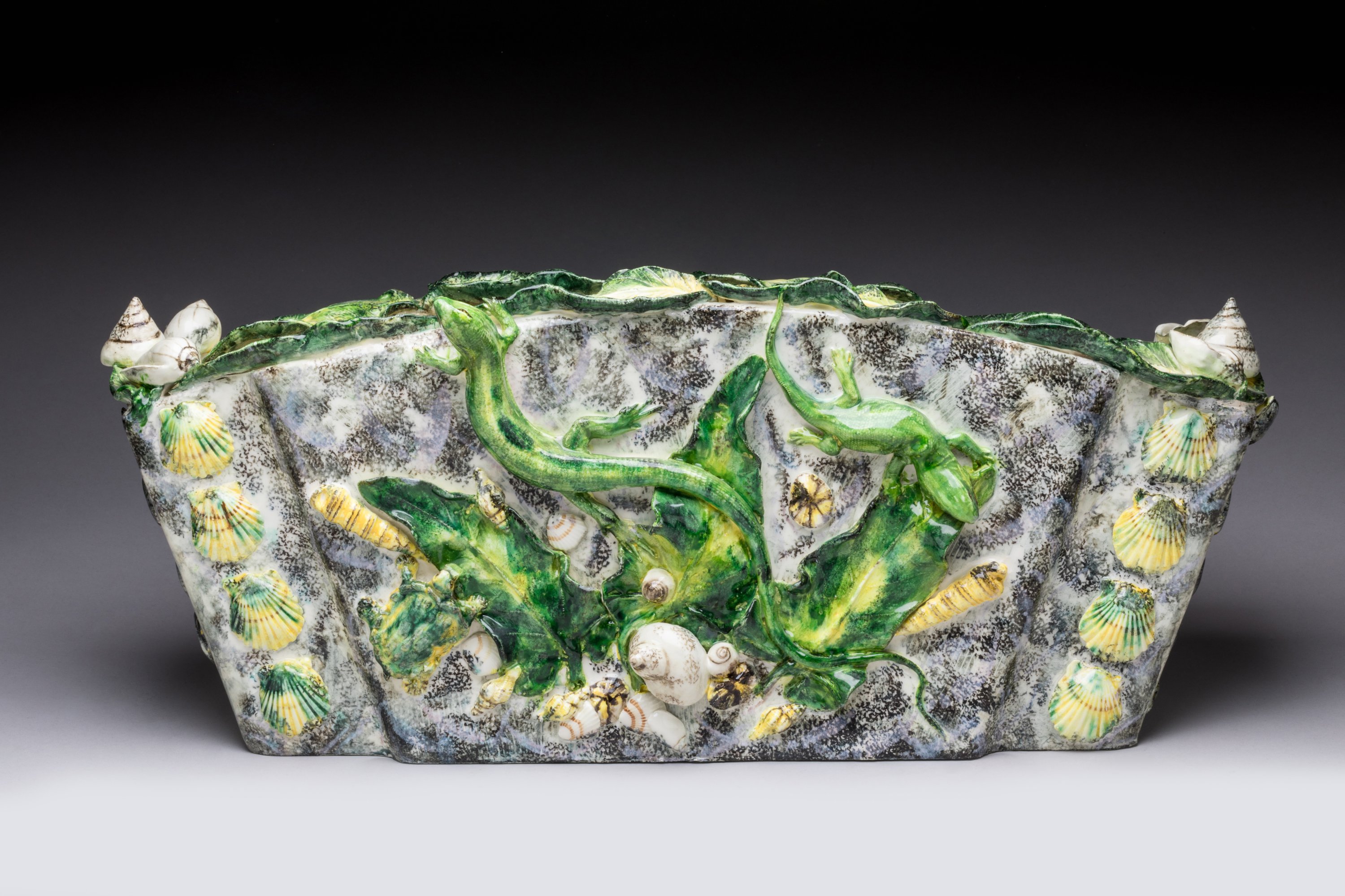 en barbotine émaillée, appliquée de coquillages, serpents, salamandres, tortues, et feuillages.