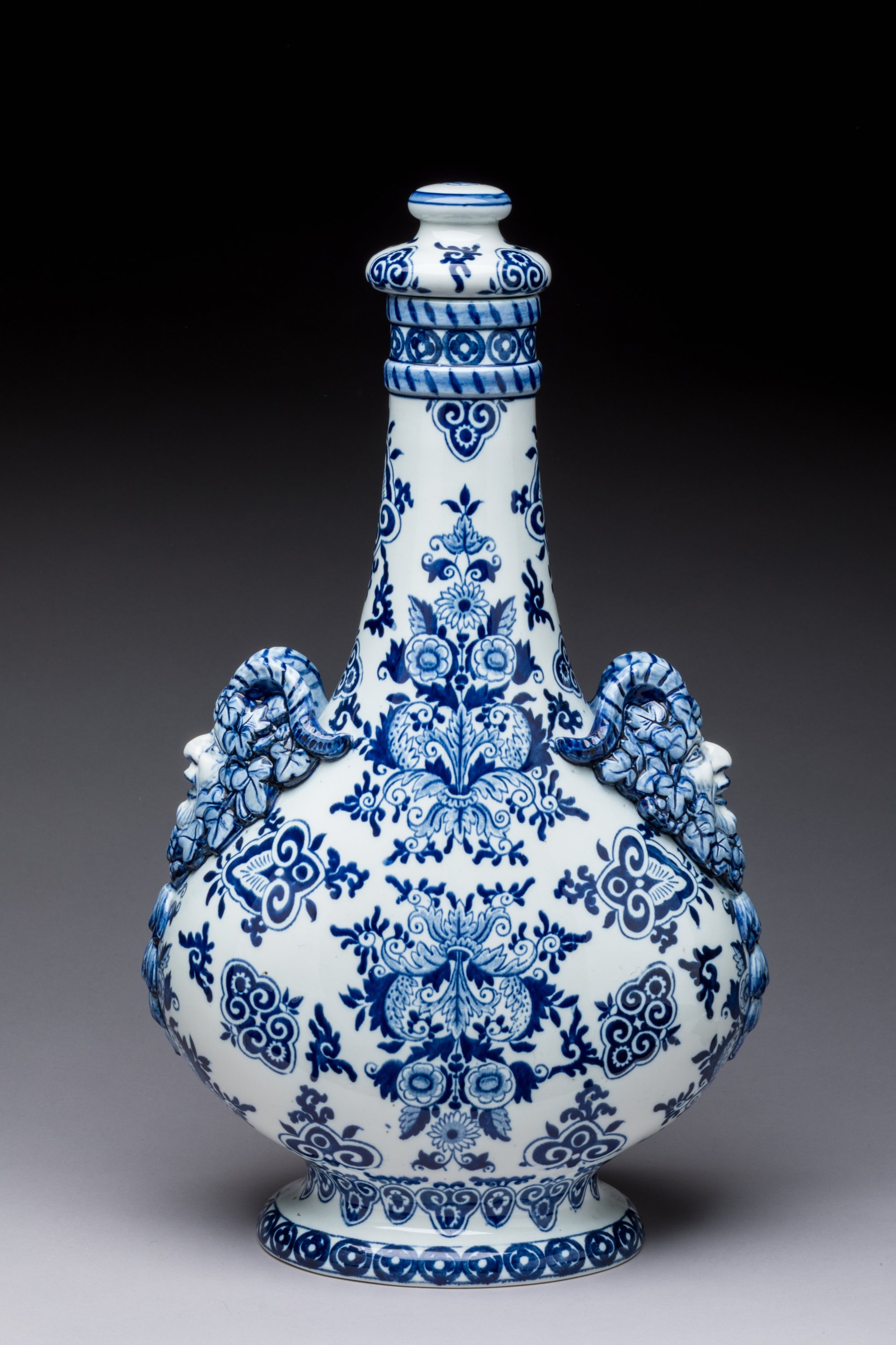 en céramique émaillée à décor de rinceaux, dit en Delft bleu.