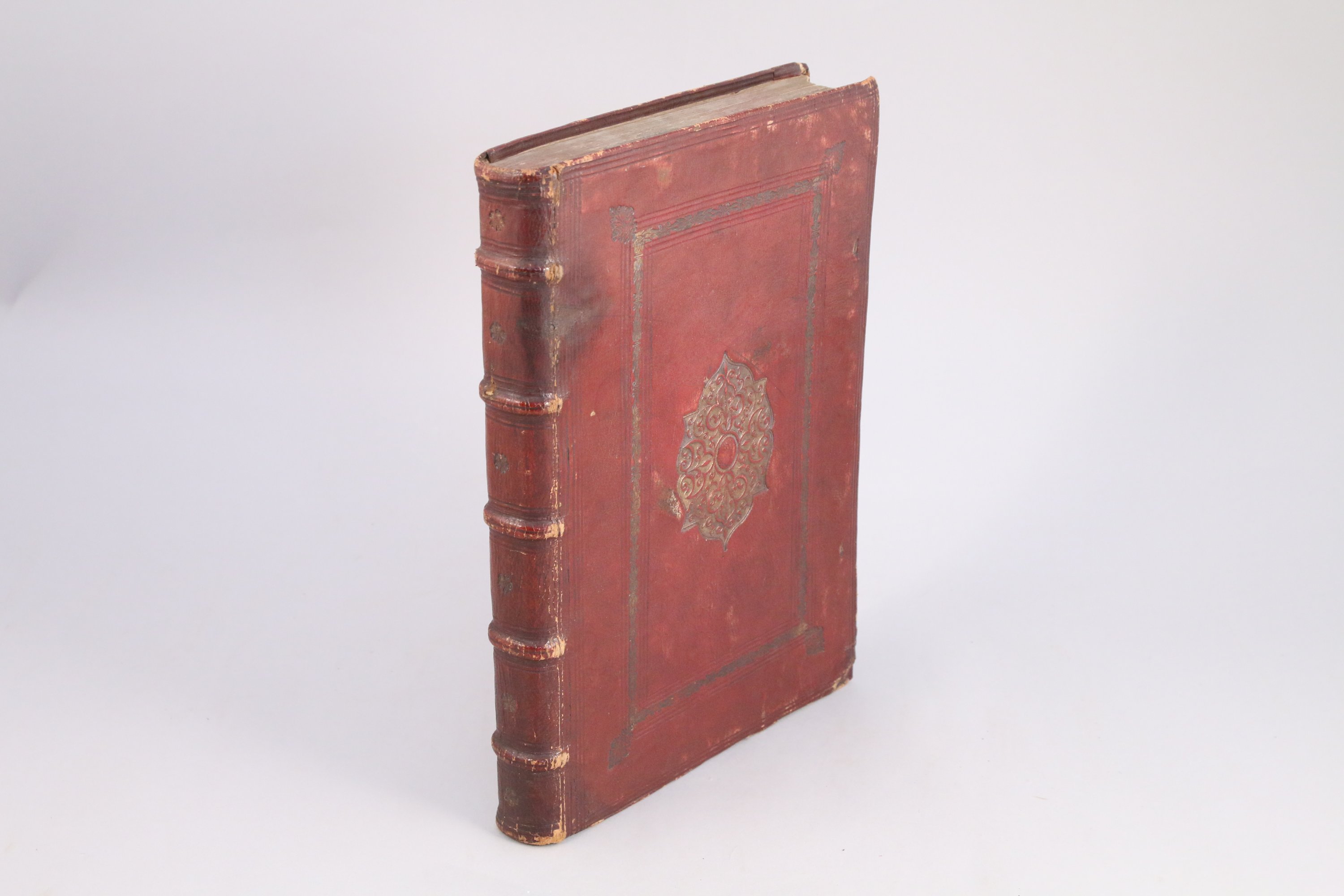 In-folio (305 mm X 205 mm). (12 feuillets), 288 pages, (22 feuillets). Plein maroquin du Levant bordeaux, encadrements de filets à froid et d'une roulette dorée ; large décor doré d'arabesques au centre des plats. Reliure du temps. (Les ors de la roulette et des fleurons d'angle sont effacés ; deux coins légèrement endommagés ; frottis sur les nerfs au niveau des mors).