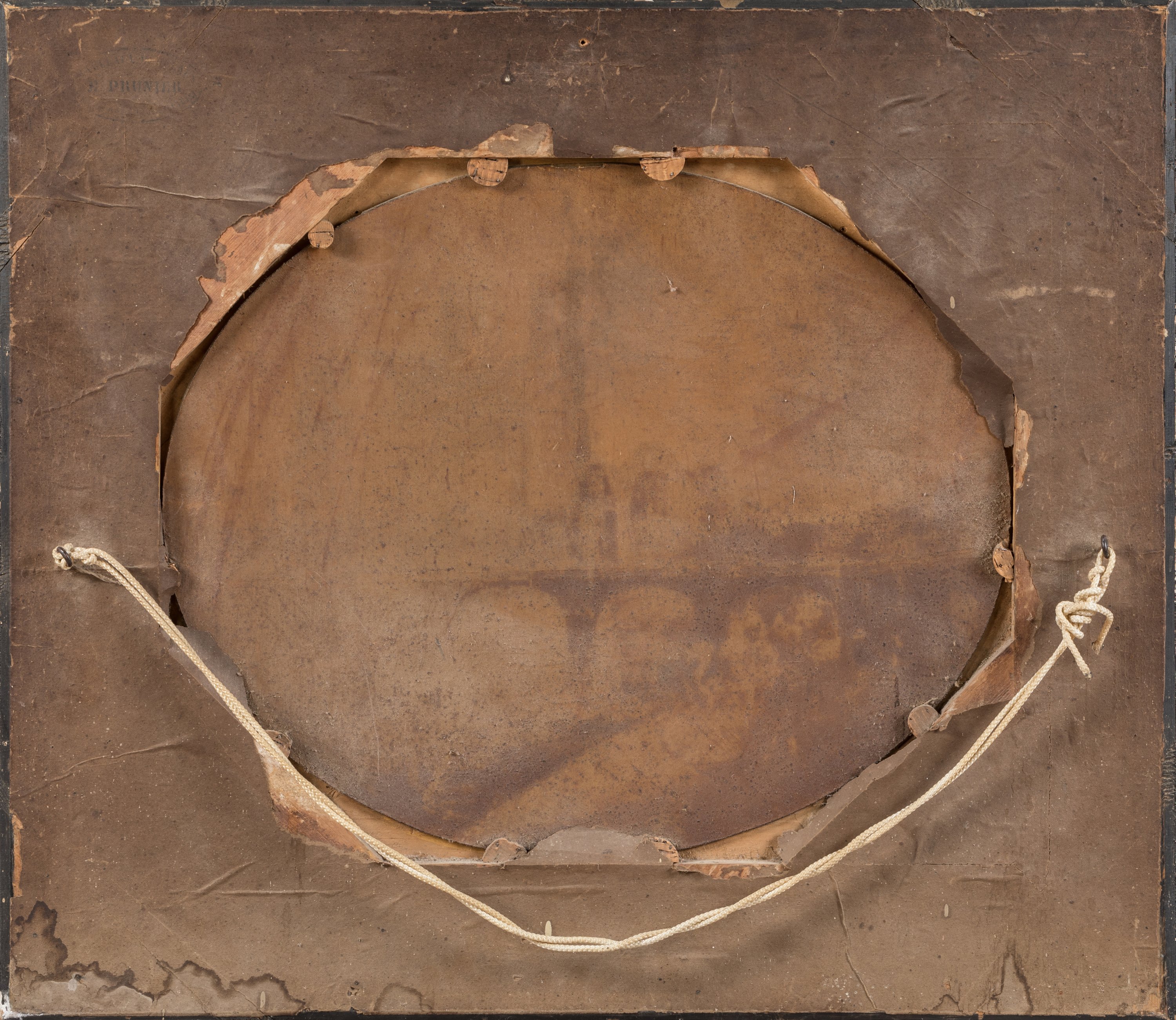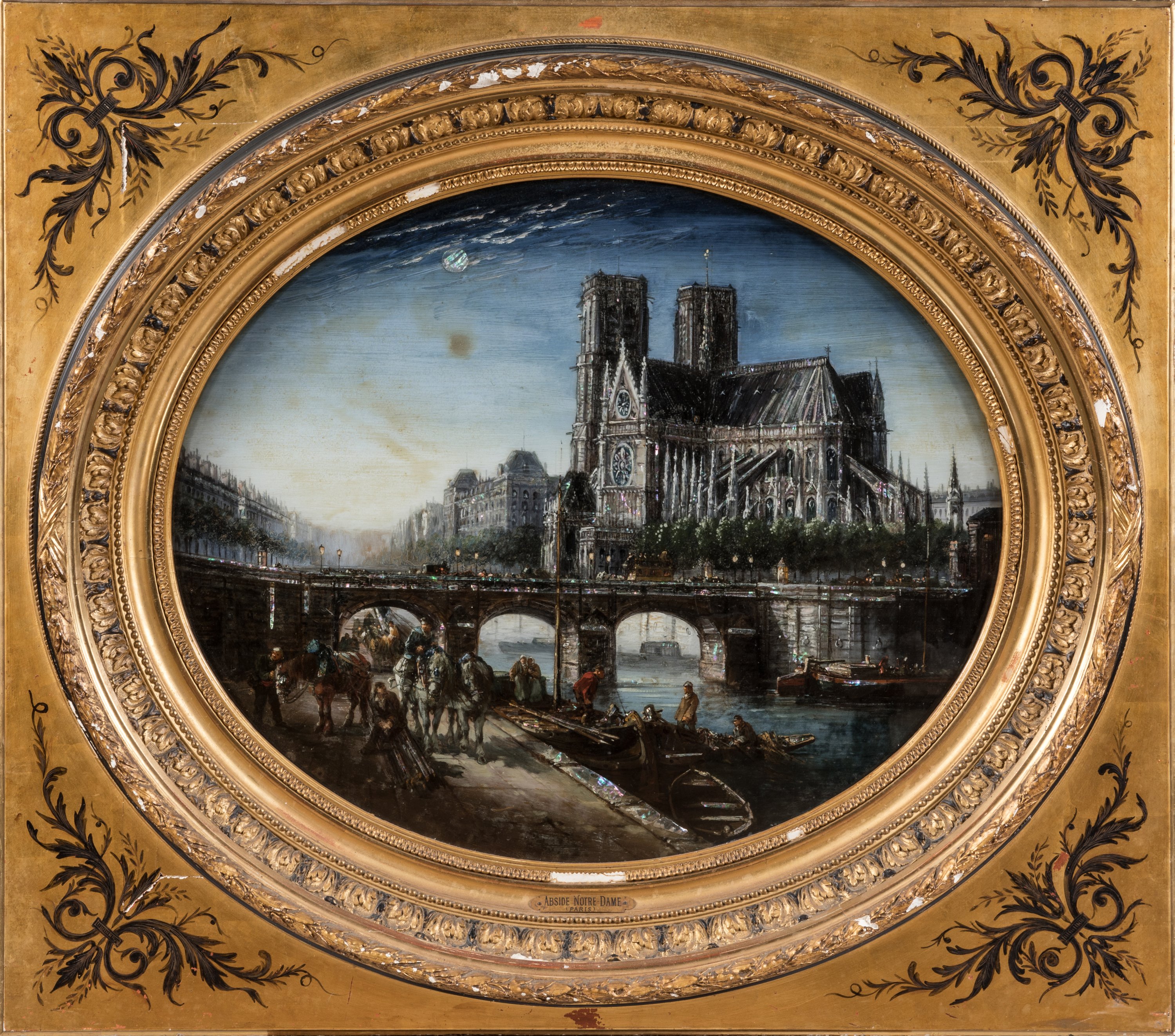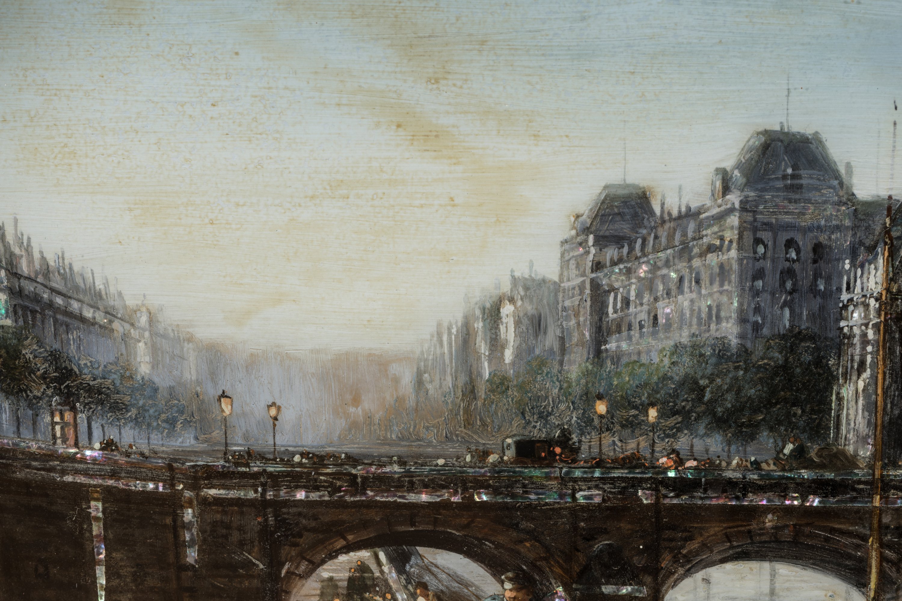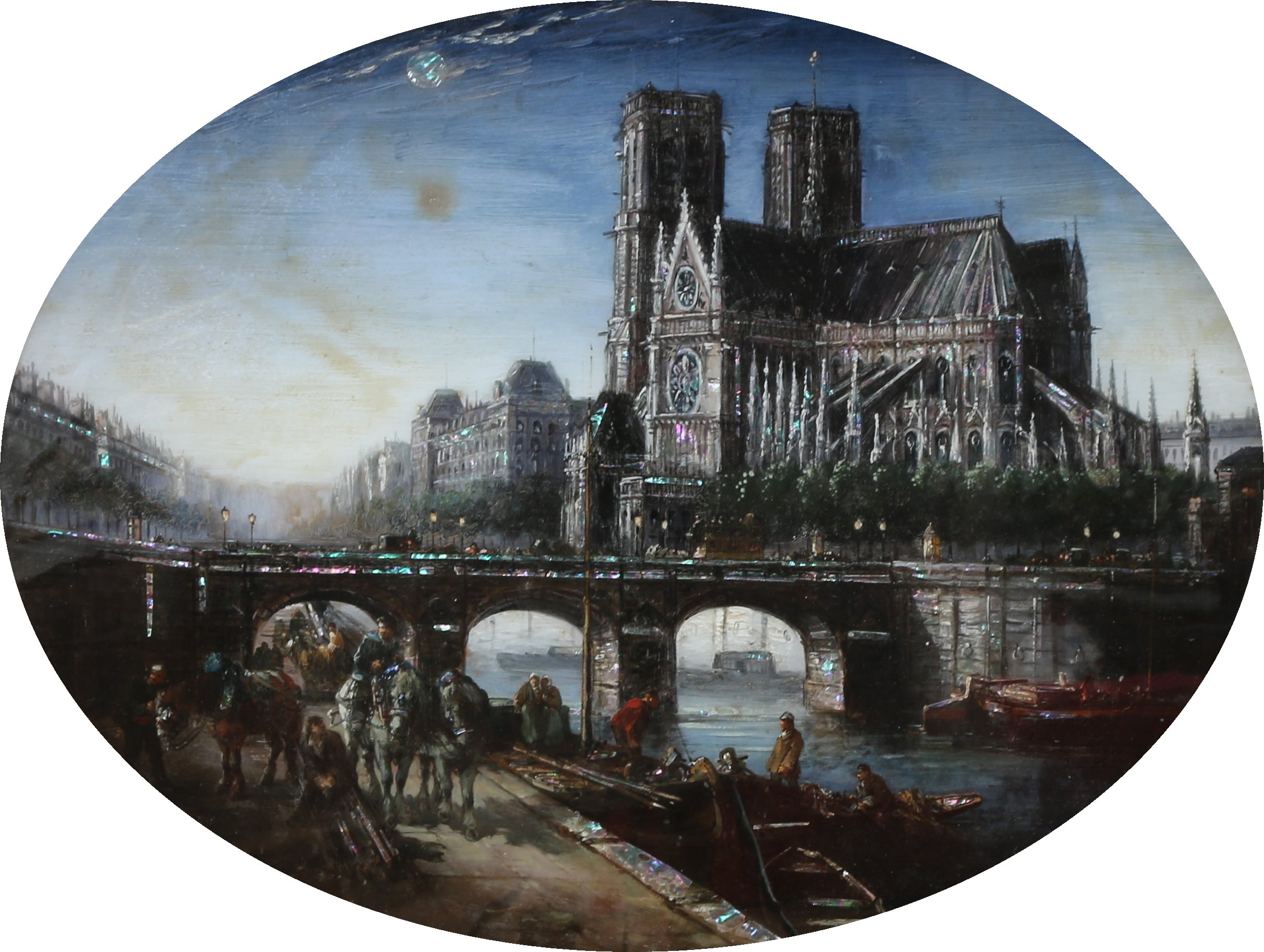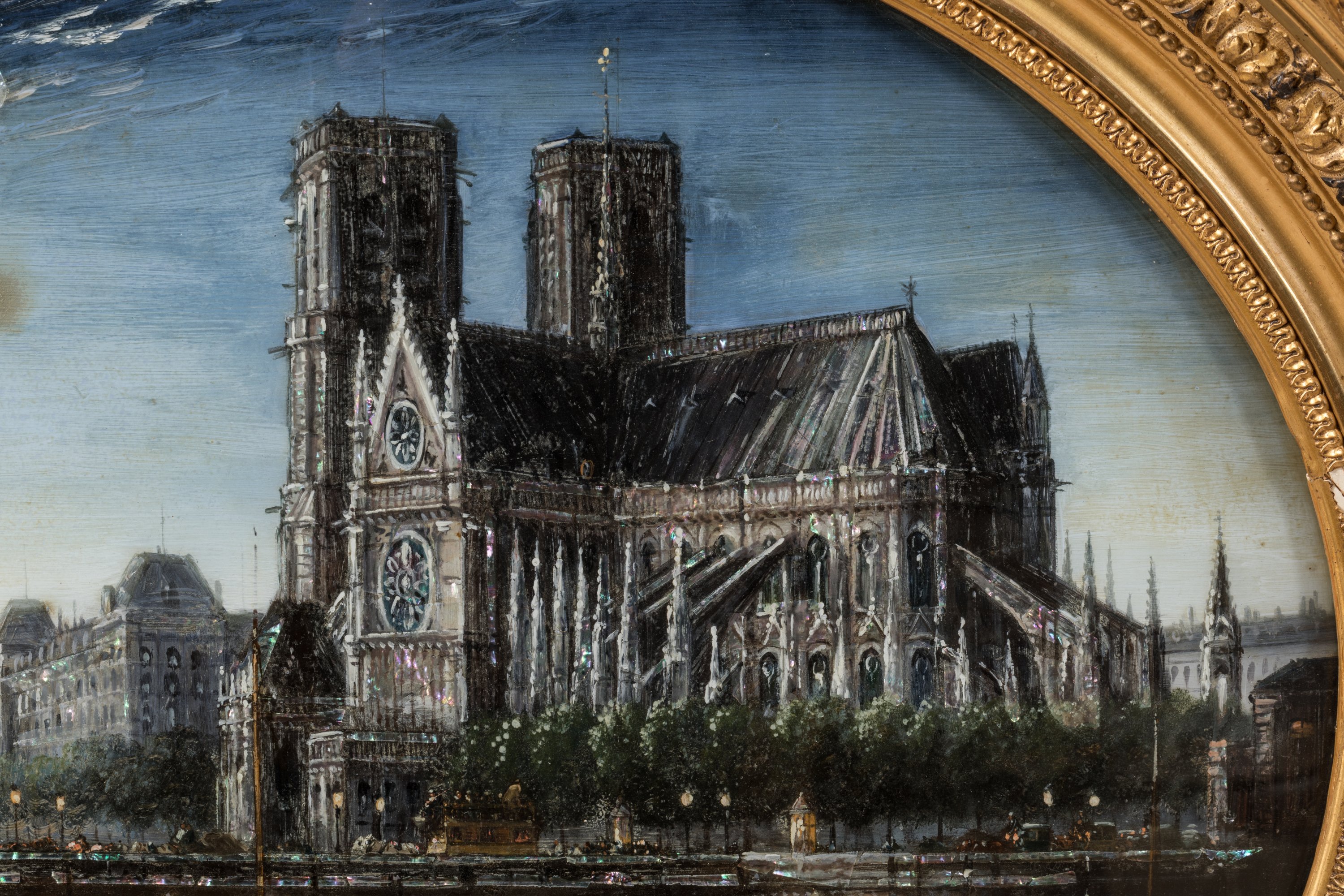Fixé sous verre avec incrustations de nacre, format ovale.