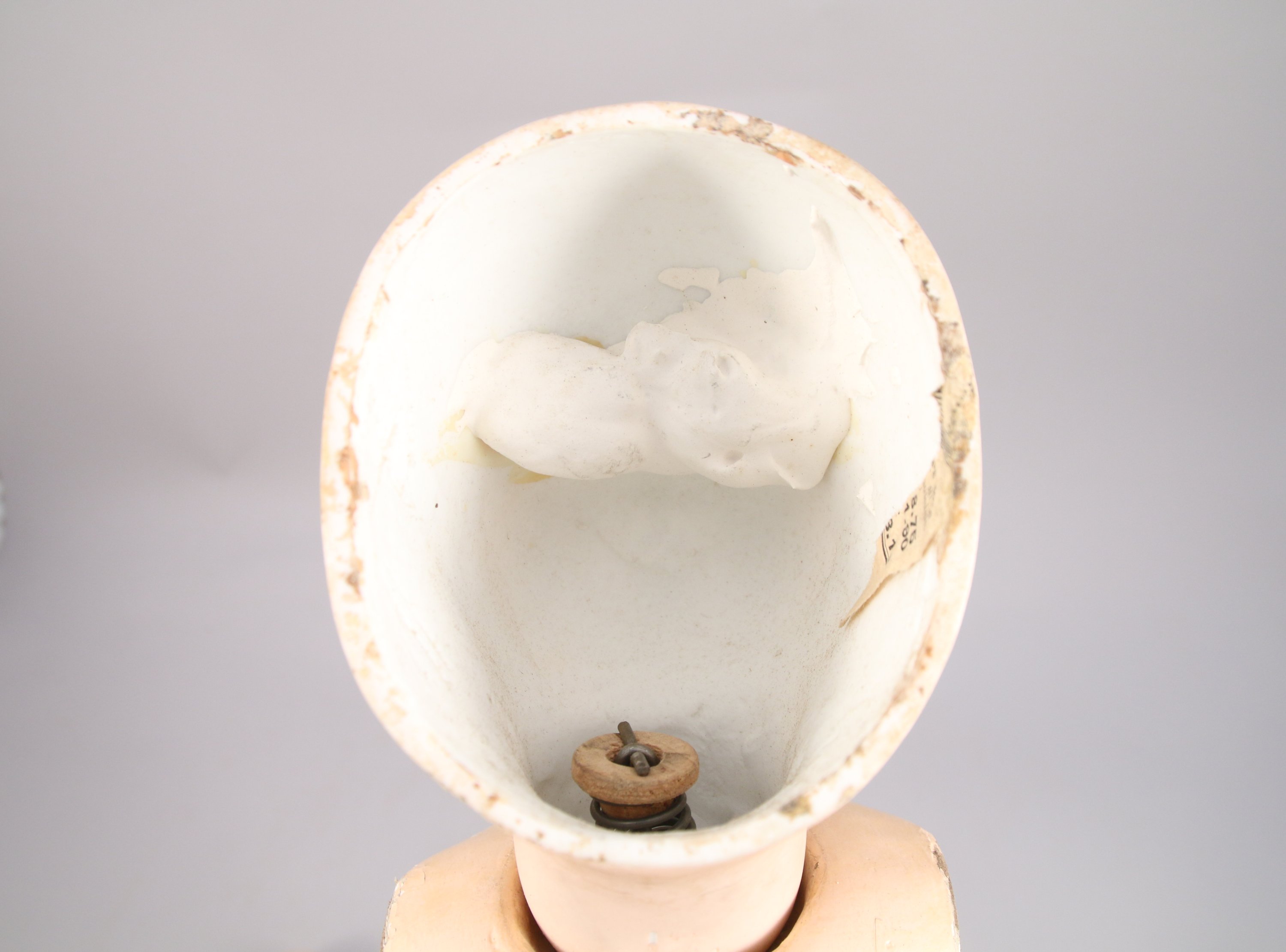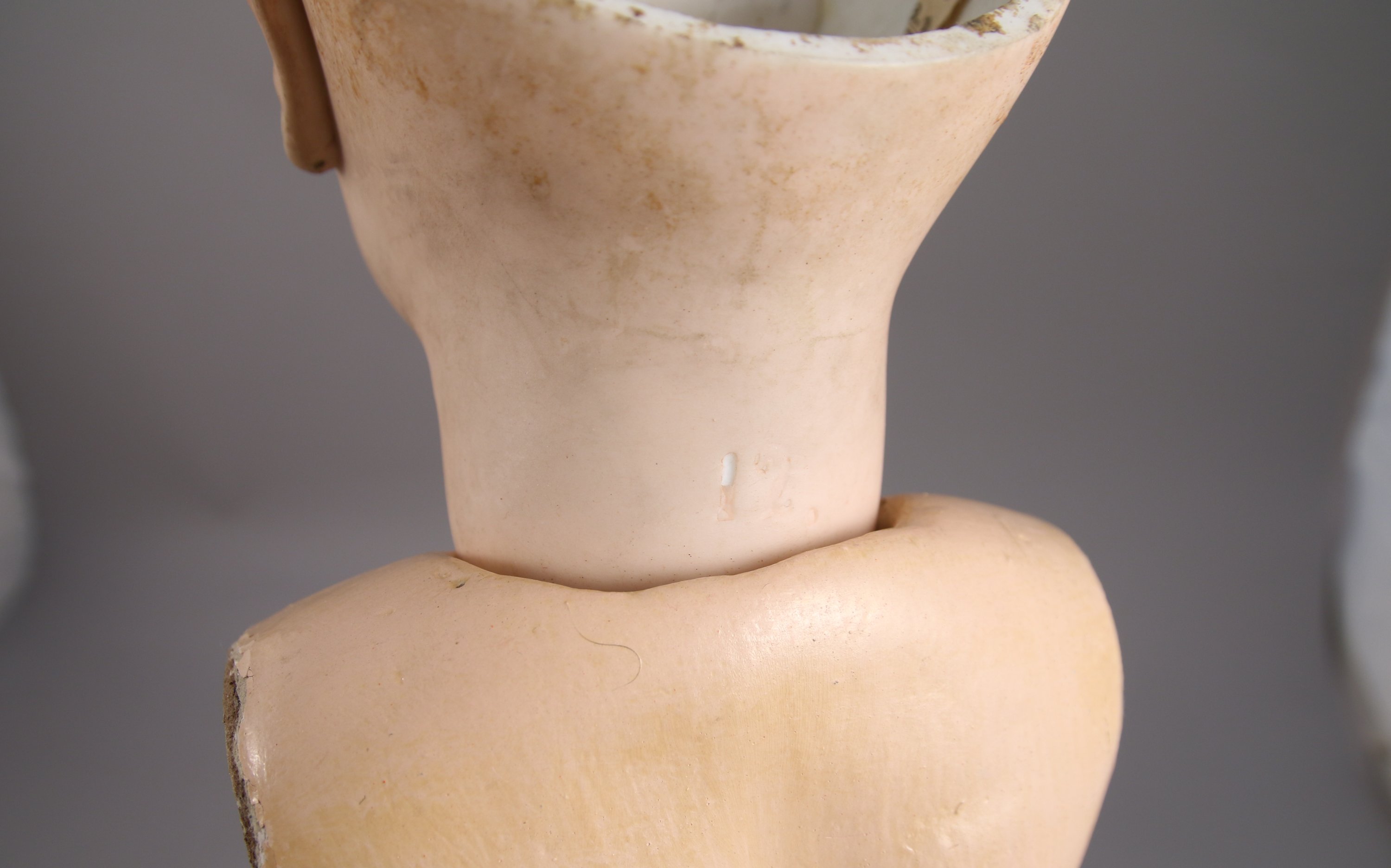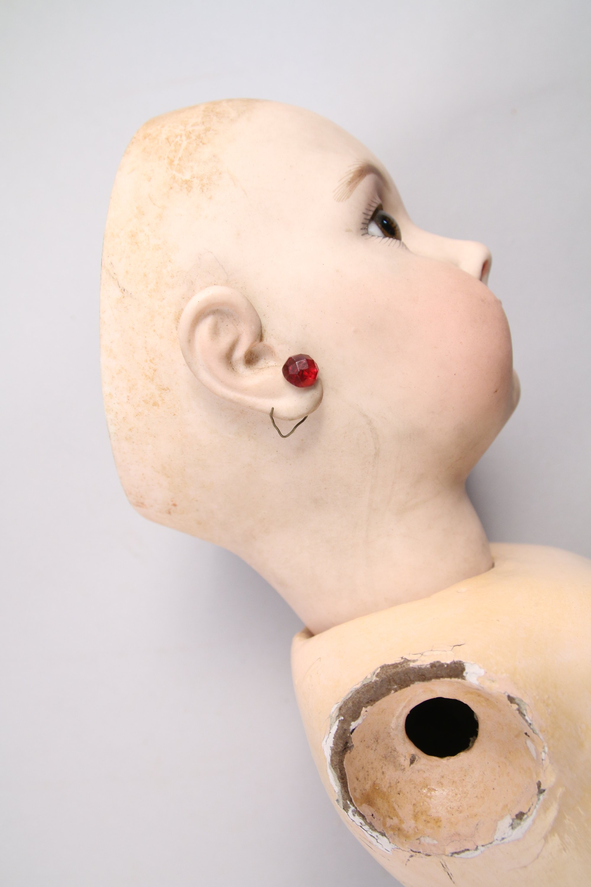 La tête en biscuit non signée, bouche fermée et yeux fixes marrons, les oreilles percées, marquée 12 en creux.