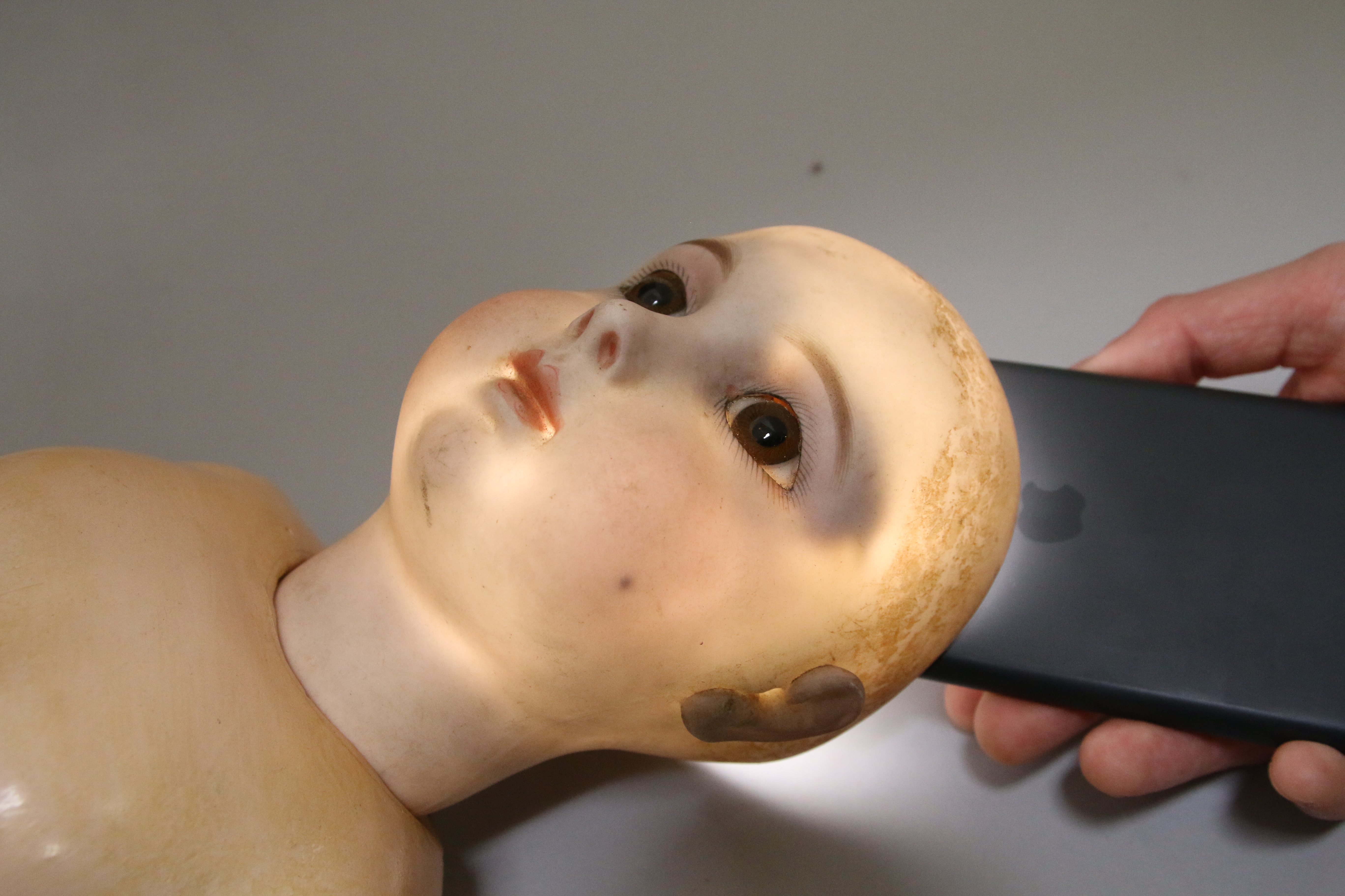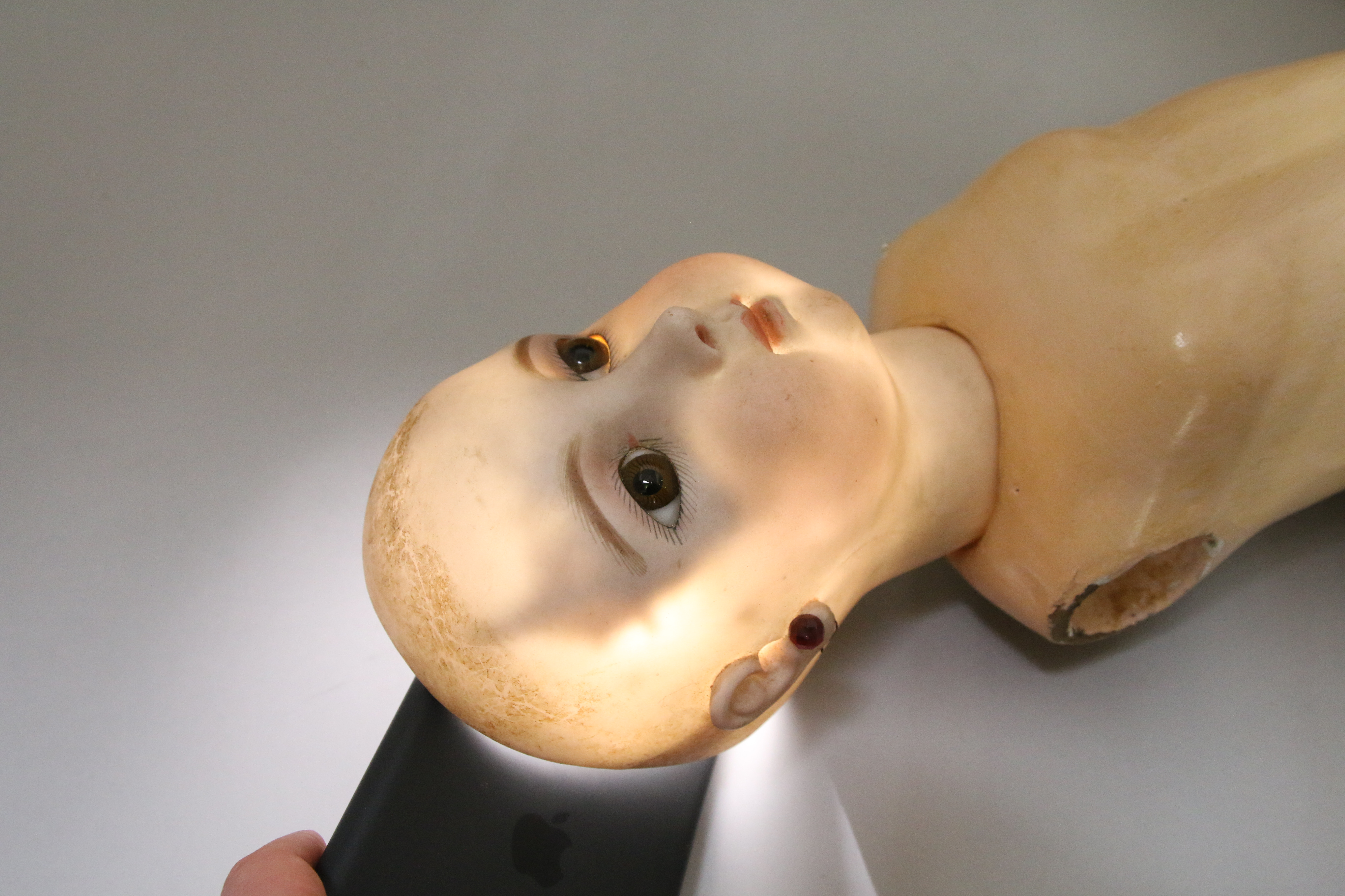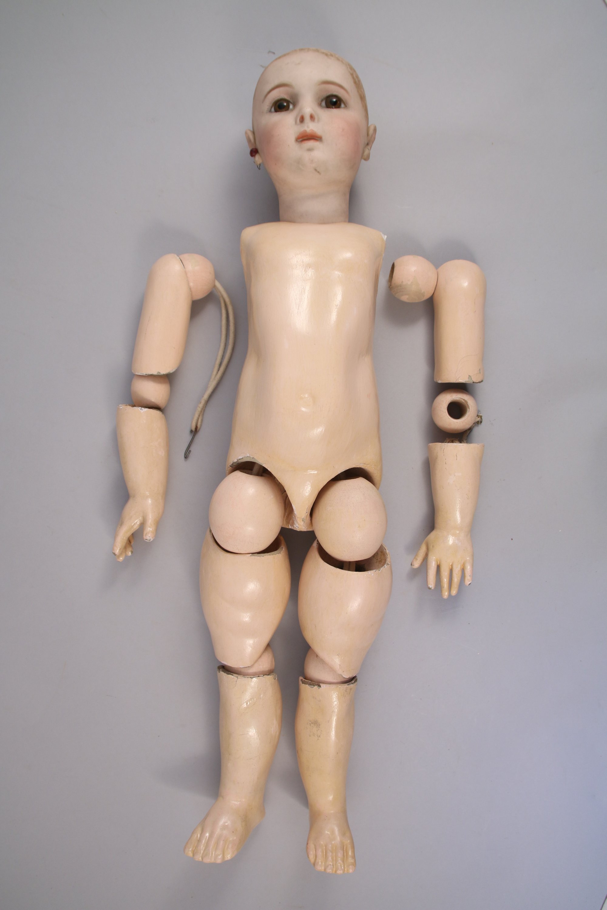 La tête en biscuit non signée, bouche fermée et yeux fixes marrons, les oreilles percées, marquée 12 en creux.