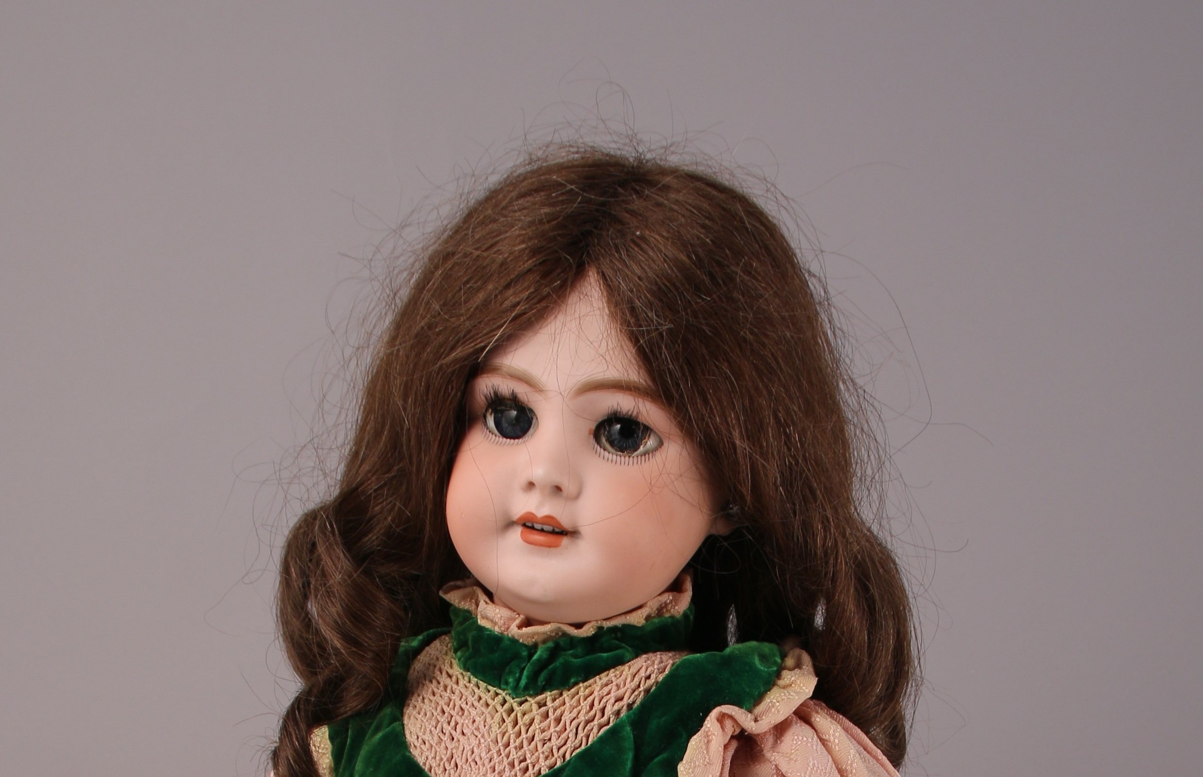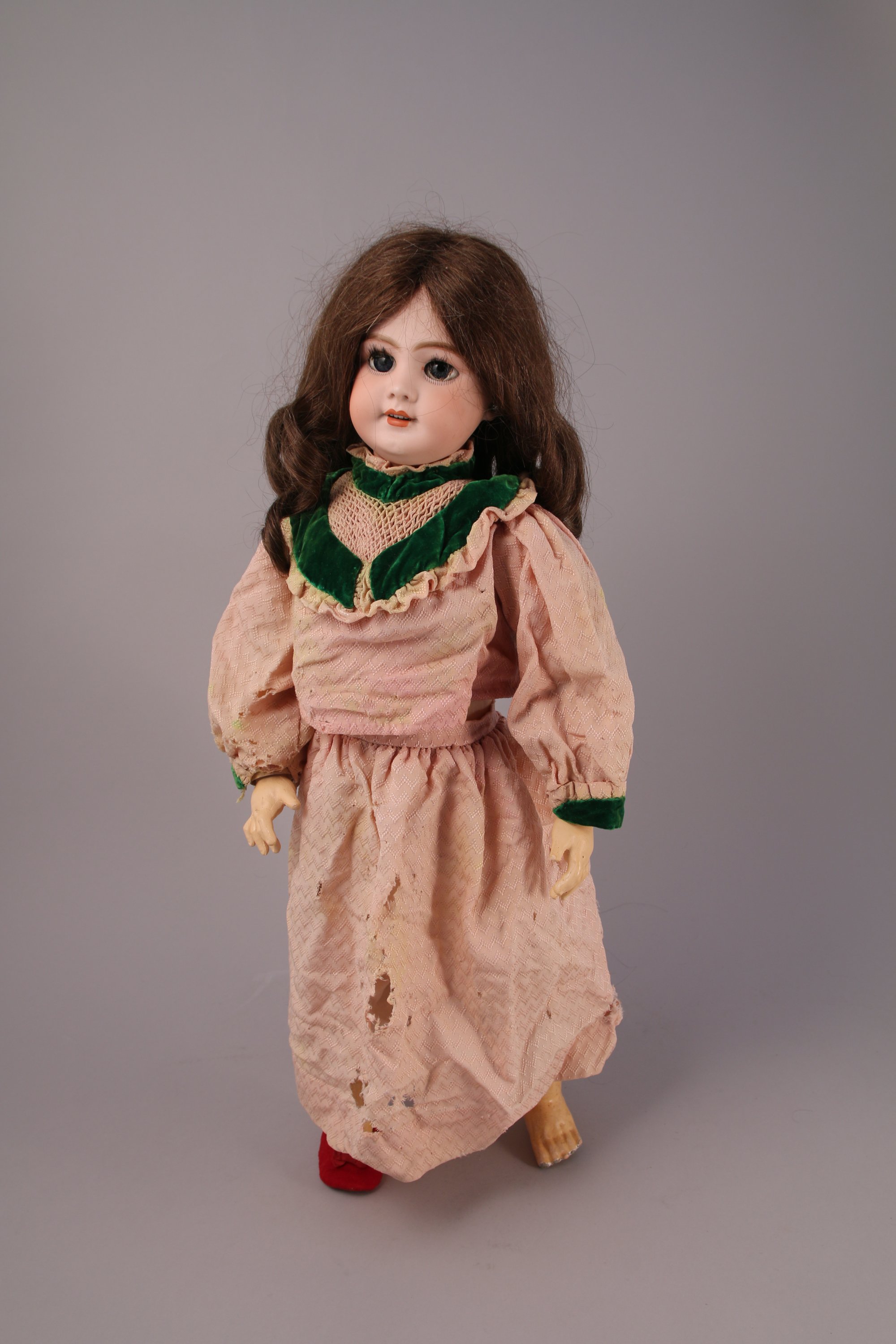 POUPÉE articulée, tête en porcelaine, yeux bleus mobiles en sulfure, bouche ouverte, cheveux châtains, oreilles ornées de boucles d'oreilles. Corps en composition. Vêtue d'un ensemble rose.