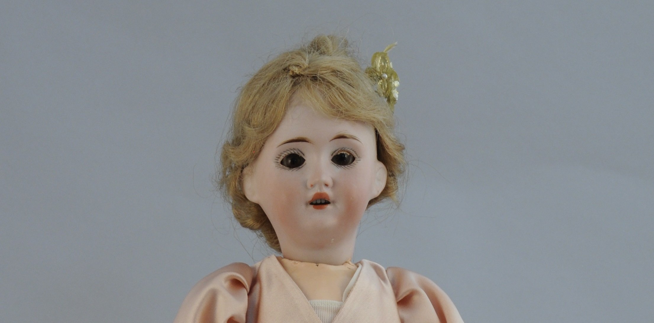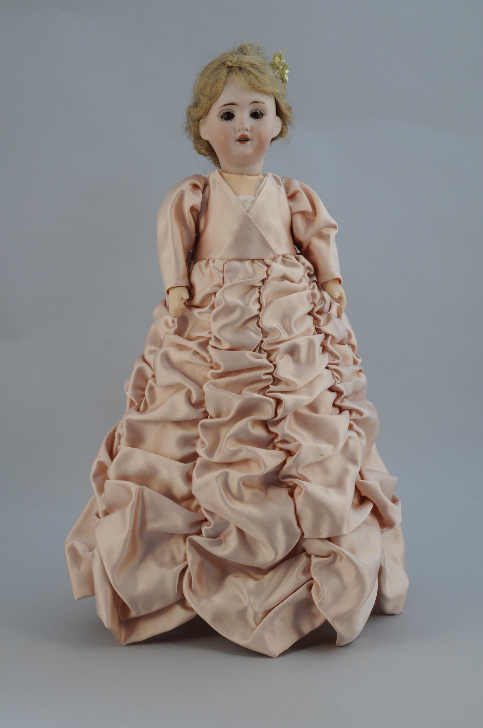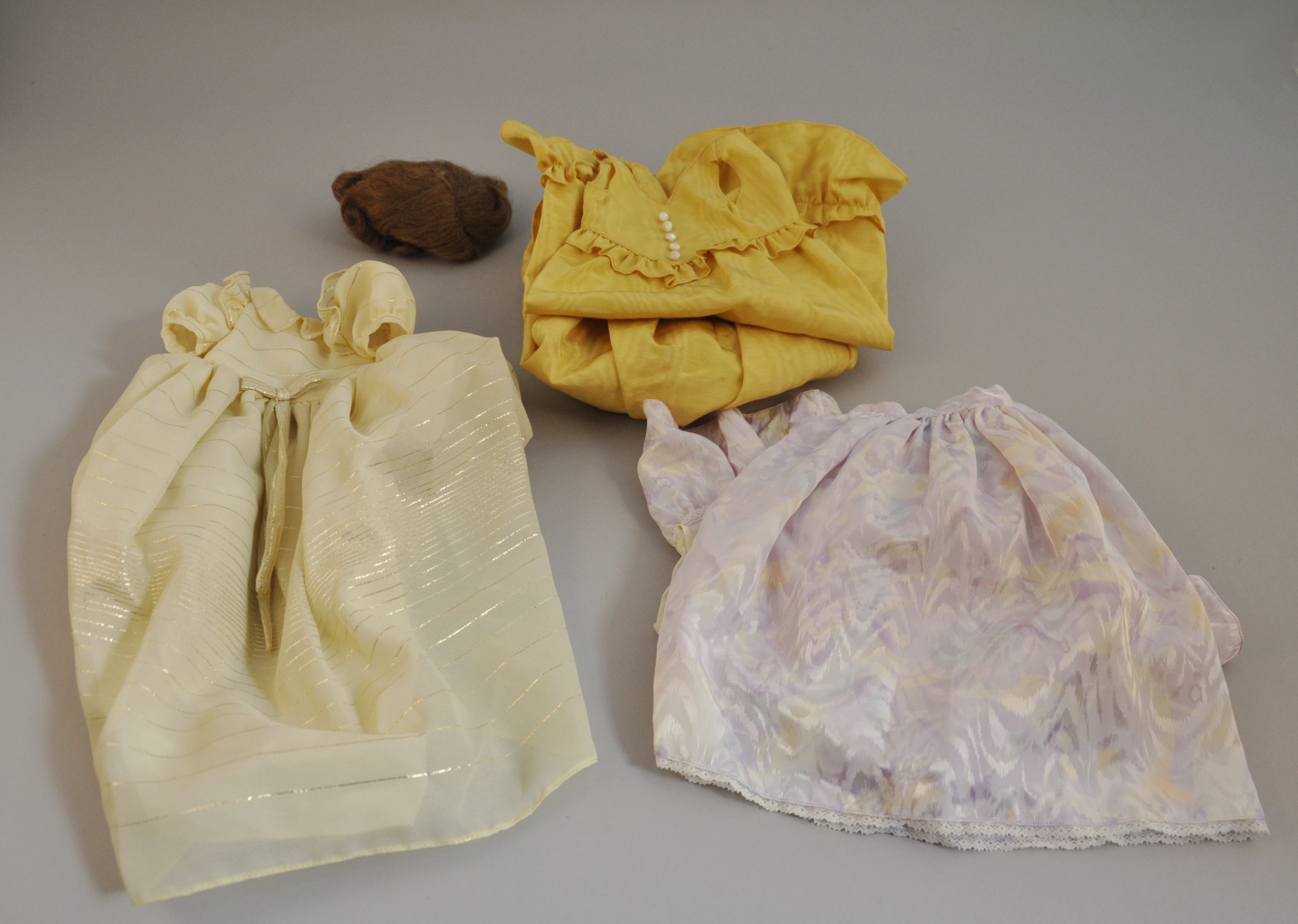 POUPÉE articulée. Tête en porcelaine, yeux marrons ouvrant, bouche ouverte, marquée "+310". Cheveux chatains et seconde perruqu blonde. Corps articulé en carton. Avec un trousseau de quatre robes modernes et un support. XIX-XXe. Haut. 40 cm.