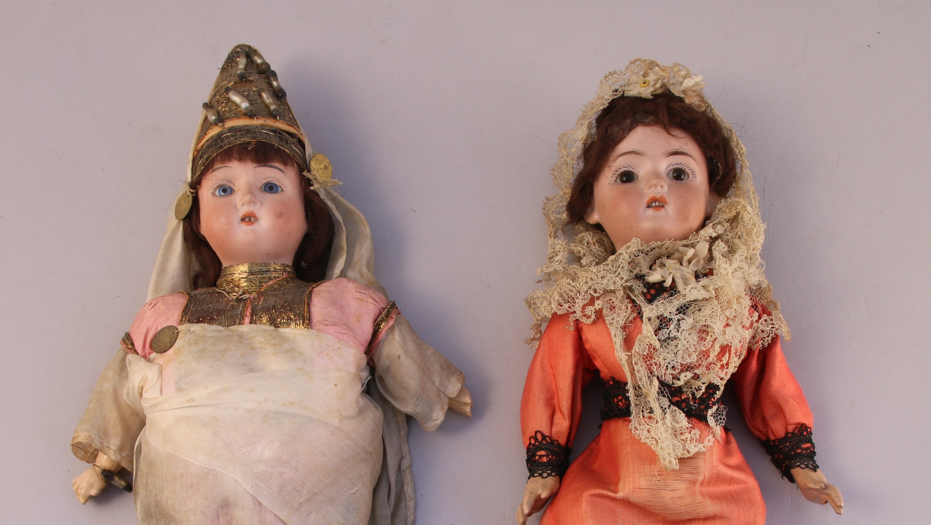 Deux MIGNONETTES figurant une ORIENTALE et une ESPAGNOLE. Les têtes en biscuit moulés et signé JCD à l'ancre de marine, yeux bleux et marron, coiffures chatains. Corps en composition et mains en papier maché (manque une main). Costumes d'époques.