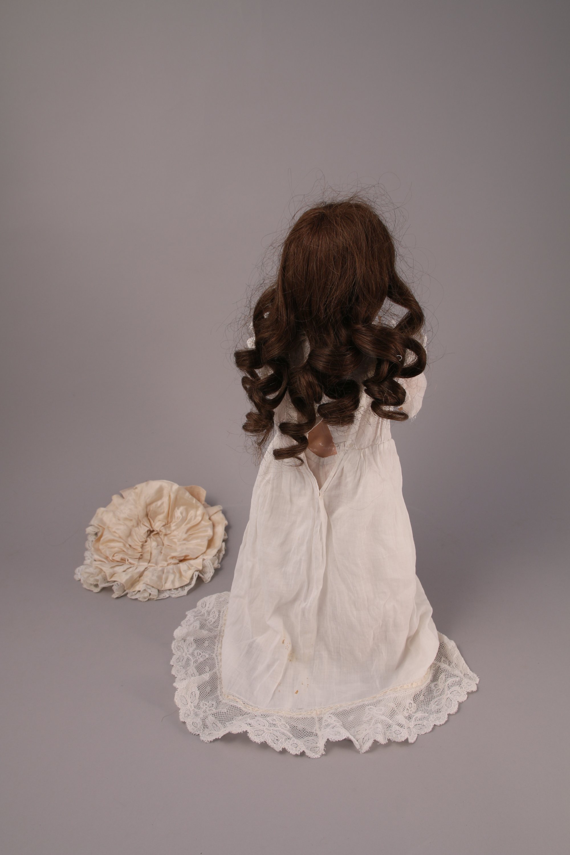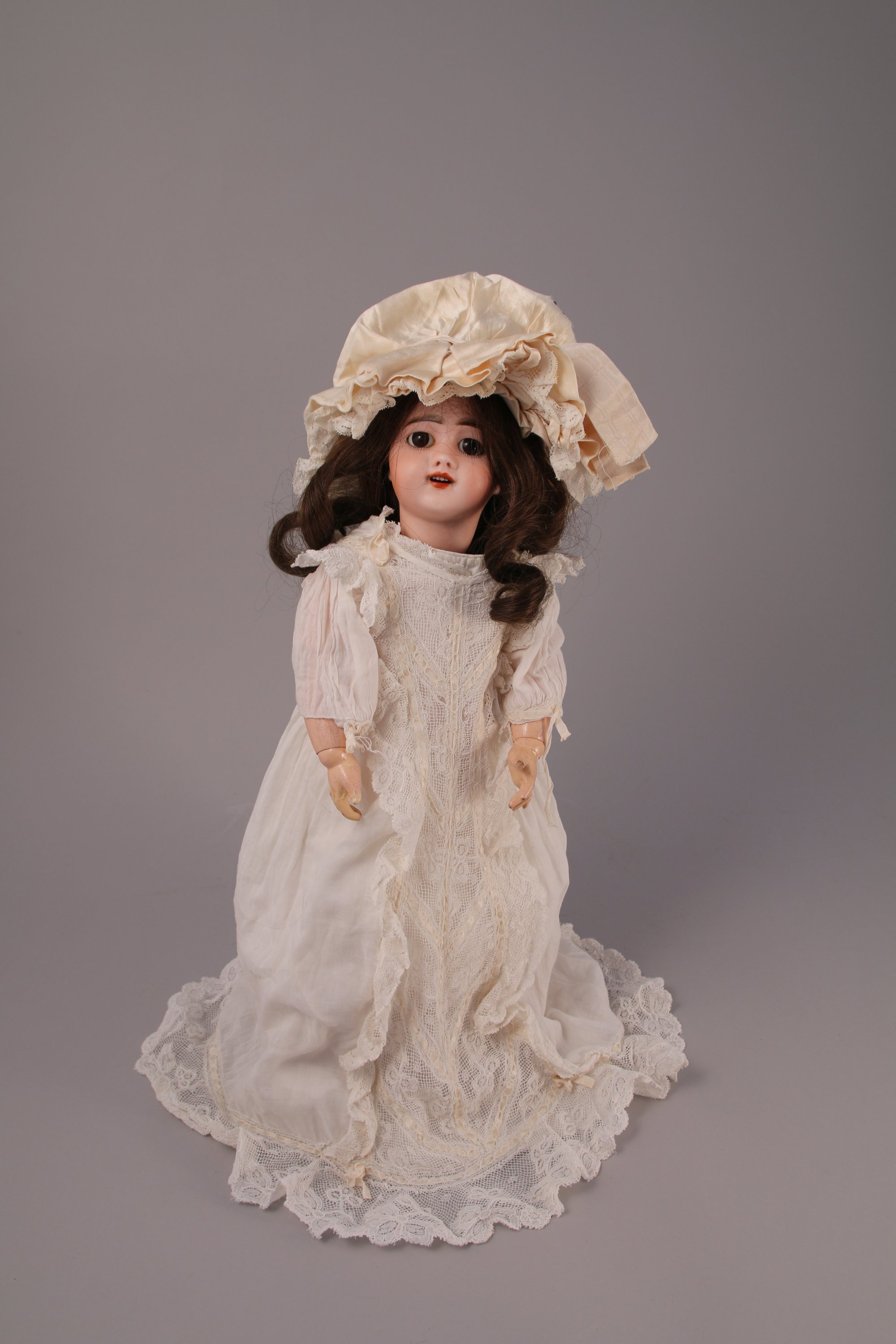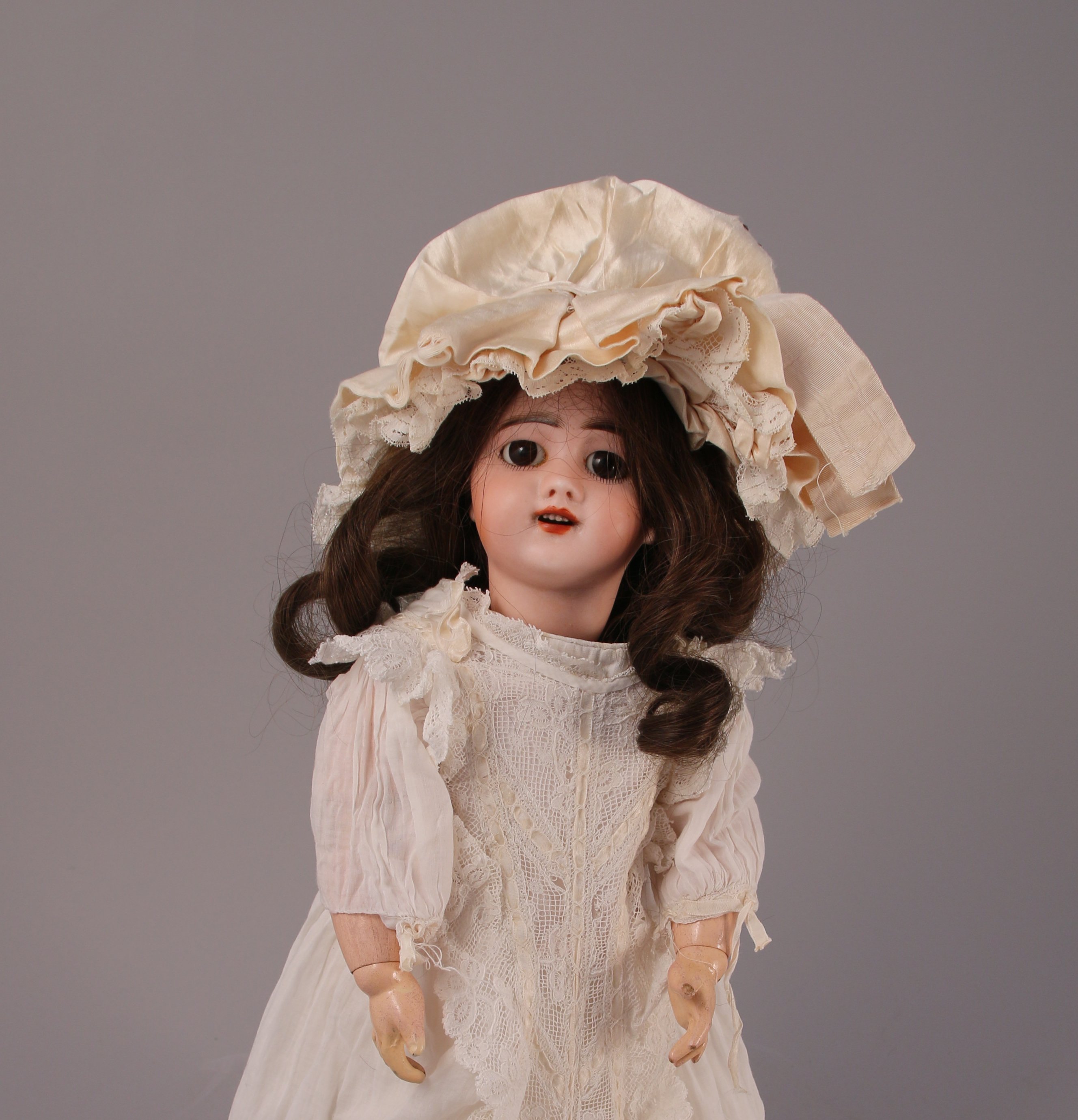JUMEAU. POUPÉE CRIEUSE, tête en porcelaine marquée " SFBJ / 7 ", yeux marrons en sulfure, bouche ouverte, cheveux châtains. Corps en composition, articulé. Vêtue d'une robe en dentelle blanche et coiffée d'un chapeau. La poupée crie à l'aide de deux cordelettes.